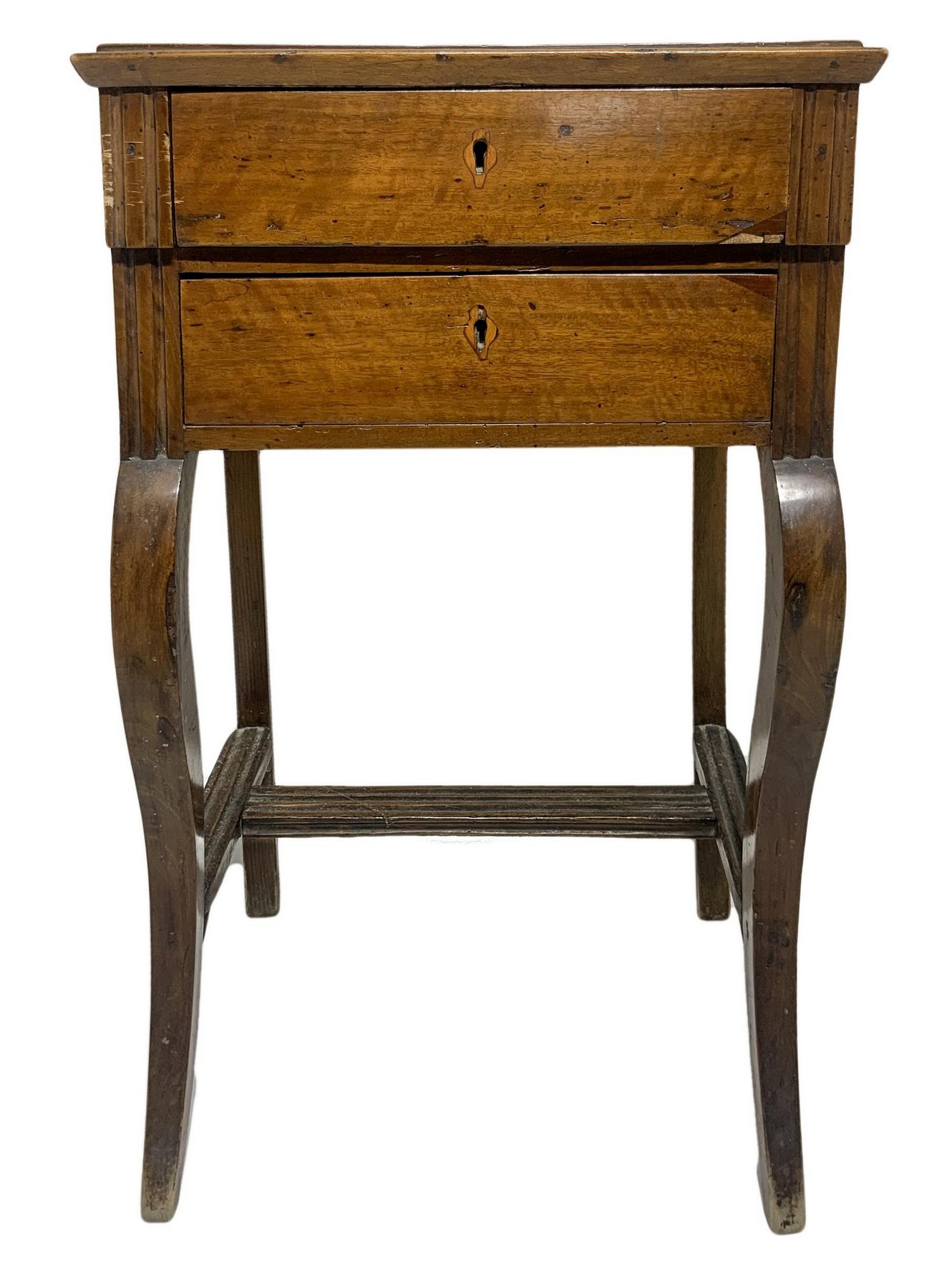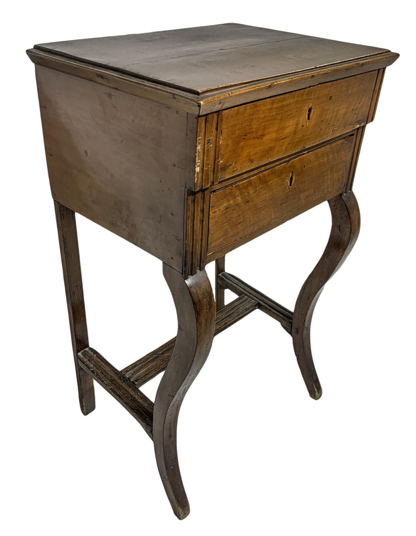 Comodino a due cassetti, Sicilia, XIX secolo. In legno di noce con piedi a sciabola . H cm 90 x56x40