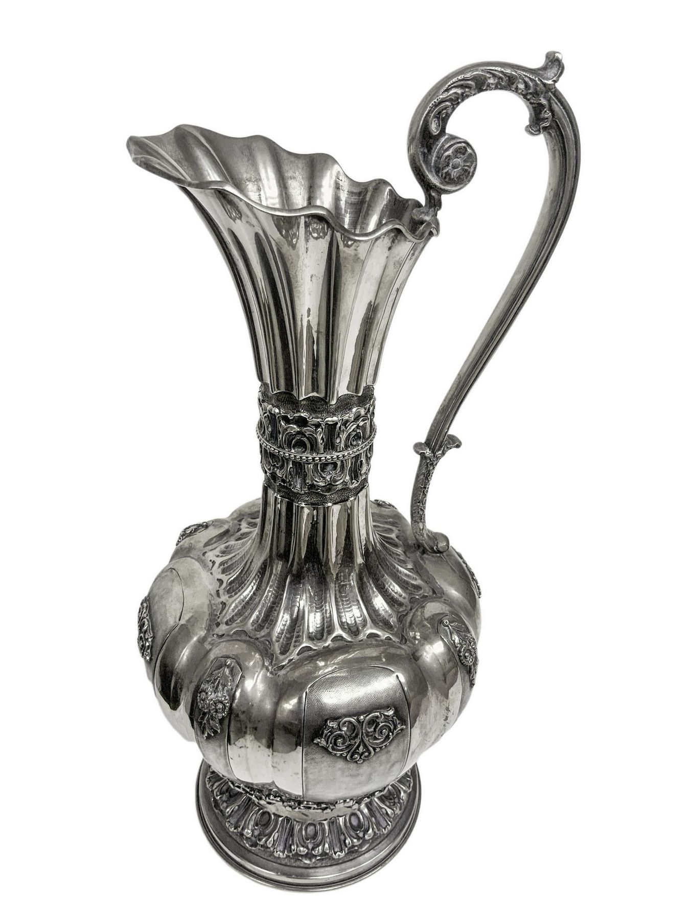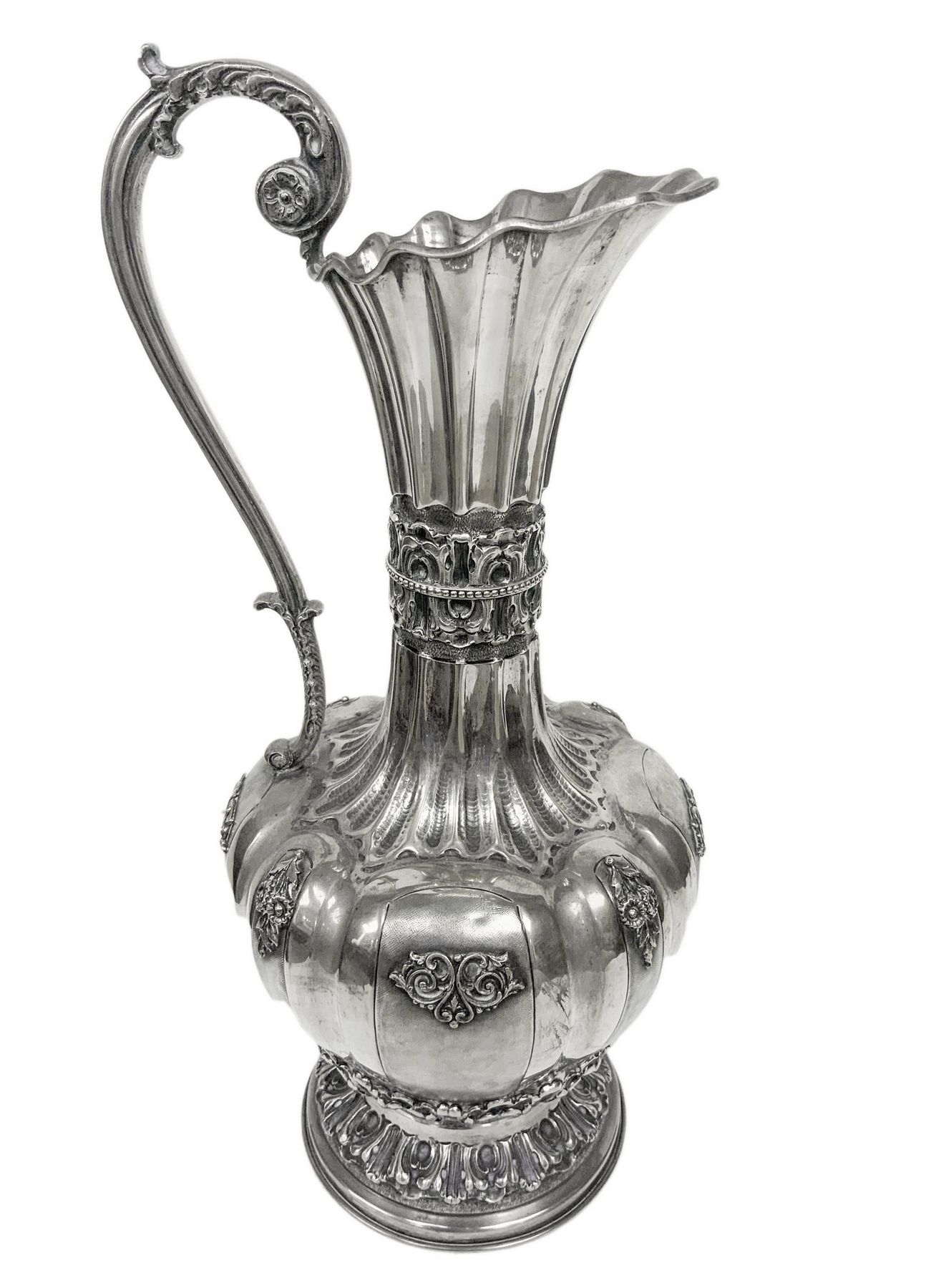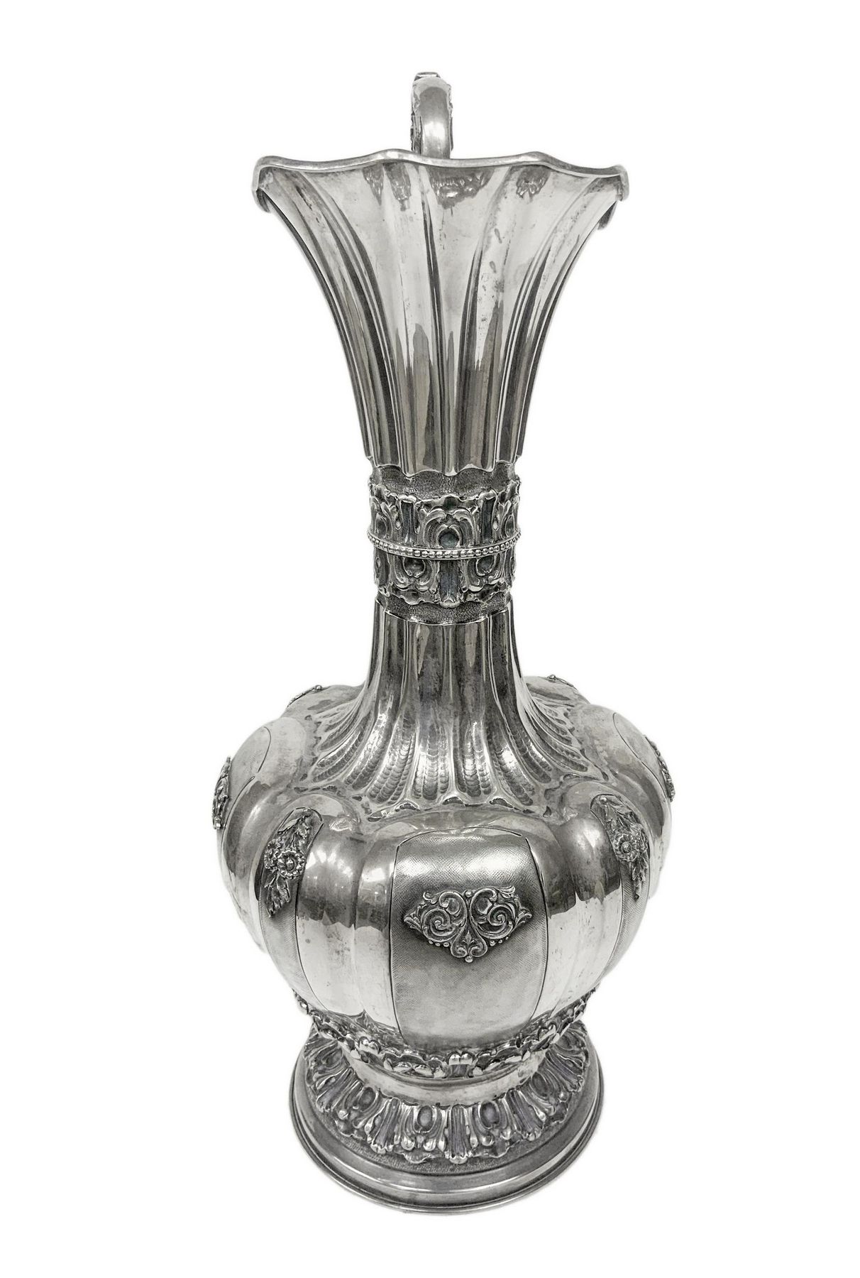 Importante anfora in argento, inizi XX secolo.Con manico, corpo lobato e sbalzato. H cm 41. Kg 1.474.