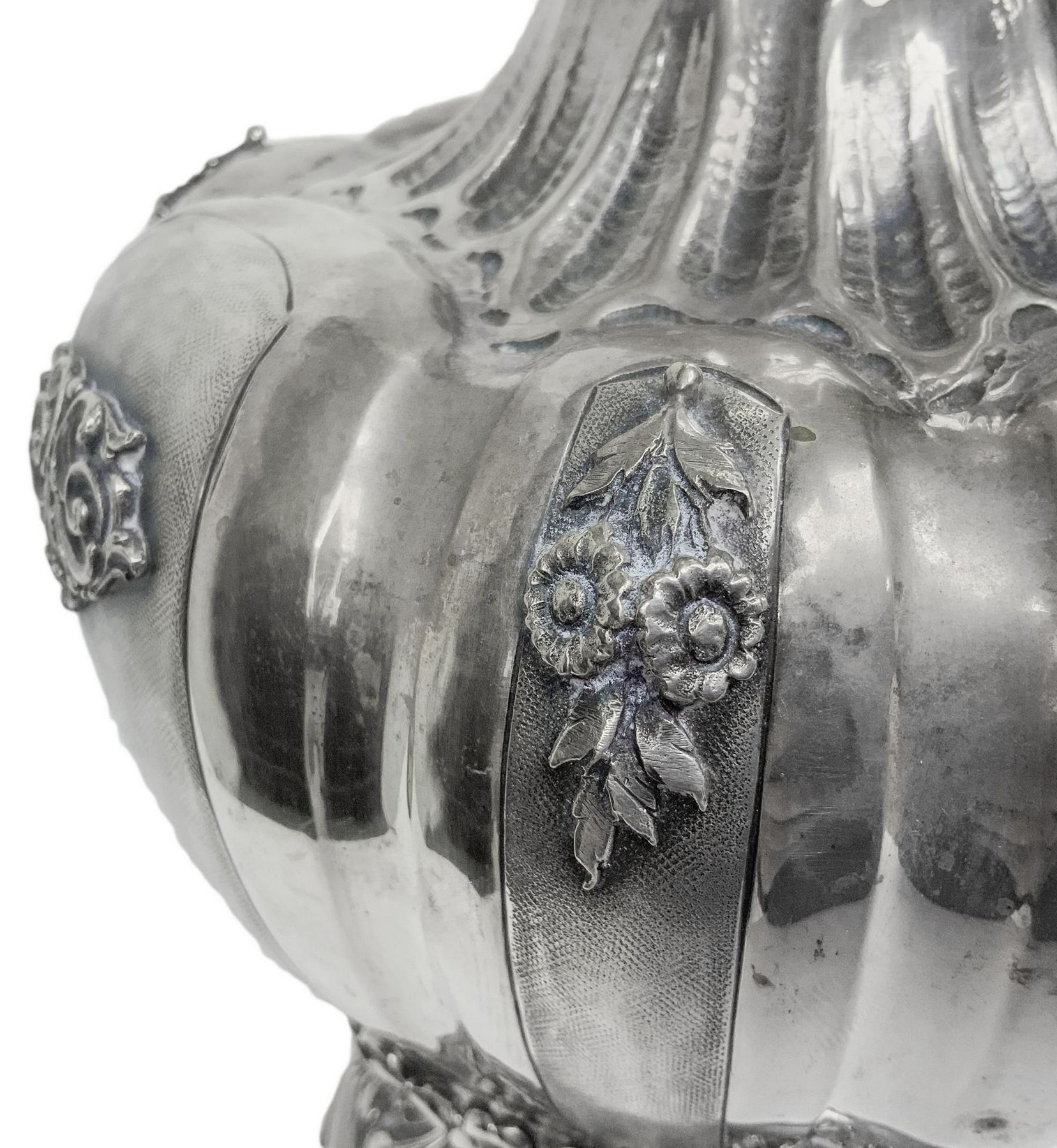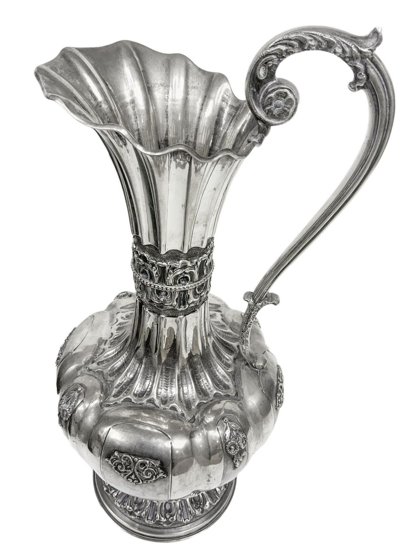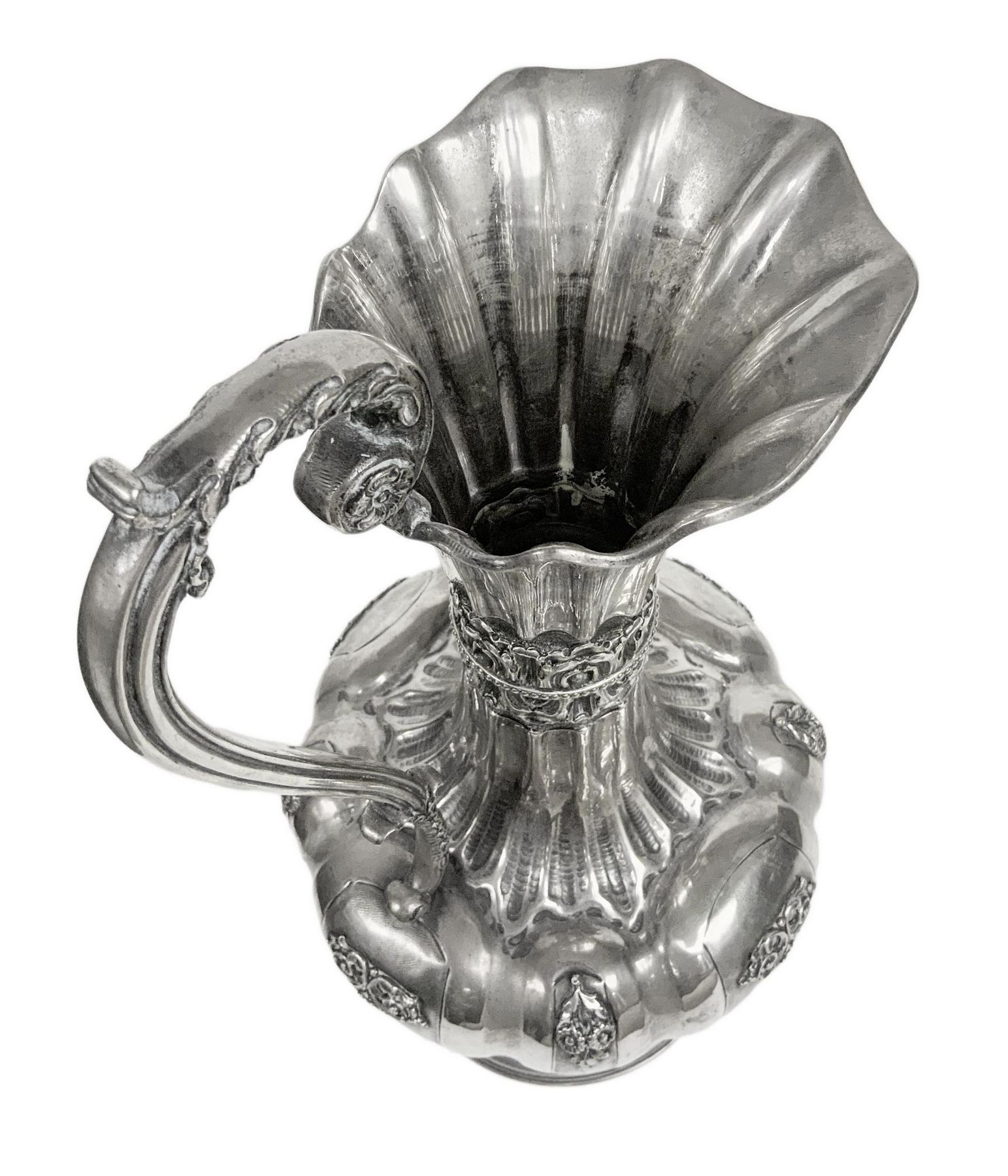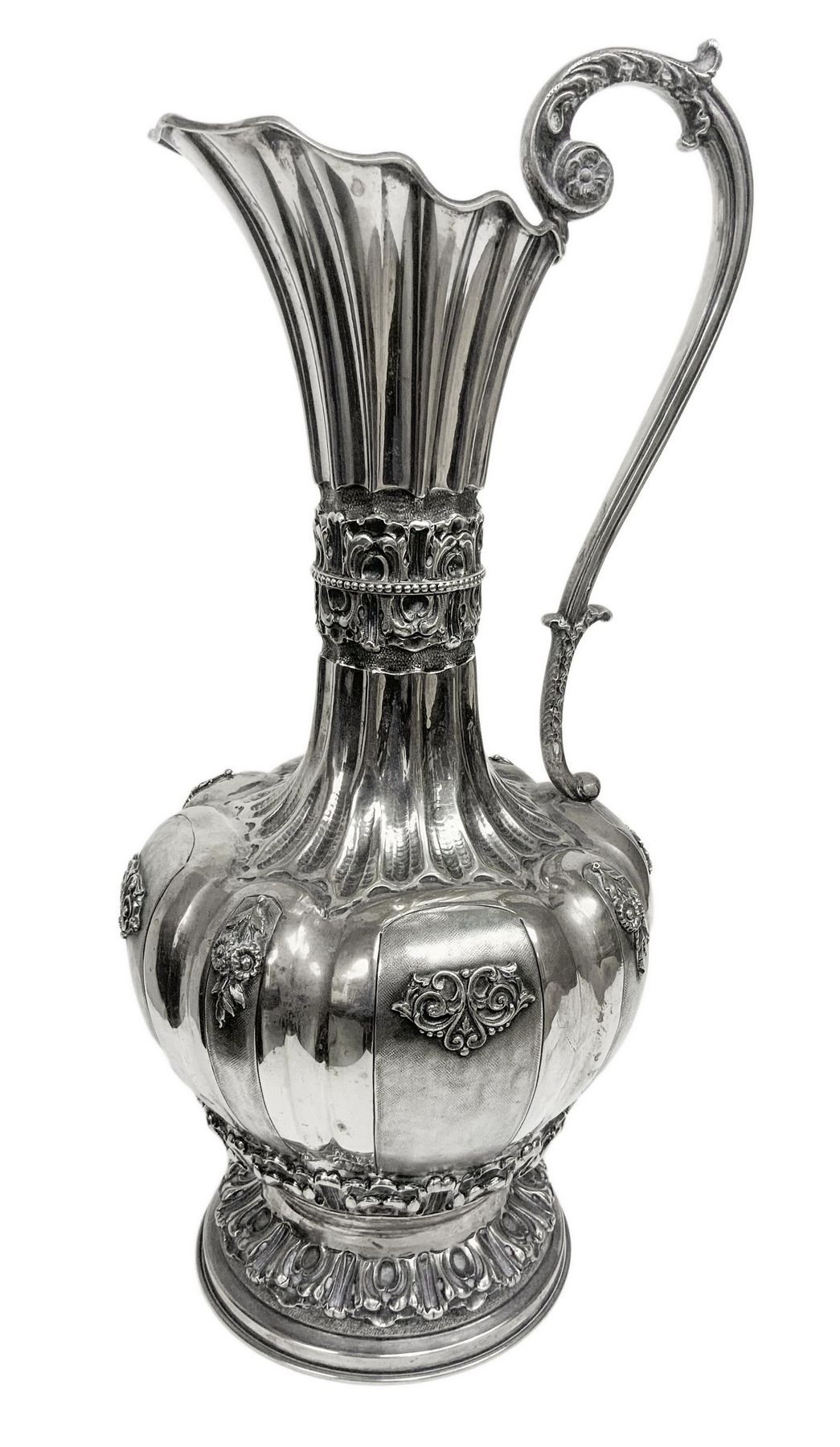 Importante anfora in argento, inizi XX secolo.Con manico, corpo lobato e sbalzato. H cm 41. Kg 1.474.