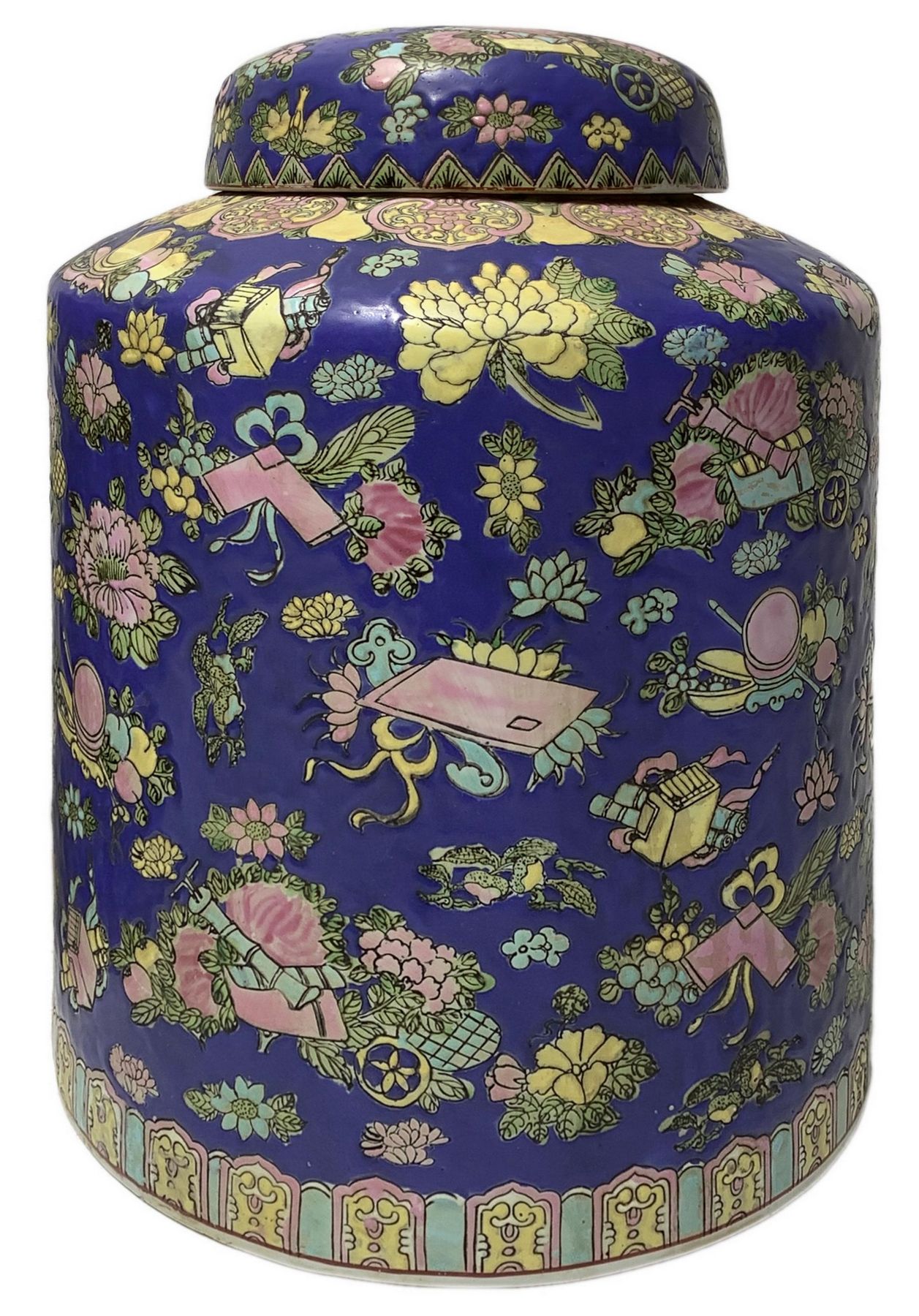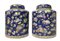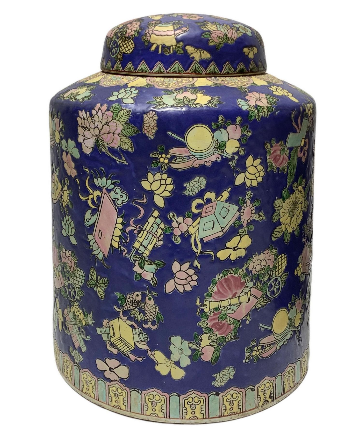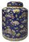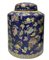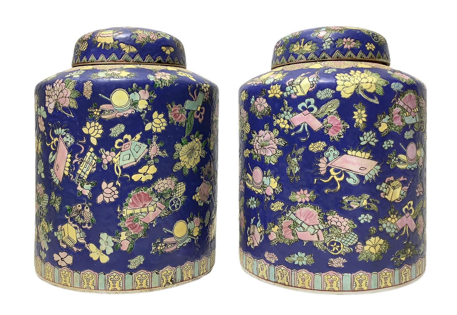 Coppia di potiche cinesi con decori floreali su fondo blu, XX secolo, H cm 37, base diametro cm 27