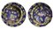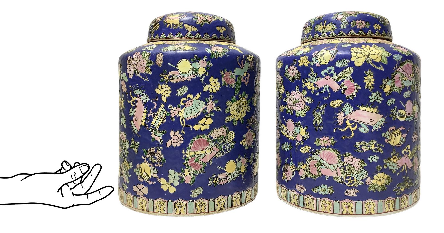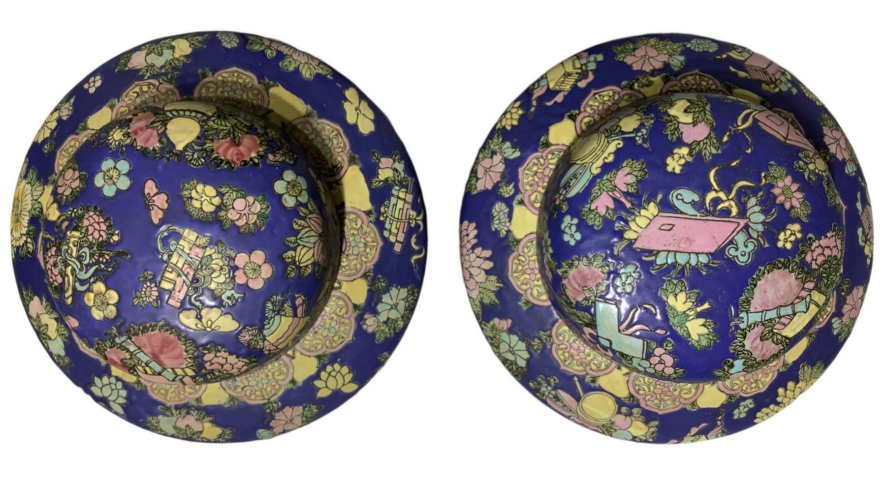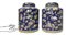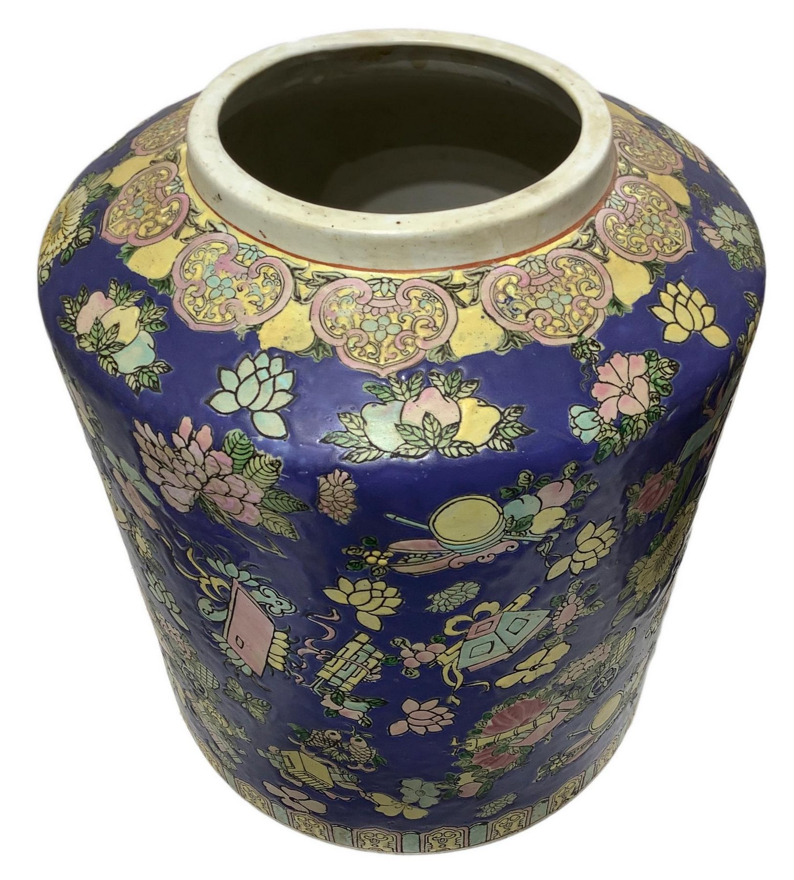 Coppia di potiche cinesi con decori floreali su fondo blu, XX secolo, H cm 37, base diametro cm 27