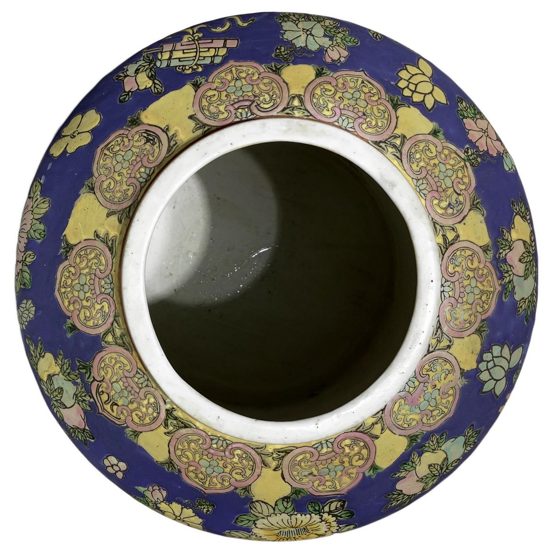 Coppia di potiche cinesi con decori floreali su fondo blu, XX secolo, H cm...