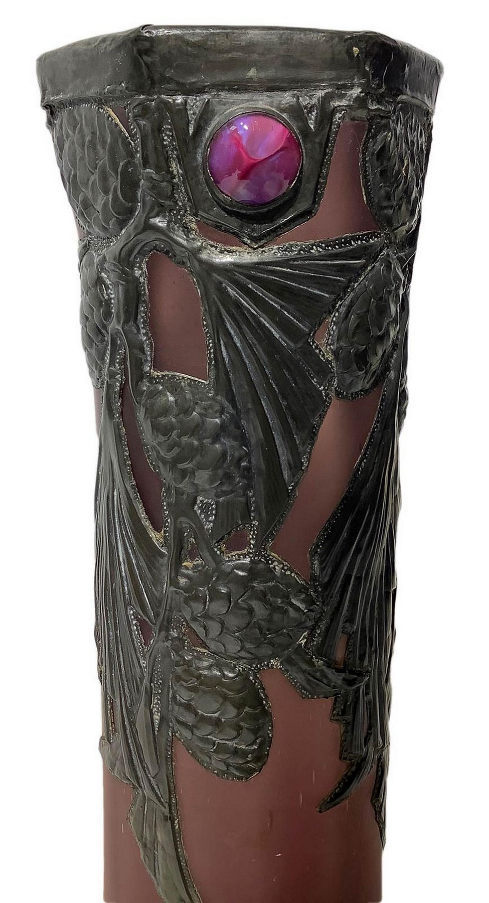 Vaso in vetro ametista con decorazioni liberty, inizi XX secolo. H cm 41.