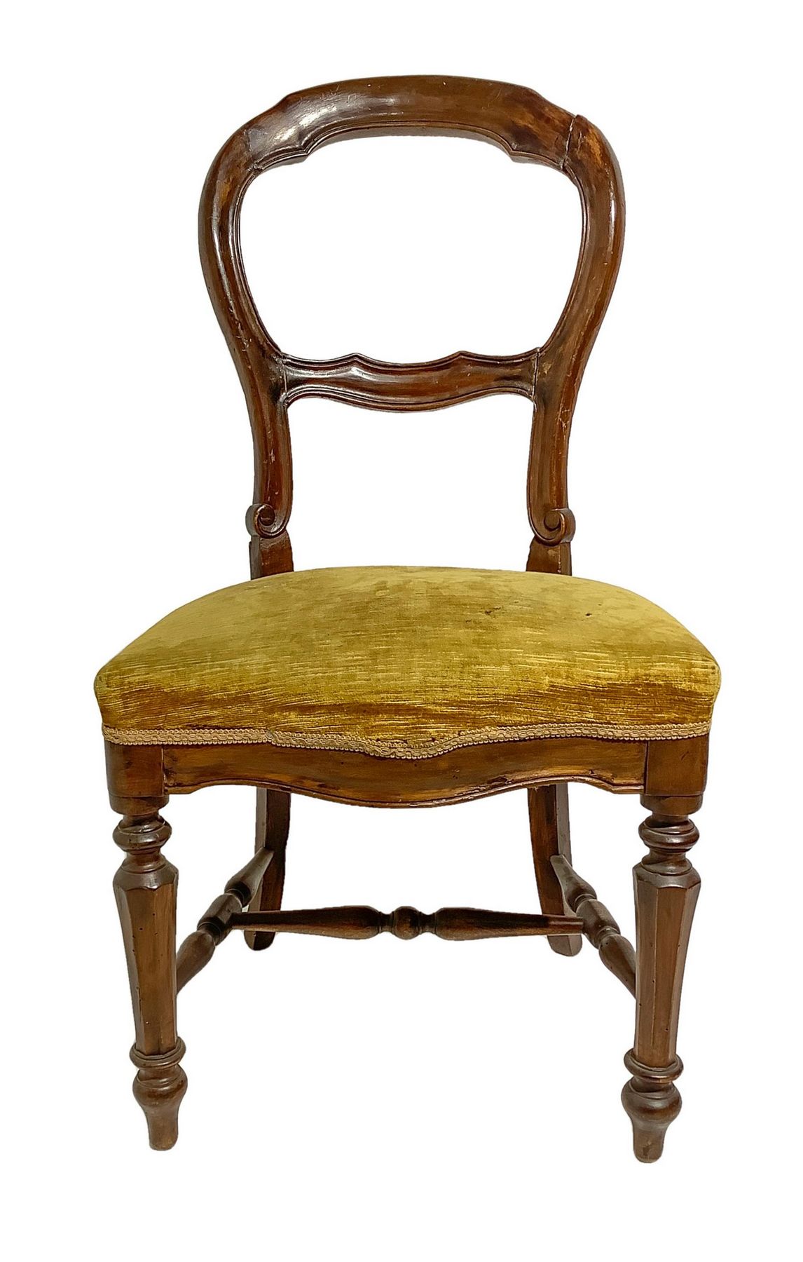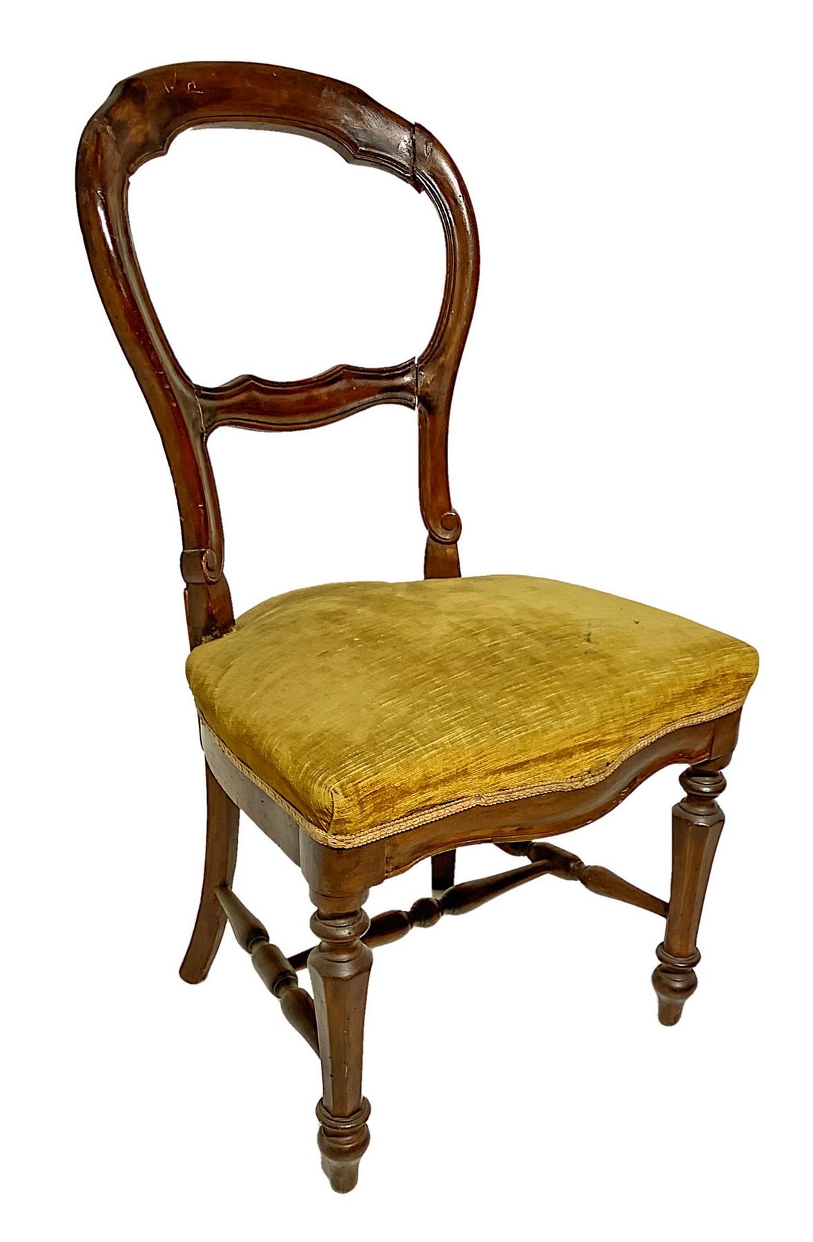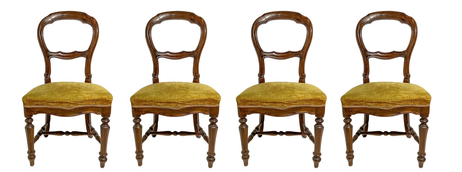 Quattro sedie in legno di i noce, fine XIX secolo. Rottura in una spalliera, incollata. H cm 87. Seduta h cm 42.