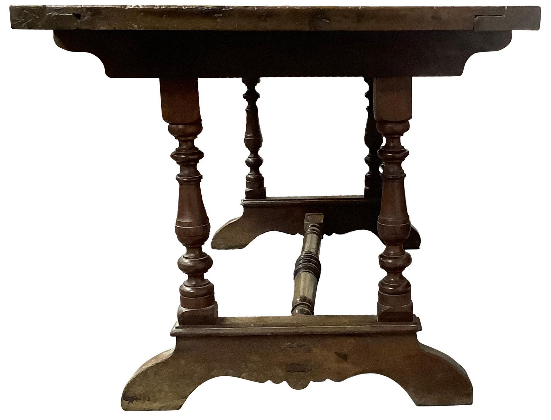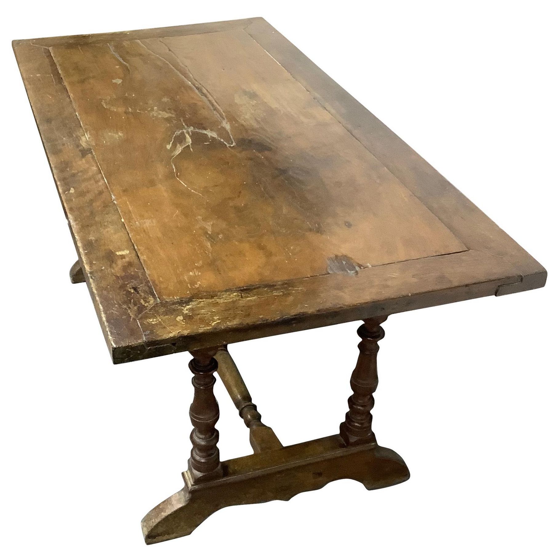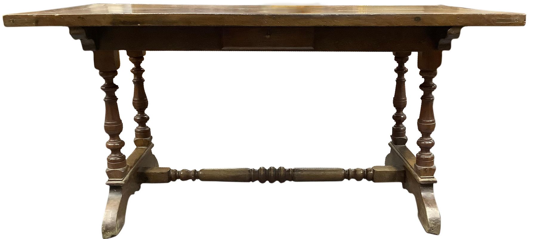 Tavolo - fratino in legno di noce, fine XVII secolo. Quattro gambe a rocchetta con legaccio centrale. Piccolo cassetto centrale sotto piano. H Cm 73X148x76