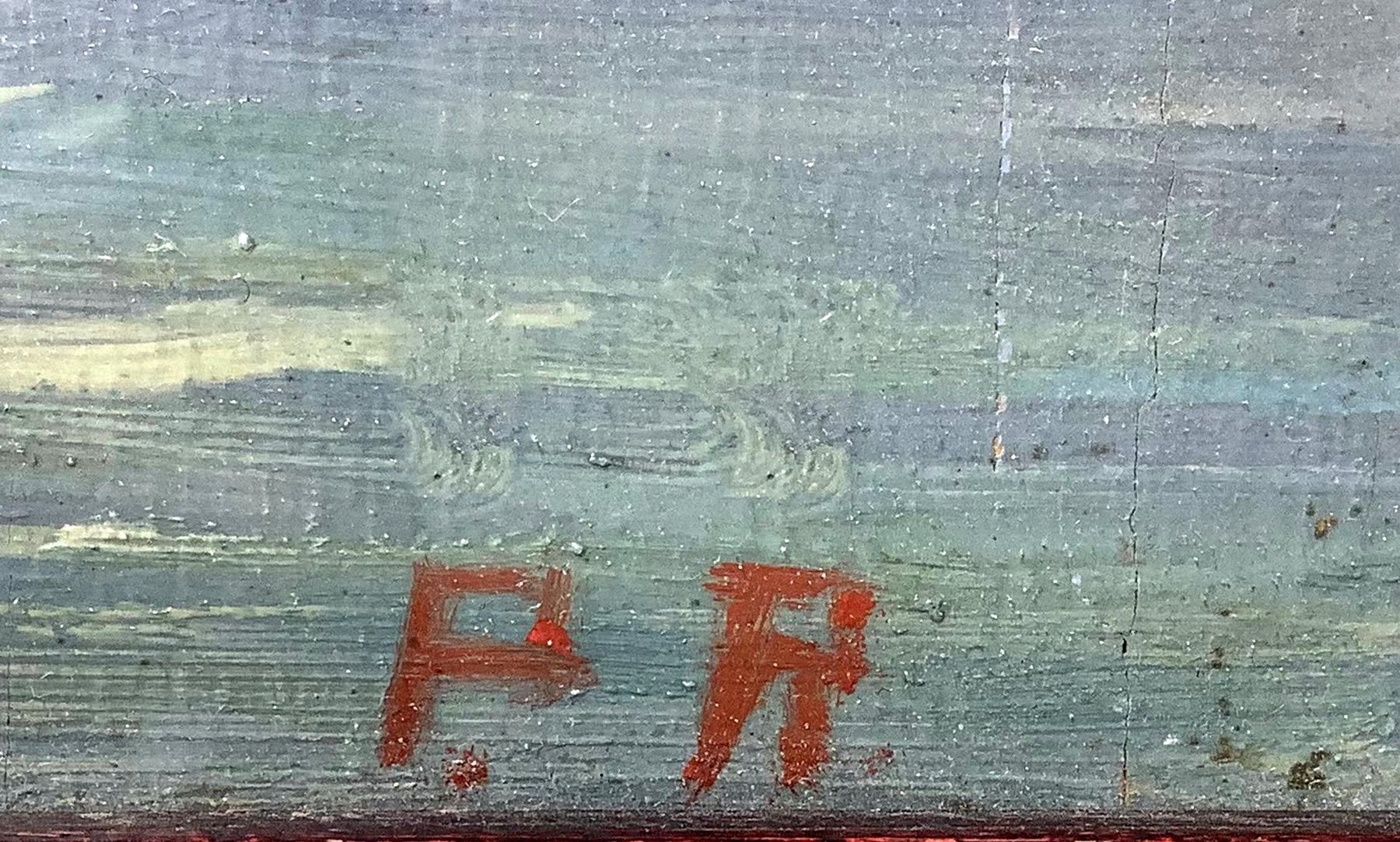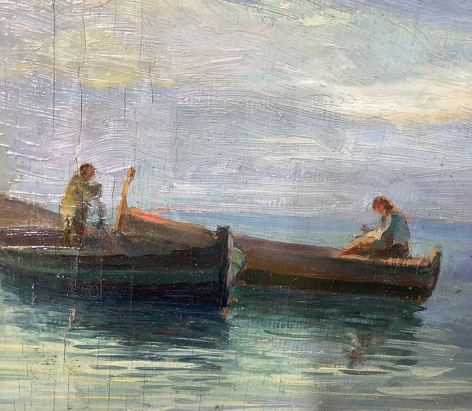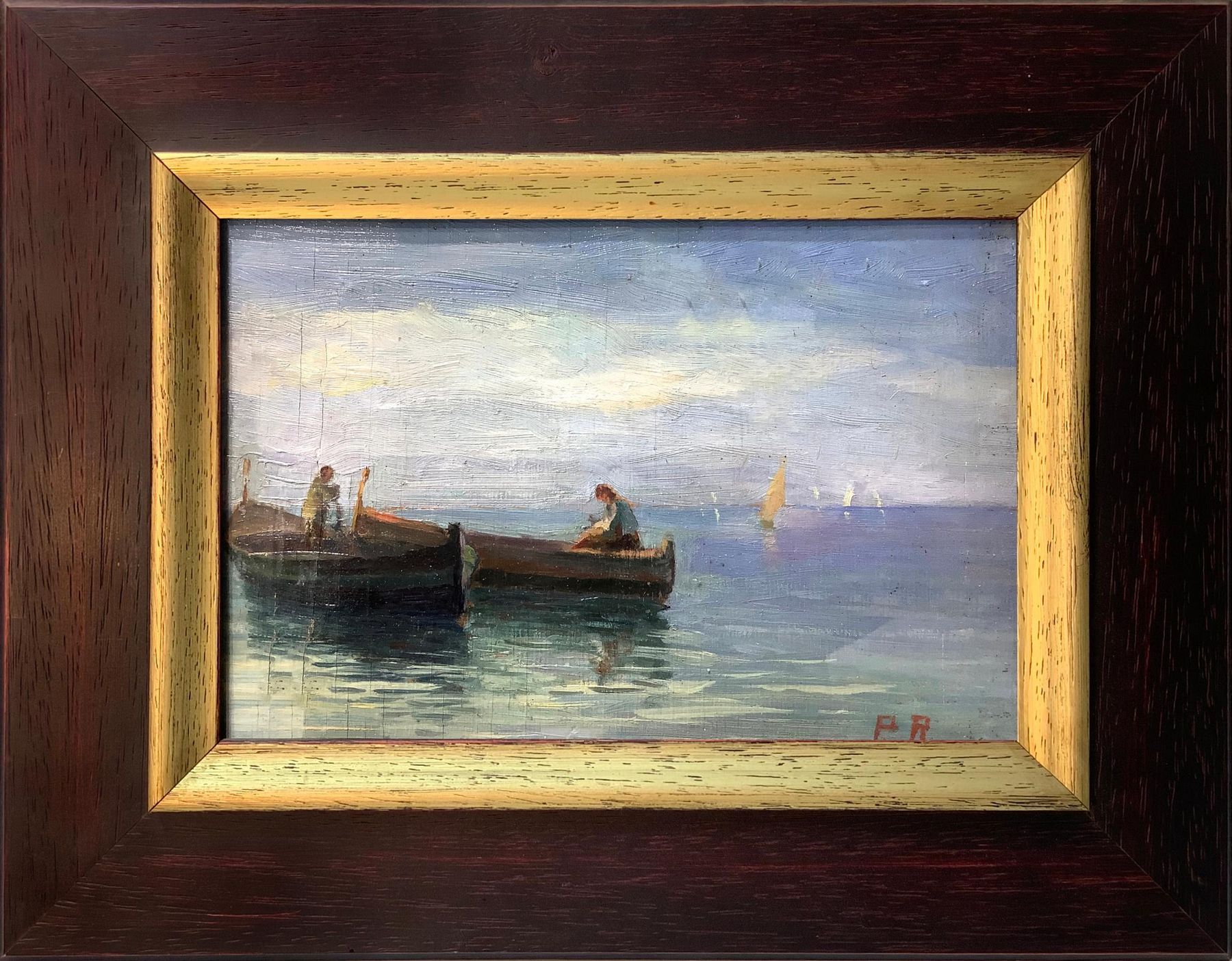 Lot 442 | Olio su tela applicata a tavola raffigurante marina con barche, XX secolo. Cm...