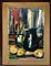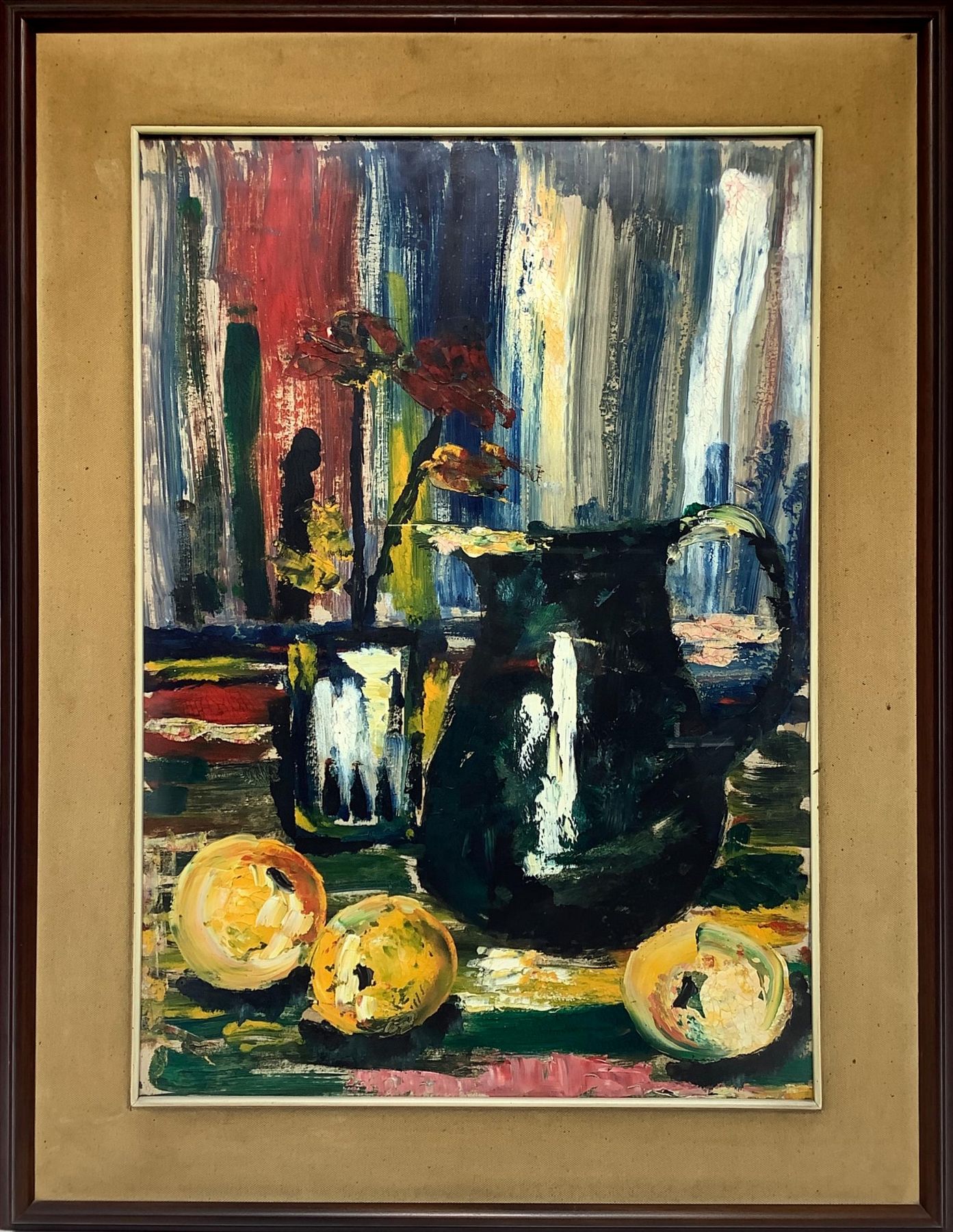 Olio su cartoncino raffigurante natura morta con mele e boccale, XX secolo. Attribuito Arcangeli. Cm 67x46, in cornice cm 82x63.