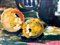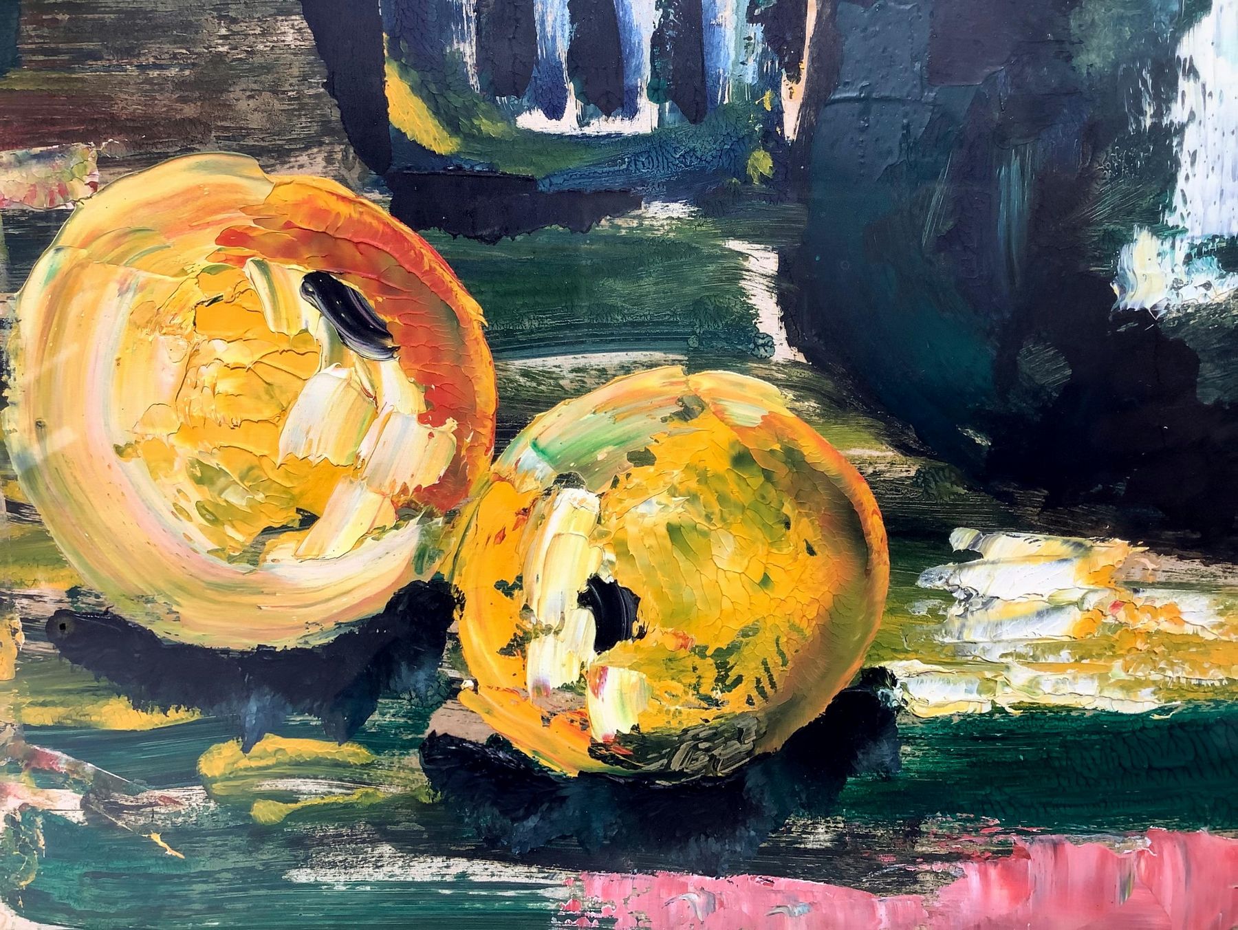 Olio su cartoncino raffigurante natura morta con mele e boccale, XX secolo....