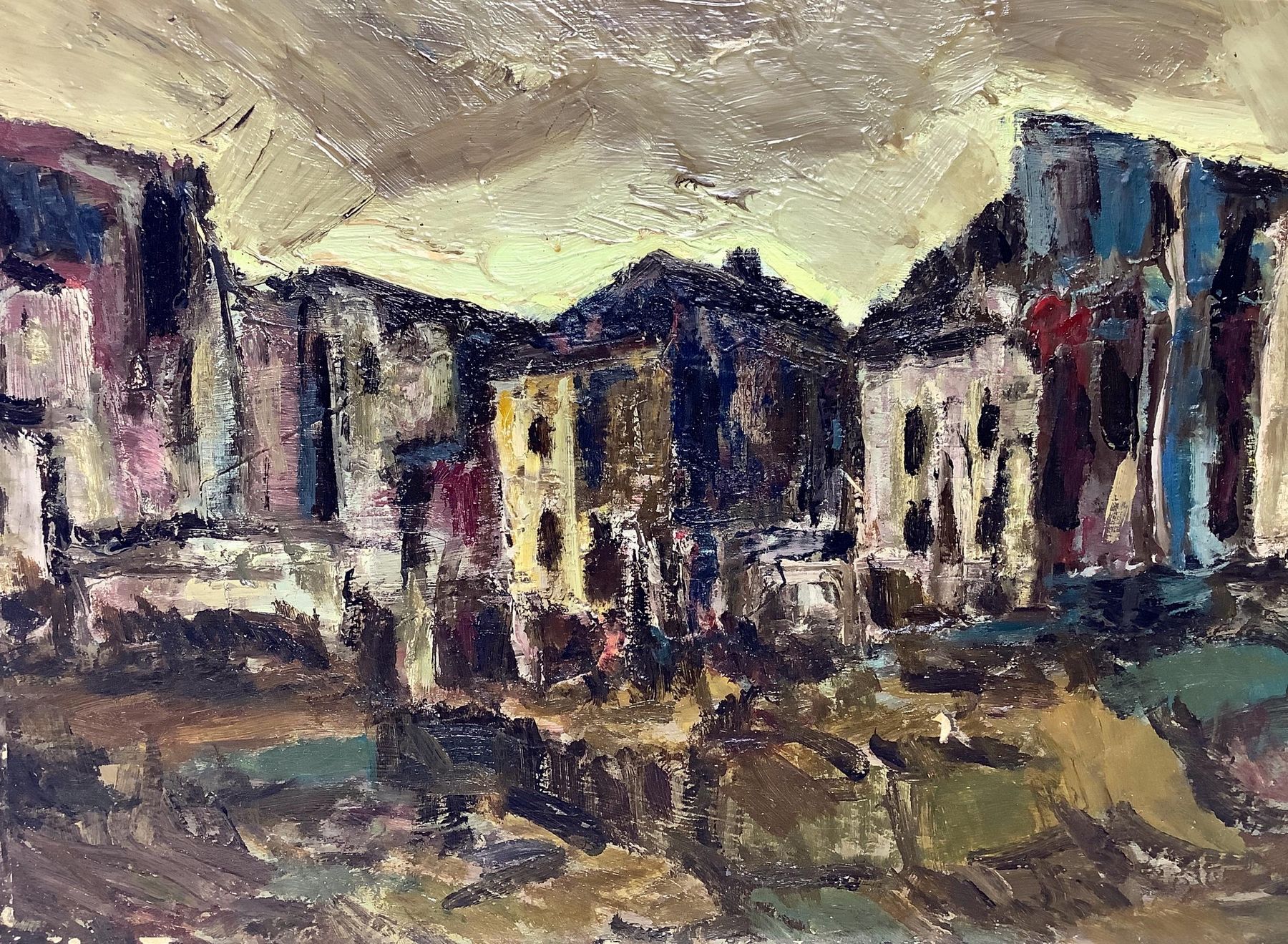 Olio su tavola raffigurante paesaggio con case, Nino Raciti (Catania, 1939)....