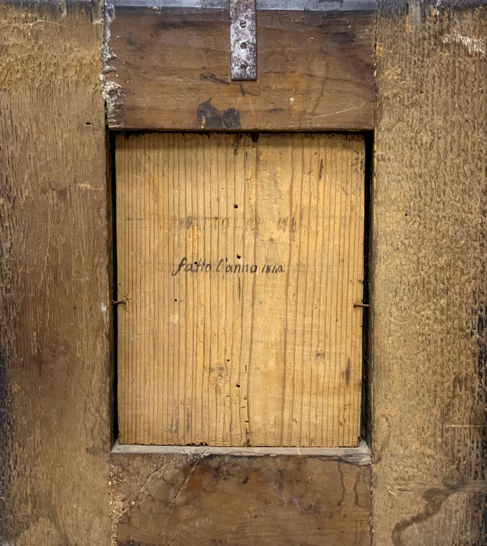 Dipinto ad olio su metallo raffigurante monaco con libro, Italia XIX secolo. Cornice a guilloche. Cm 23x19. Sul retro data 1849.