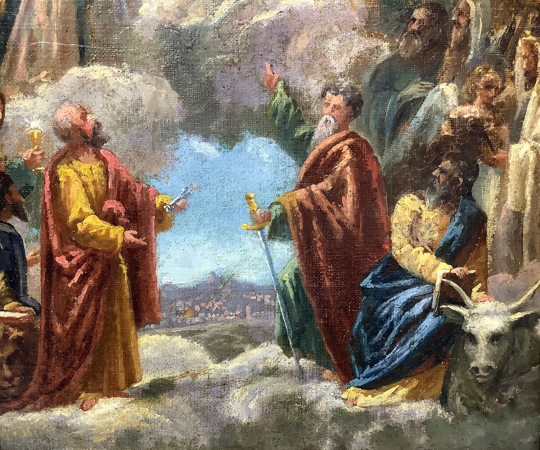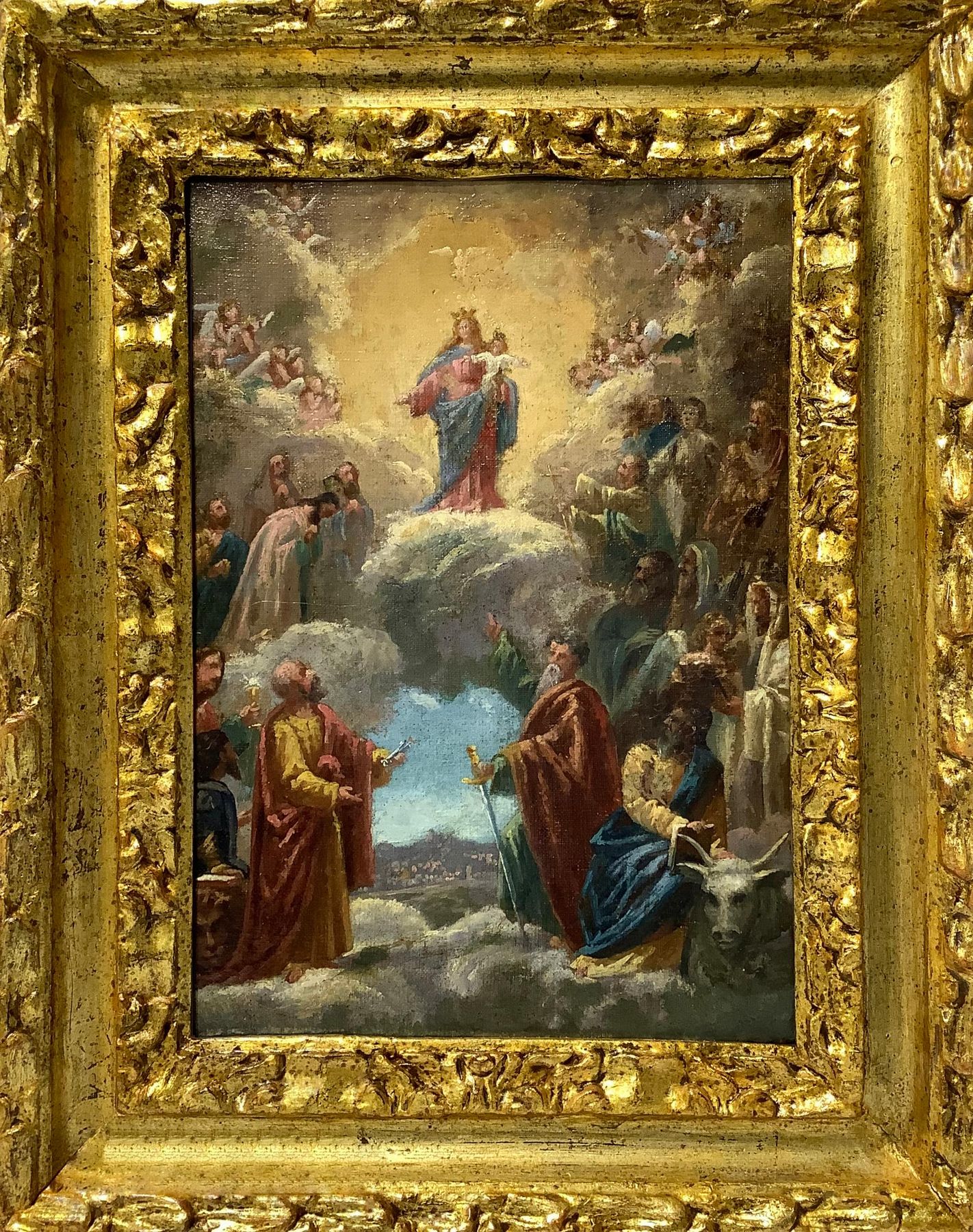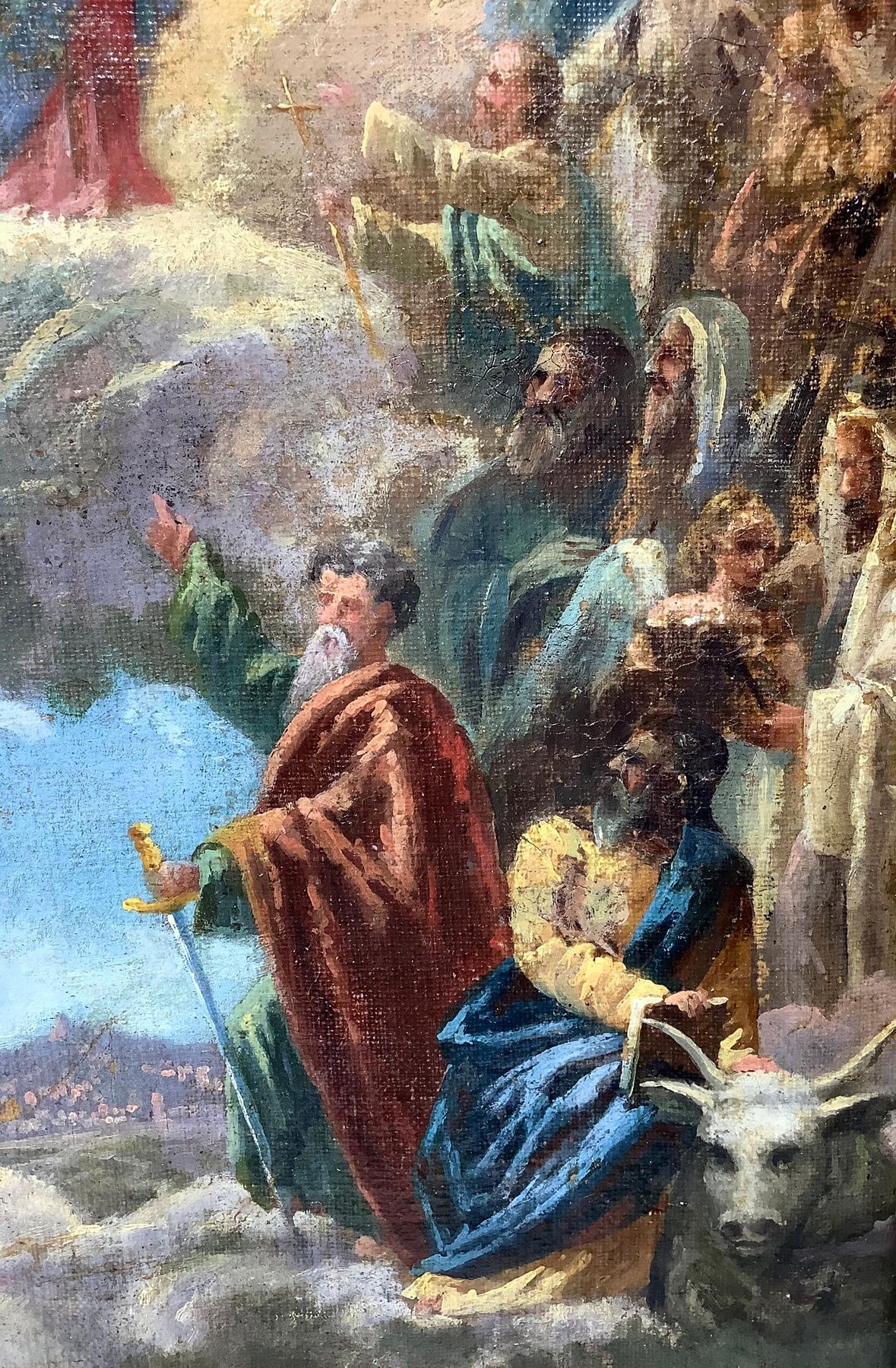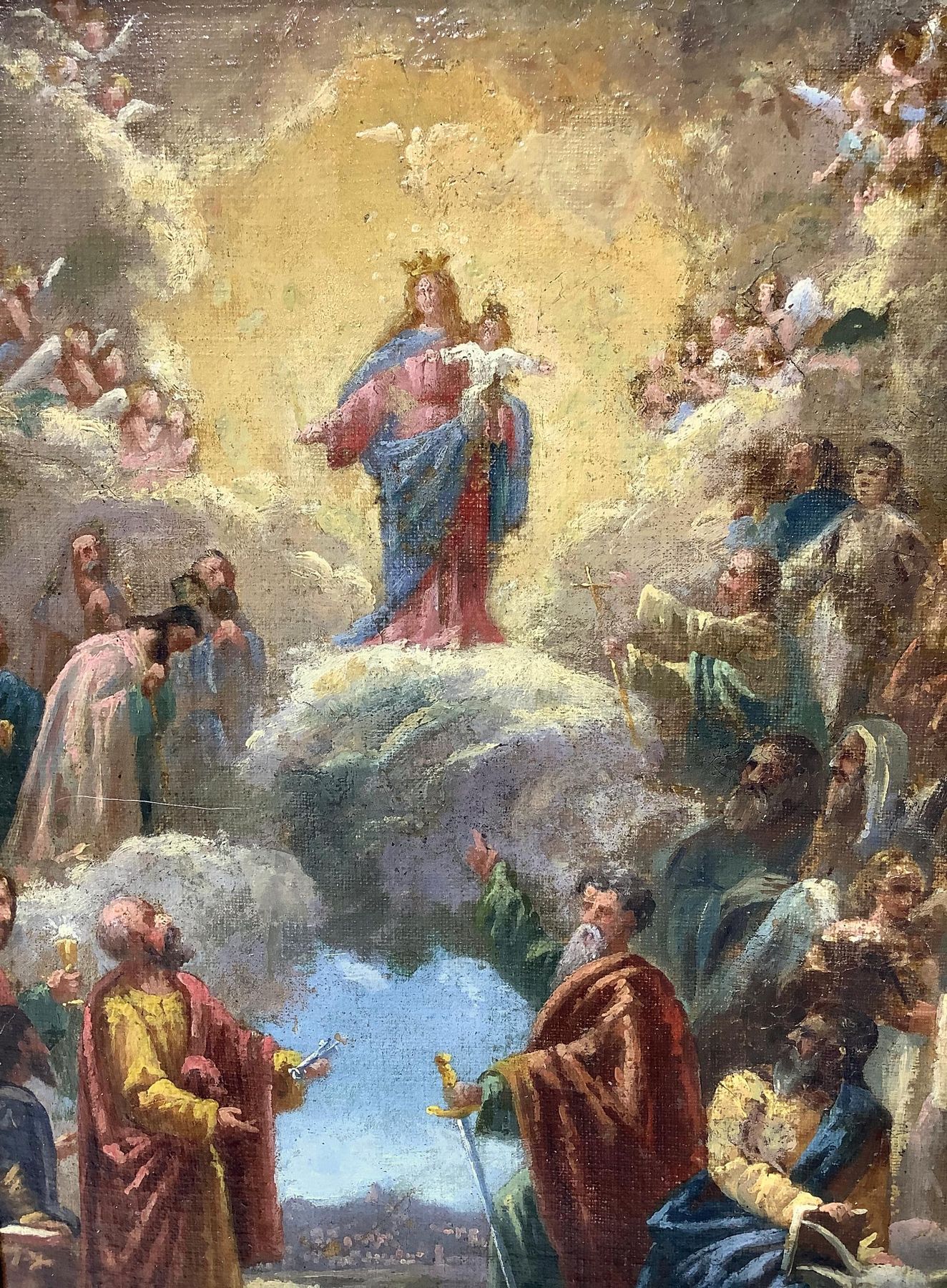 Dipinto ad olio su tela raffigurante celebrazione della Madonna in Cielo tra...