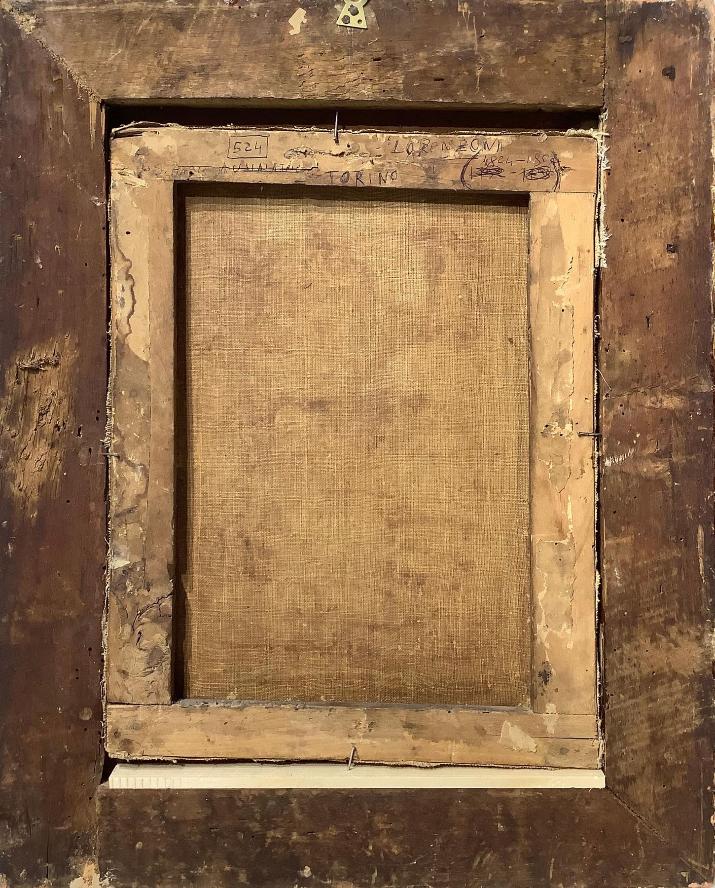 Dipinto ad olio su tela raffigurante celebrazione della Madonna in Cielo tra gli Angeli e i Santi, Tommaso Andrea Lorenzone (Pancalieri, 1824 – Torino, 1902). Bozzetto della pala che sita sull’Altare maggiore della Chiesa Santa Maria Ausiliatrice di Torino. Cm 42x32. In cornice di legno scolpito dorato 58x46.