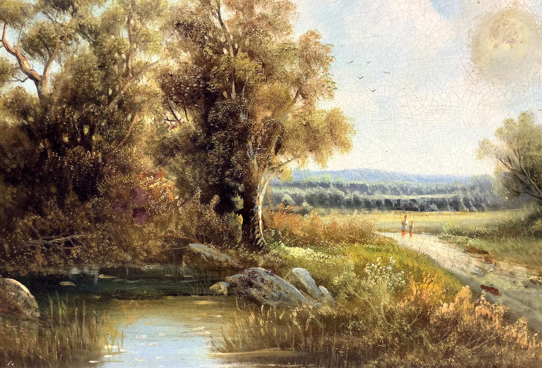 Dipinto ad olio su tela raffigurante paesaggio fluviale con personaggi. Cm 52x79,5. In cornice 64x91.