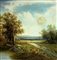 Dipinto ad olio su tela raffigurante paesaggio fluviale con personaggi. Cm...