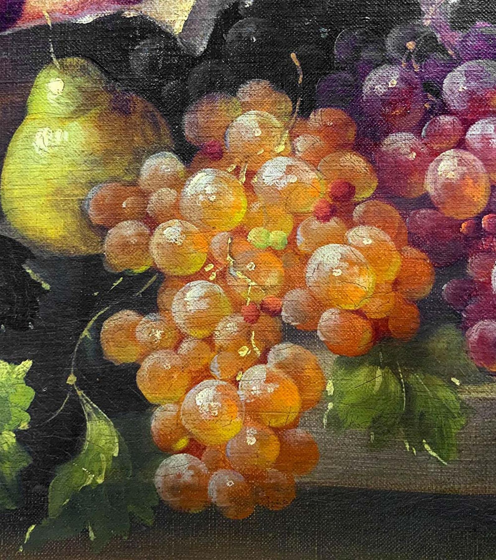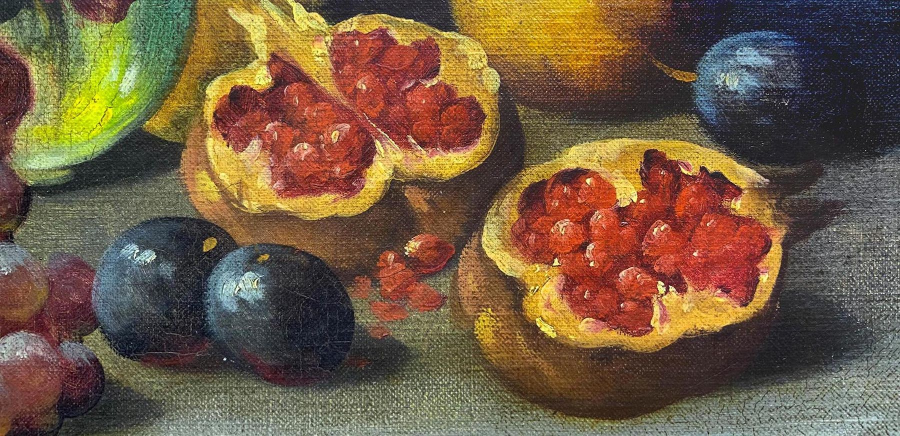 Dipinto ad olio su tela raffigurante natura morta di frutta e fiori, XX secolo. Cm 52x78,5 olio su tela. Firmato in basso a destra