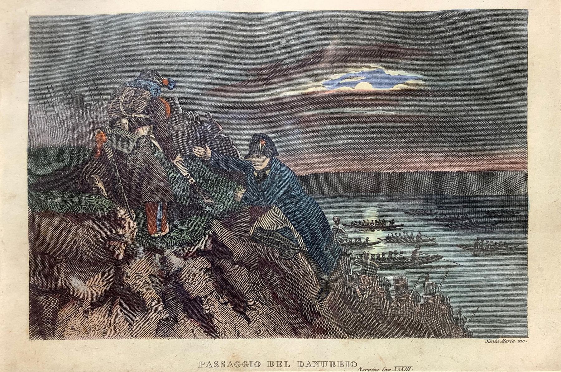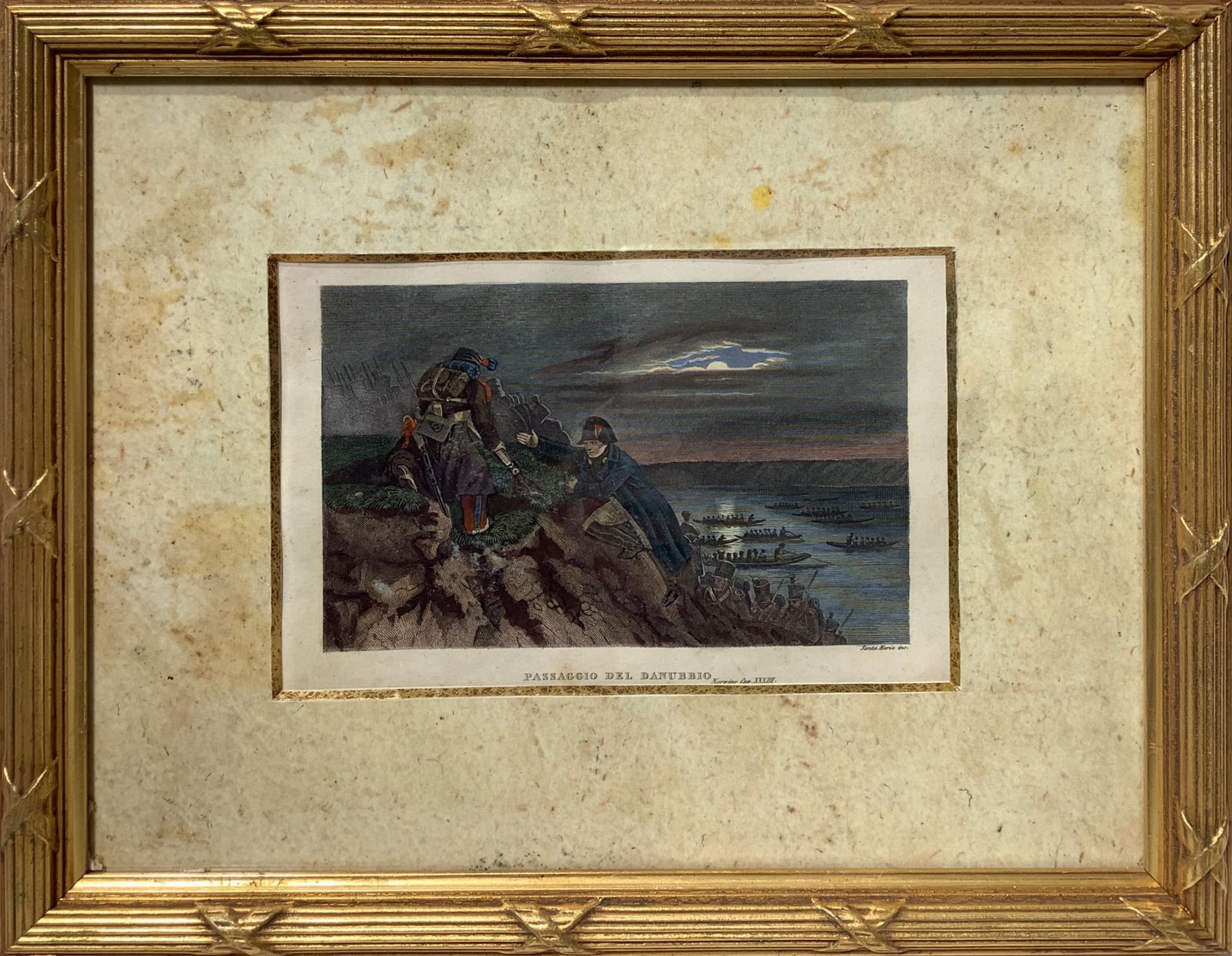Incisione in bella cornice in legno dorato di SantaMaria, a colori raffigurante, Napoleone che attraversa il Danubio. 250x310 mm