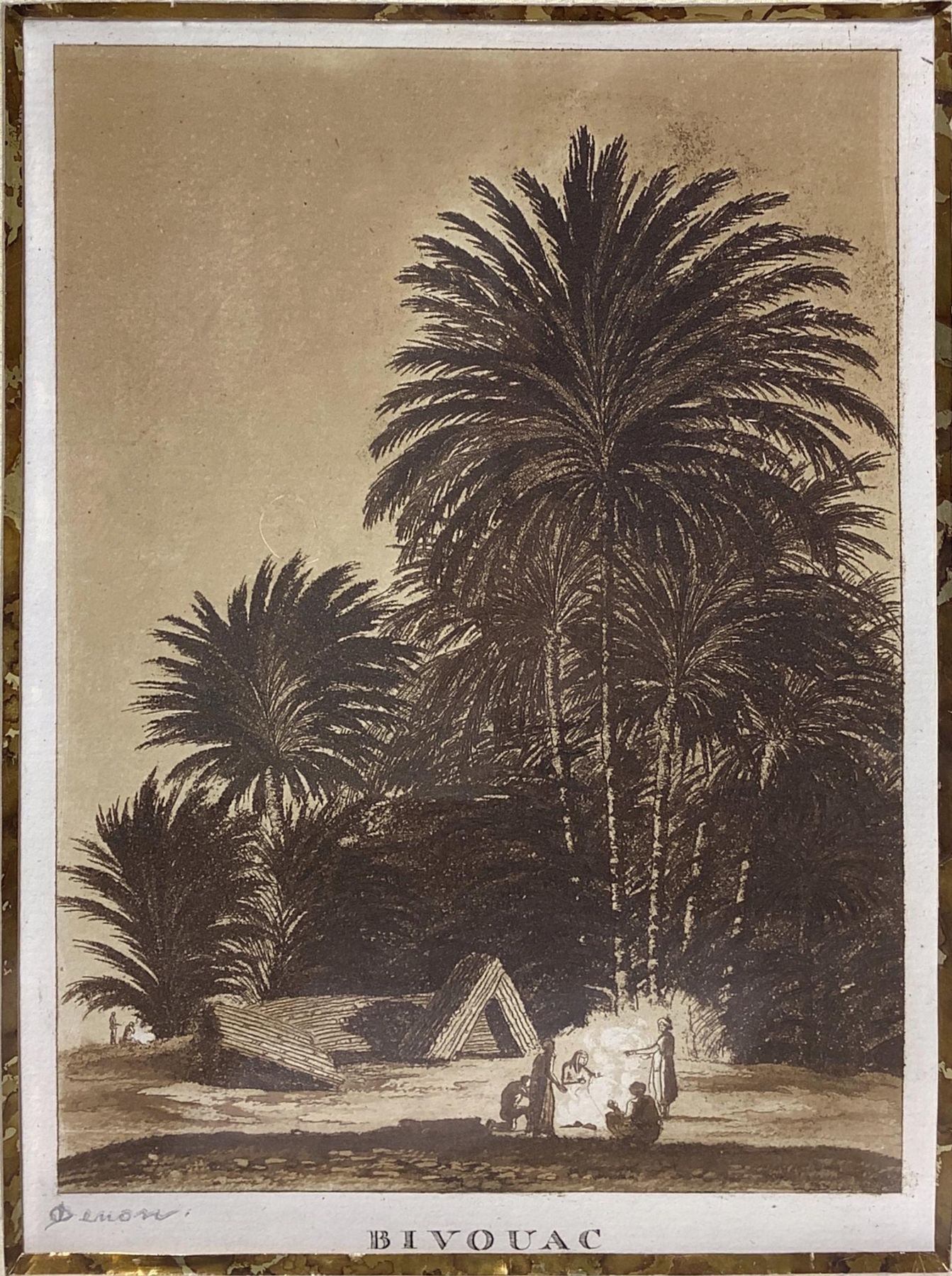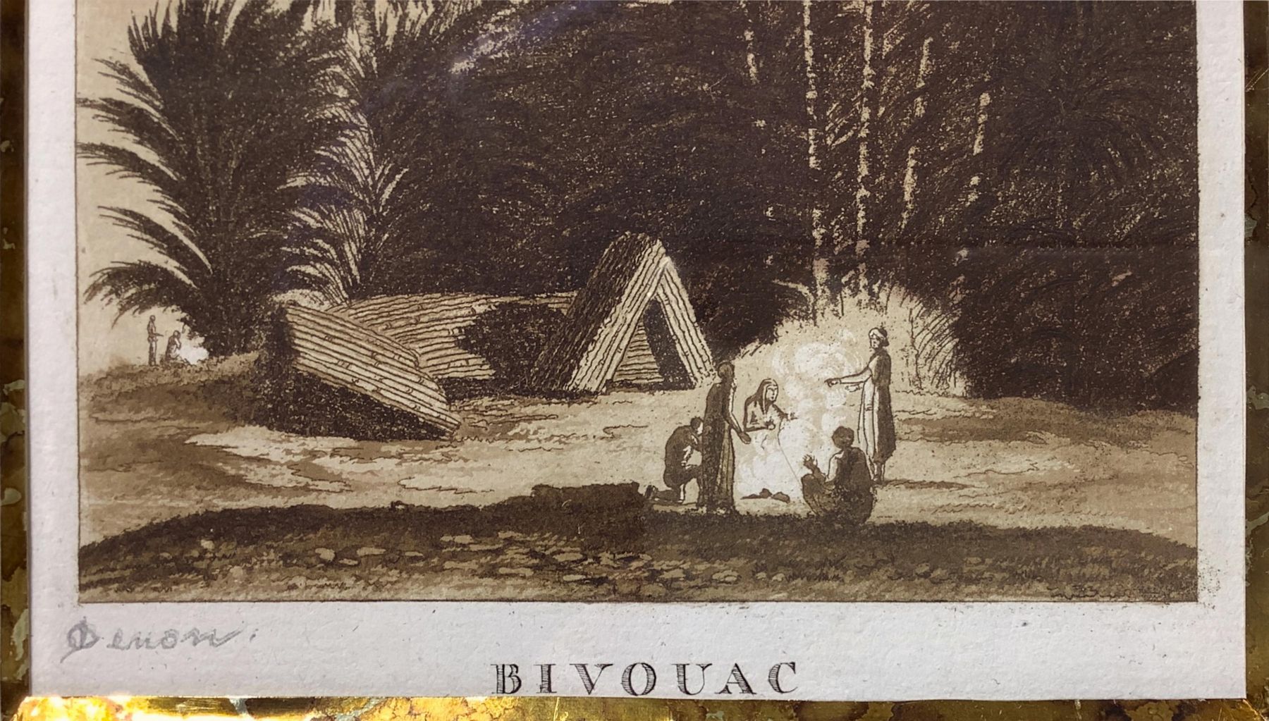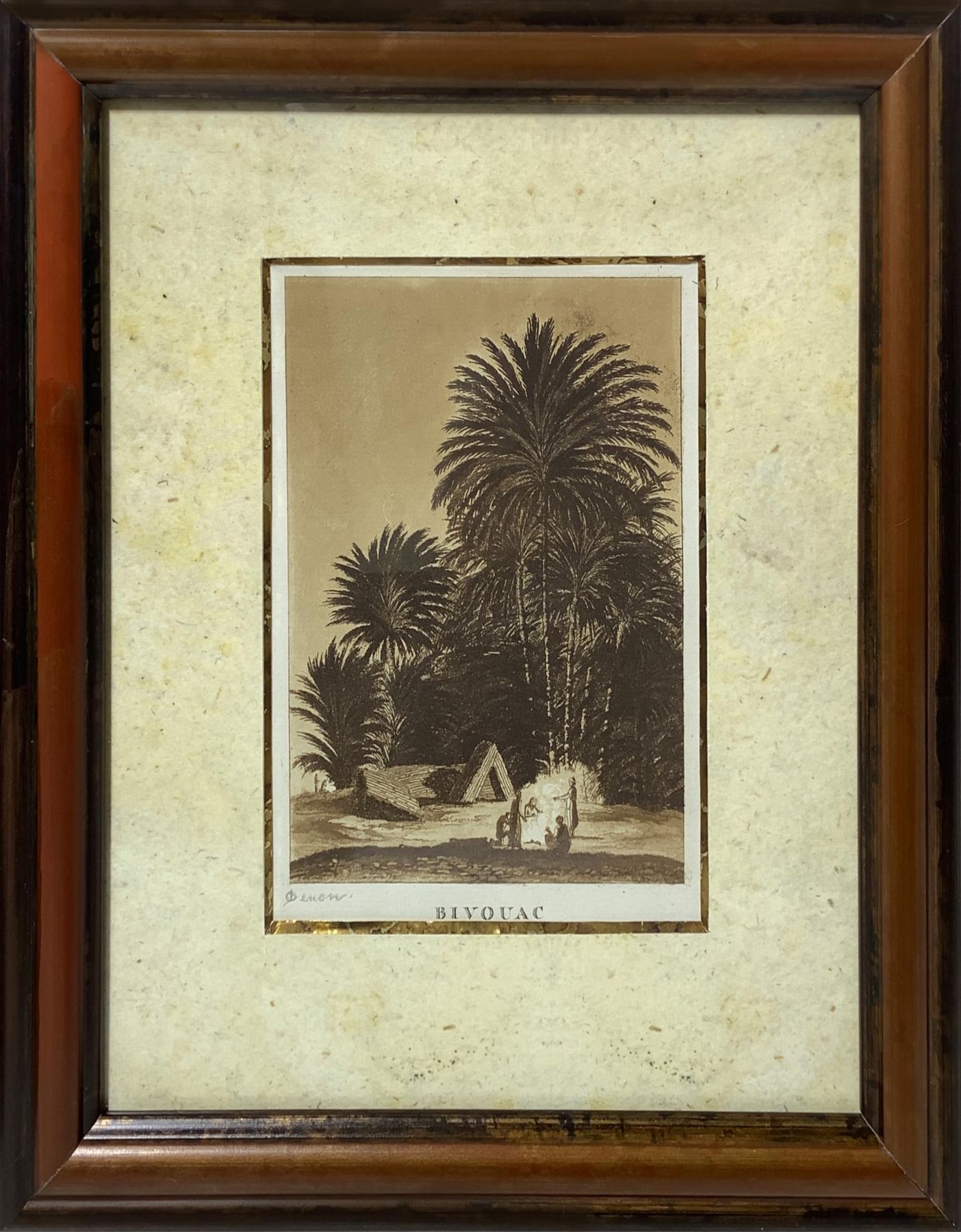Incisione a seppia in bella cornice in legno di noce tratte dal Viaggio nel basso ed alto Egitto. Illustrato dal. Denon. Firenze, Giuseppe Tofani edizioni, 1808, raffigurante la Tav:15 Bivouac. 320x270mm (180x126mm senza cornice). Vivant Dominique Denon (Chalon-sur-Saône 1747- Paris 1825)
