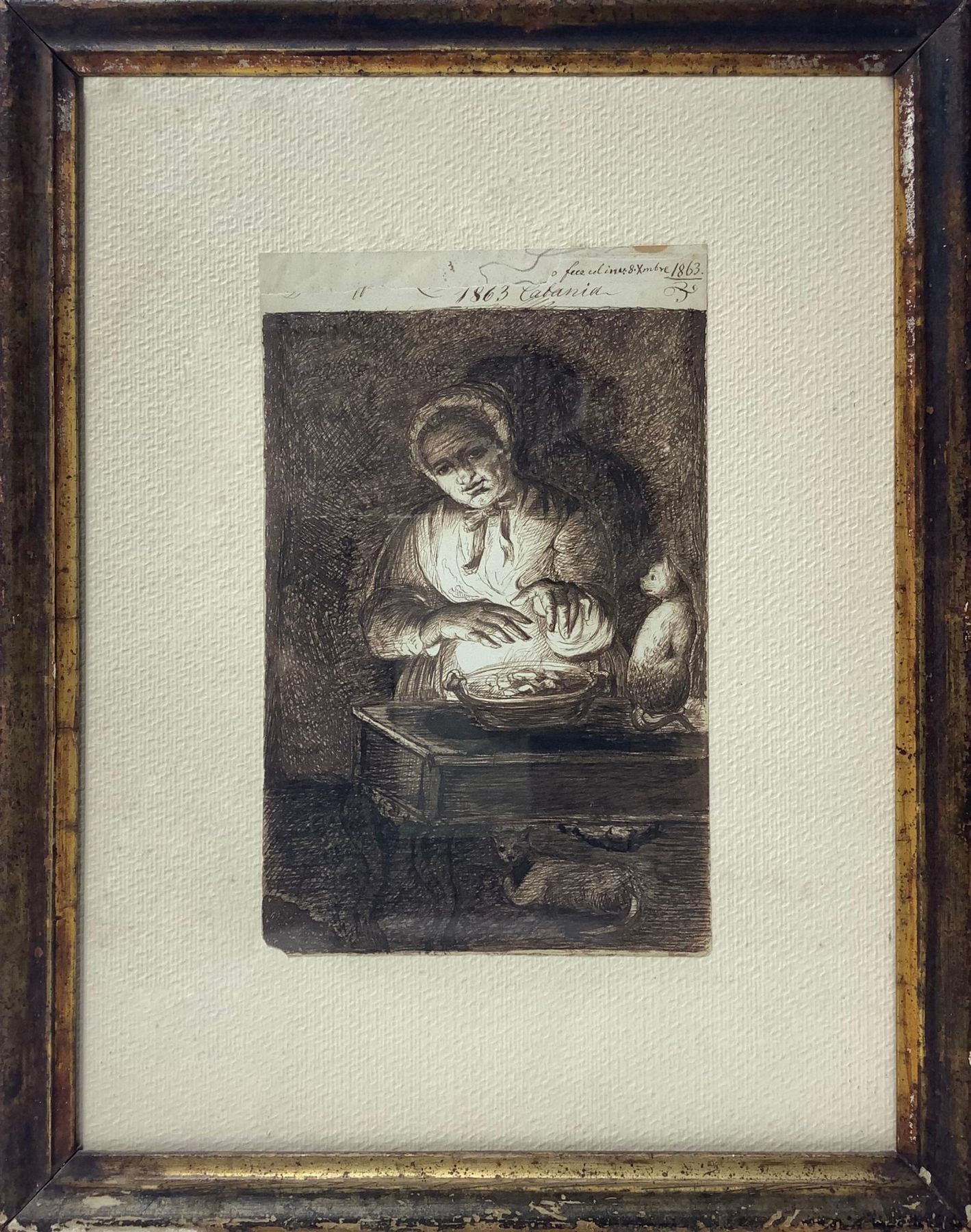 Disegno di autore ignoto raffigurante donna con gatto che si scalda. Disegno su carta a inchiostro marrone. Mm 270x172, con cornice 465x365. Datato in testa Catania 1873. Vivant Dominique Denon (Chalon-sur-Saône 1747- Paris 1825)