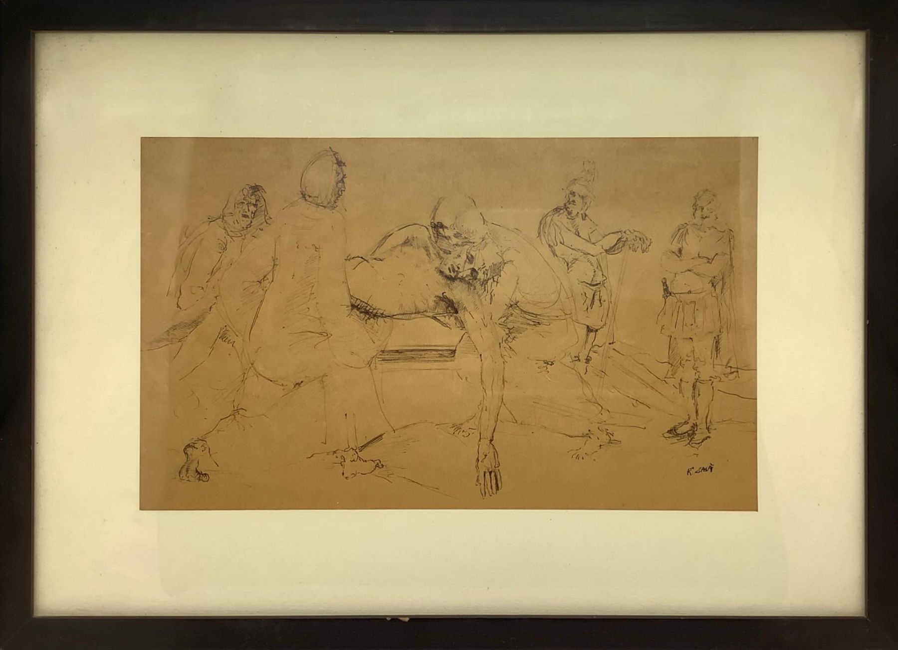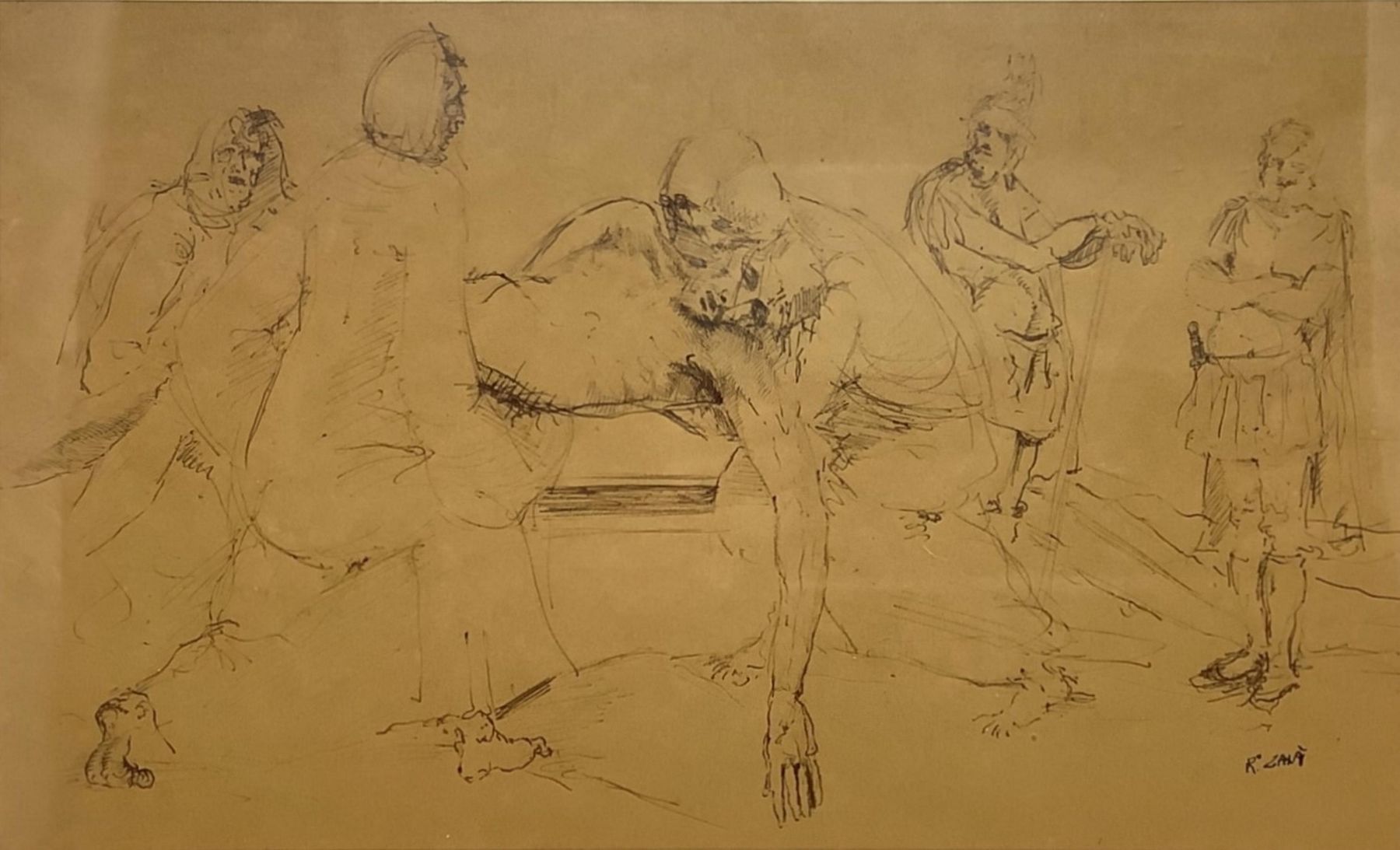 Disegno raffigurante deposizione di Cristo, disegno a china su carta seppiata, XX secolo. Cm 16x27. In cornice c, 29x30,5. Firmato in basso a destra. R.Zalà.