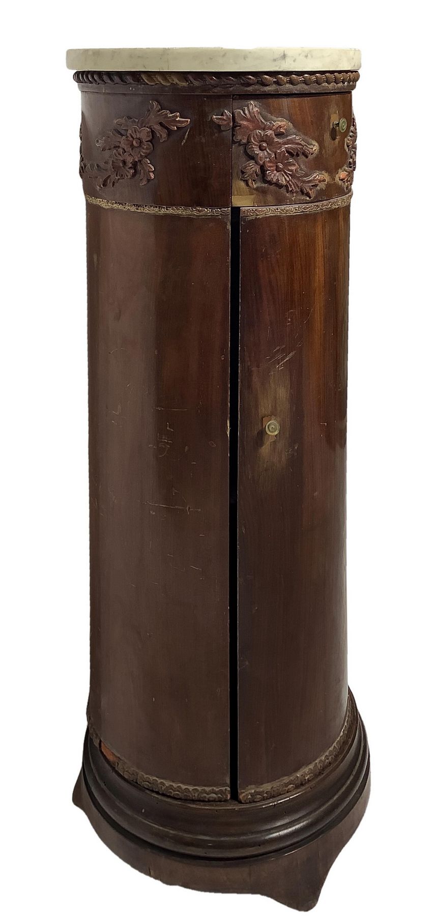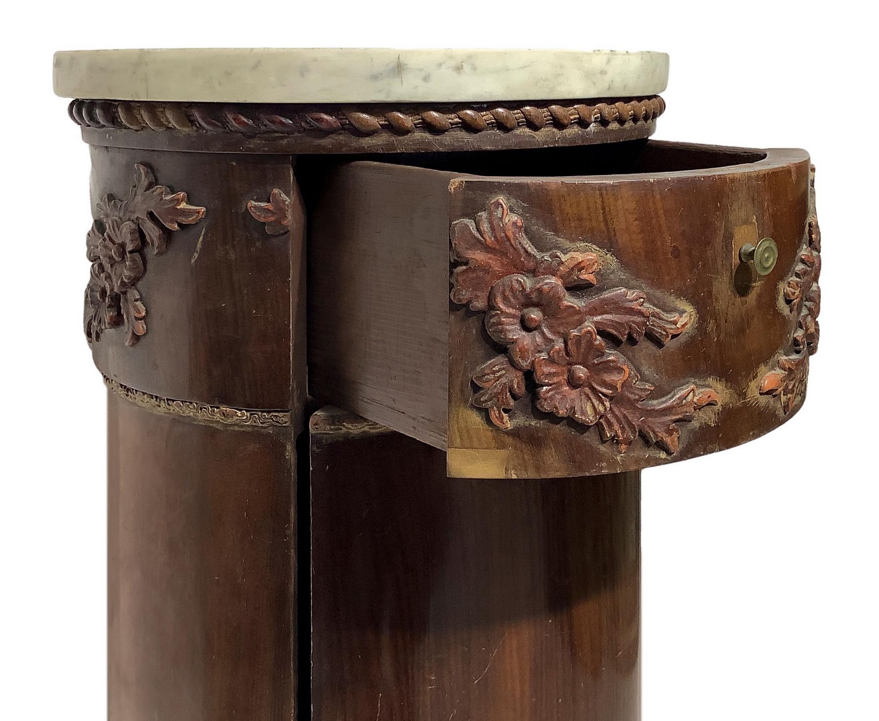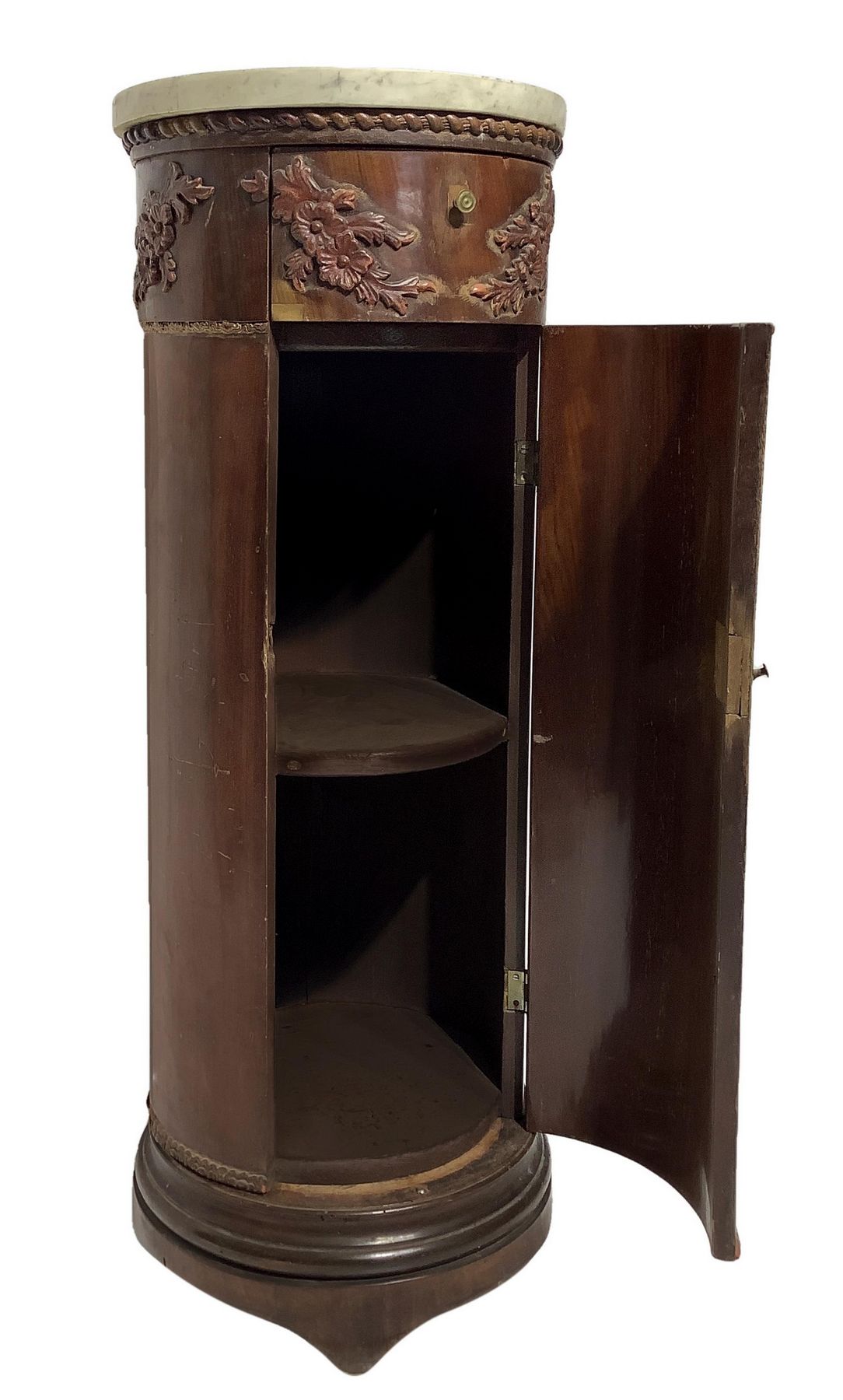 Comodino a colonna in legno di palissandro piano in marmo bianco, sportello e cassetto sovrastante, parte superiore intagliata a fiori. Inizi XIX secolo. H cm 86. Diametro cm 32.
