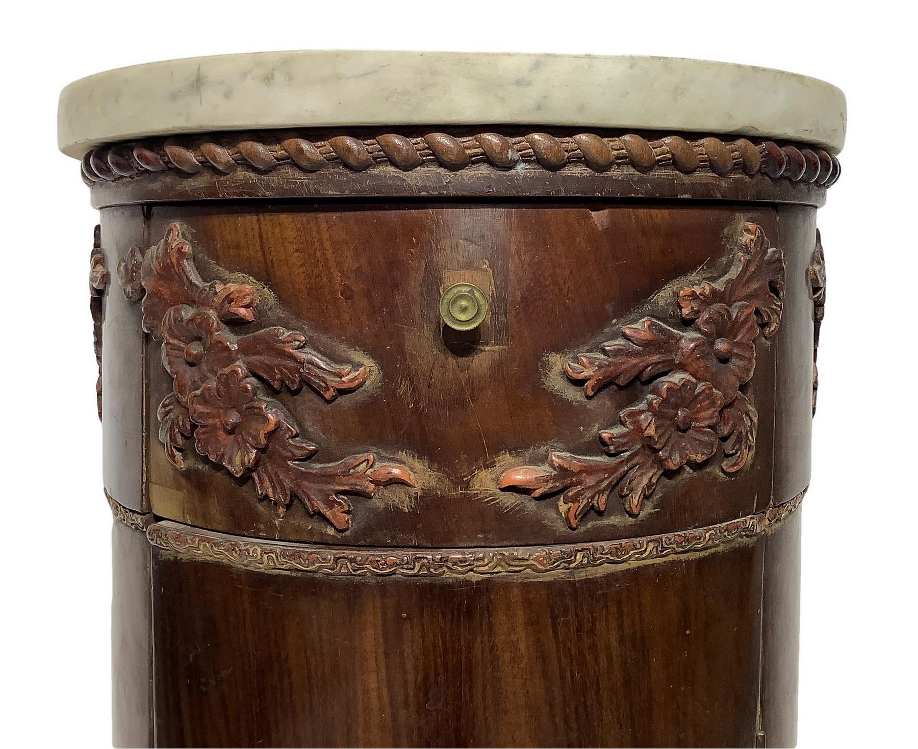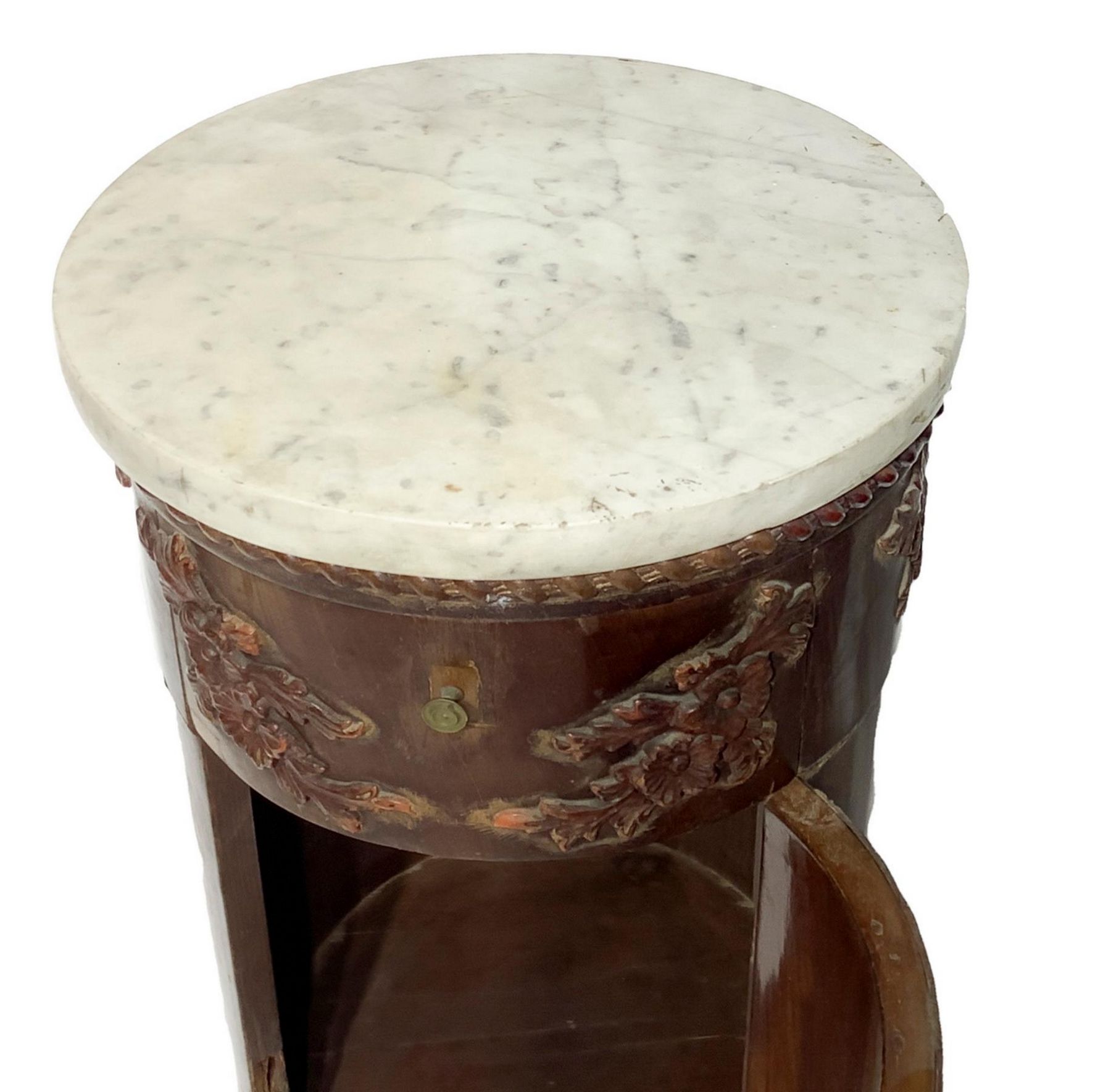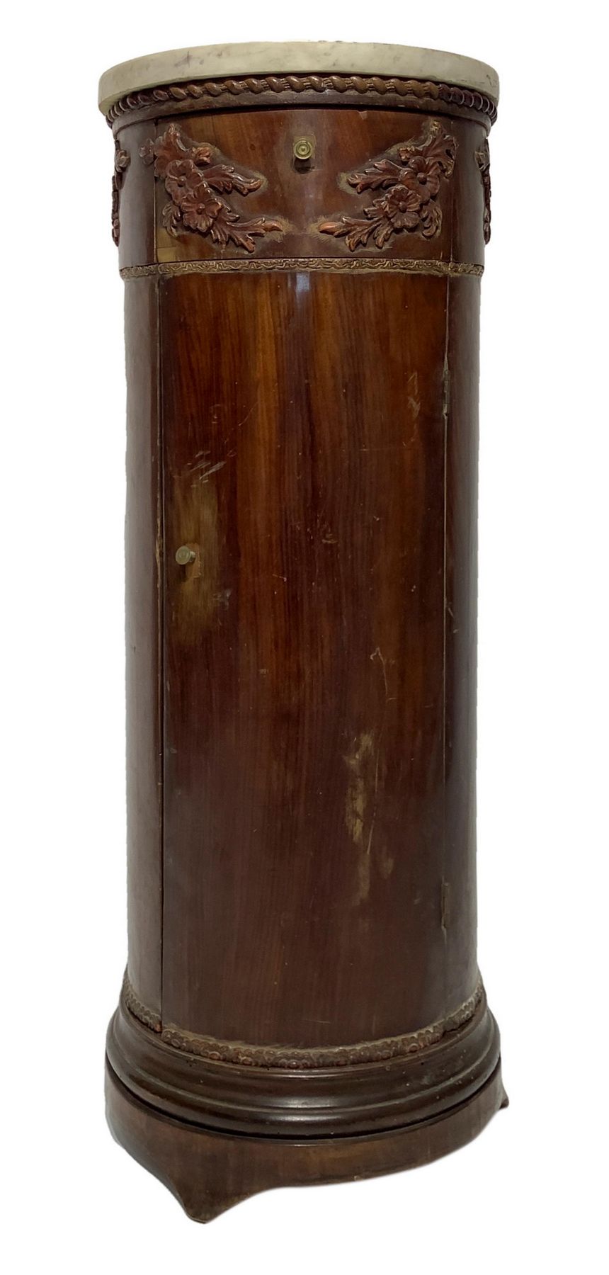 Comodino a colonna in legno di palissandro piano in marmo bianco, sportello e cassetto sovrastante, parte superiore intagliata a fiori. Inizi XIX secolo. H cm 86. Diametro cm 32.