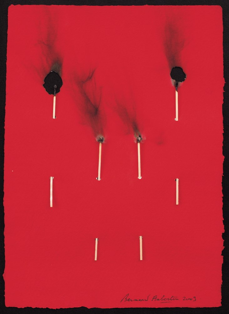BERNARD AUBERTIN Fontenay aux Roses 1934 Senza titolo, 2009 fiammiferi e combustioni bruciati su carta cm. 48,5x35,5 applicata su tela cm. 70x50, firma e anno in basso a destra, dichiarazione d'autenticità dell'artista su foto.