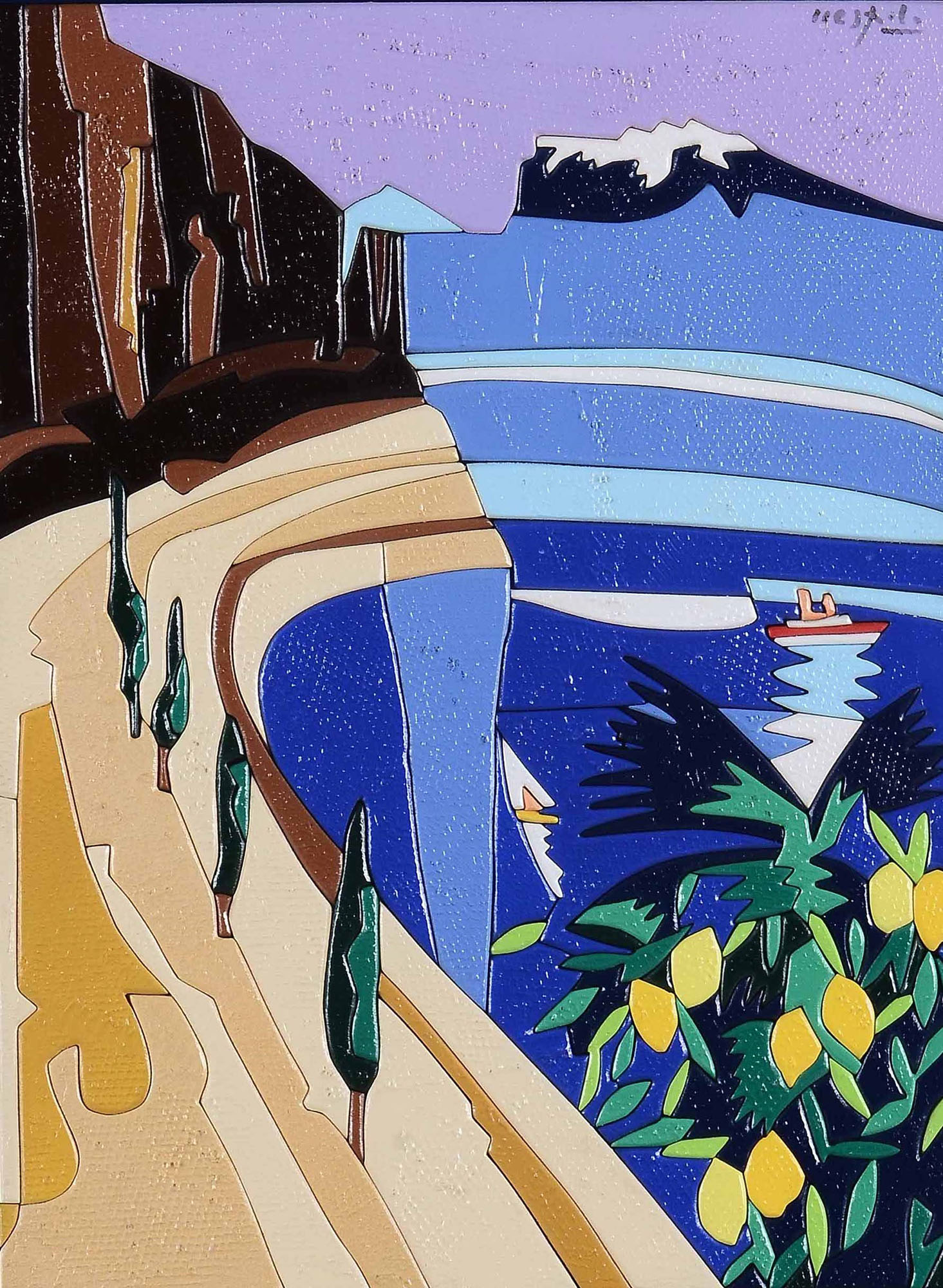Ugo Nespolo (1941), Riva Torbole, 1999, acrilici su legno, cm 40x30 firmato in alto a destra firmato e intitolato al retro Autentica dell’artista su fotografia