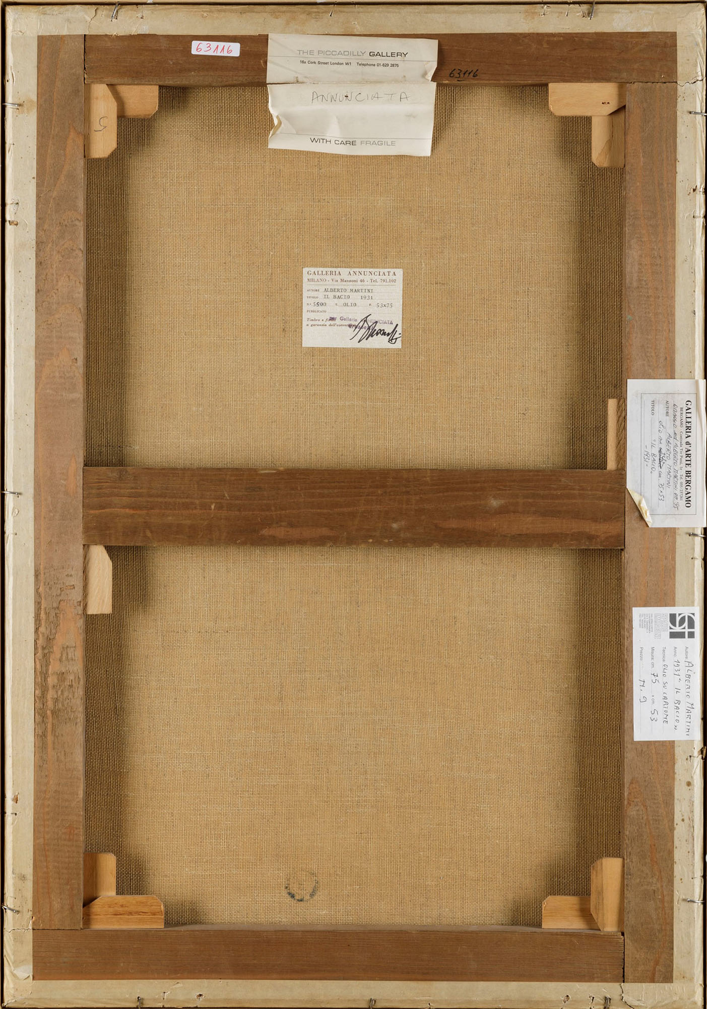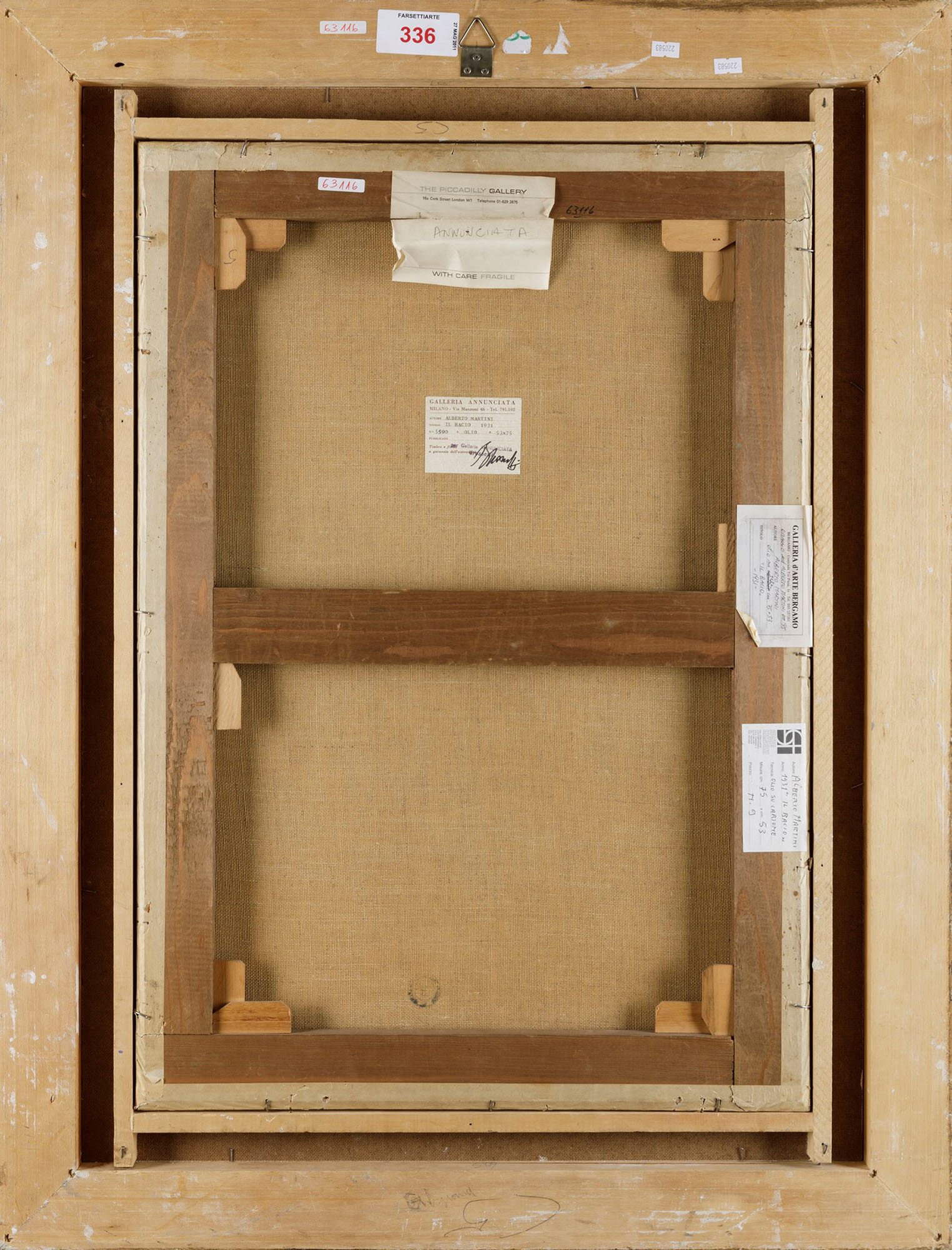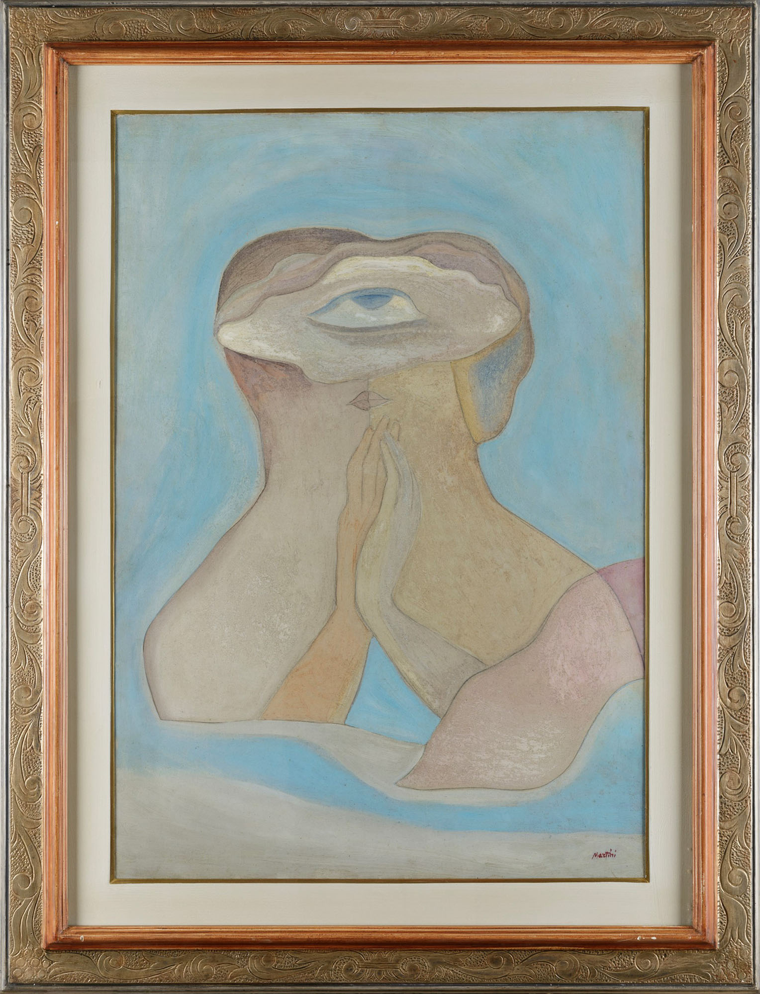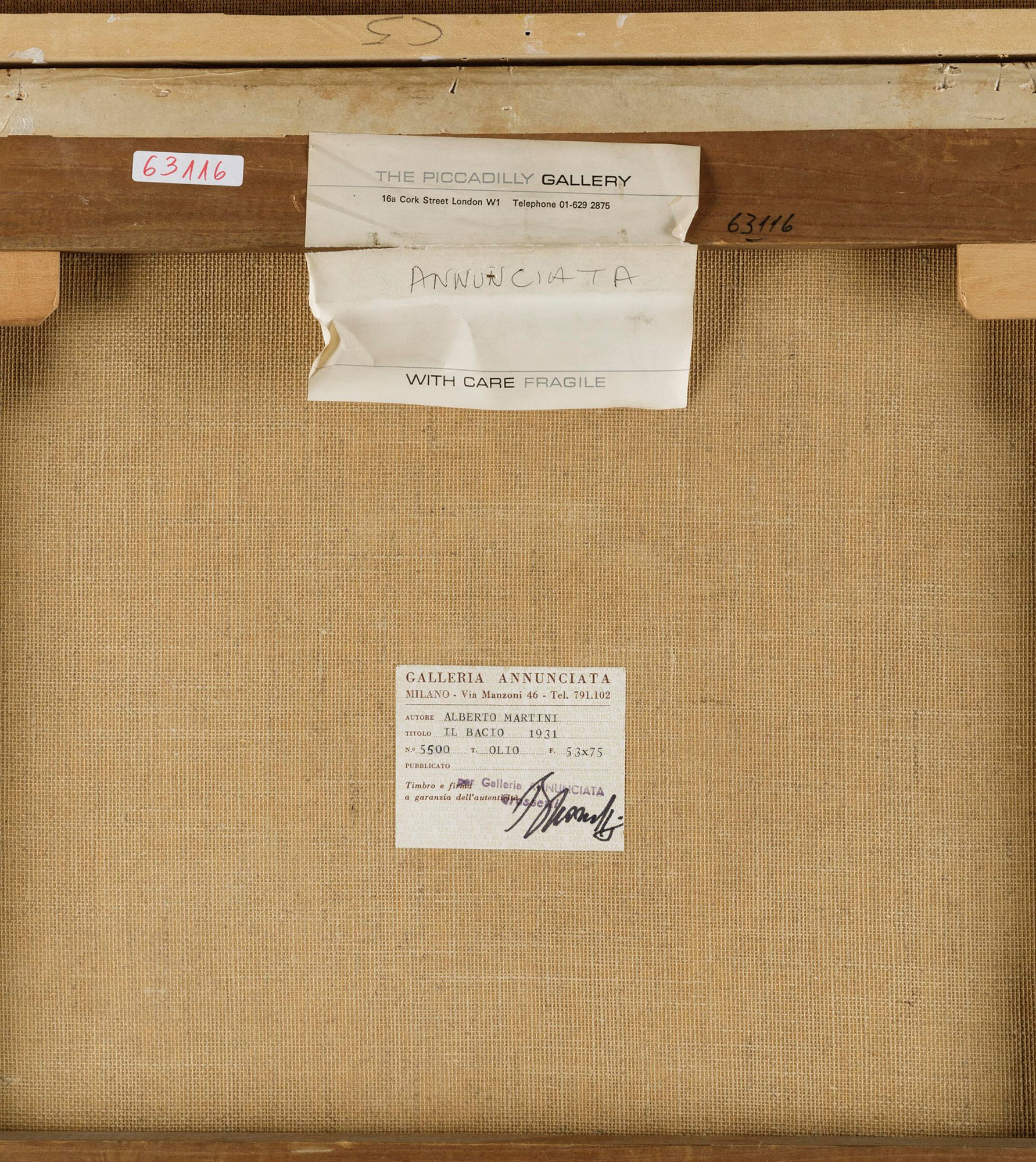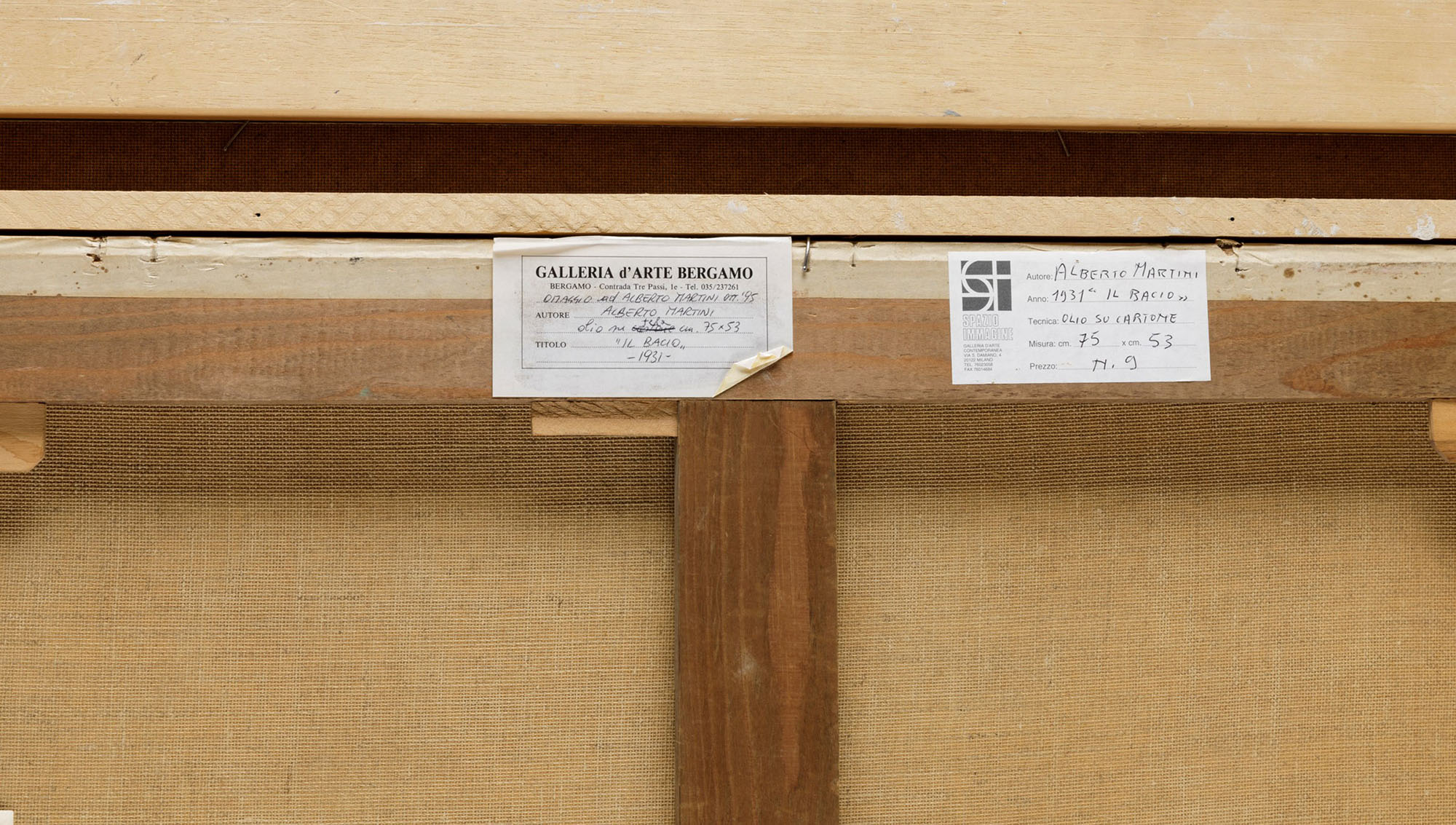 Alberto Martini (1876-1954), Il bacio, 1931, olio su cartone, cm 75X53 firmato in basso a destra Etichetta al retro della Galleria d’Arte Bergamo, Bergamo Etichetta al retro della Spazio Immagine Galleria d’Arte Contemporanea, Milano Etichetta al retro della Galleria Annunciata, Milano Etichetta al retro di The Piccadilly Gallery, London Autentica su fotografia a cura di Galleria Annunciata, Milano, Provenienza: già Collezione Guido Peruz, Milano Esposizioni: Omaggio ad Alberto Martini, Galleria d’Arte Bergamo, Bergamo, 1995