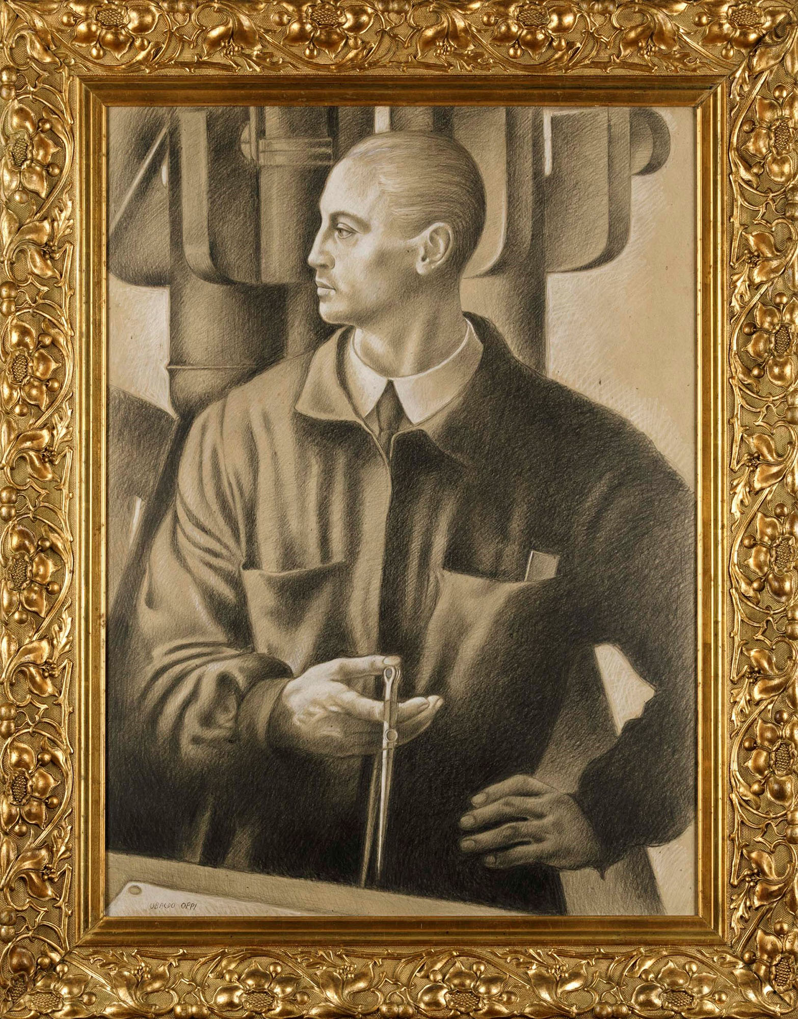 Ubaldo Oppi (1889-1942), L’ingegnere, 1926, pencil, charcoal and whiting on pressed cardboard, 86x63cm signed lower left Exhibited: #collezionemart. Una moderna classicità, a cura di D.Ferrari, A, Tiddia [exhibition without catalogue] Realismo magico. L'incontro nella pittura italiana degli anni Venti e Trenta, curated by G. Belli, V. Terraroli, exhibition catalogue (Rovereto, Mart, Museo di arte moderna e contemporanea di Trento e Rovereto, 3 December 2017 - 2 April 2018), Electa, Milan 2017, p. 123 (ripr.) Ritratto di donna. Il sogno degli anni Venti. Lo sguardo di Ubaldo Oppi, curated by S. Portinari, exhibition catalogue (Vicenza, Basilica Palladiana, 6 December 2019 - 3 May 2020) Centro studi Andrea Palladio - Grafiche Aurora, Vicenza - Verona 2019, n. 113, pp 242,334 (ripr.) Literature: VAF Stiftung The Collection, General catalogue, curated by Daniela Ferrari, Silvana Editoriale, Cinisello Balsamo (MI), 2012, p. 637 with n. VAF 2179 D. Astrologo Abadal, R. Montrasio (curated by), Anselmo Bucci e gli amici di Novecento Martini Oppi Sironi Wildt, exhibition catalogue, (Fano, Galleria Carifano, Palazzo Corbelli, 22 June - 30 September 2012), Silvana Editoriale, Cinisello Balsamo 2012, n 43, pp 127,163 (ripr.)