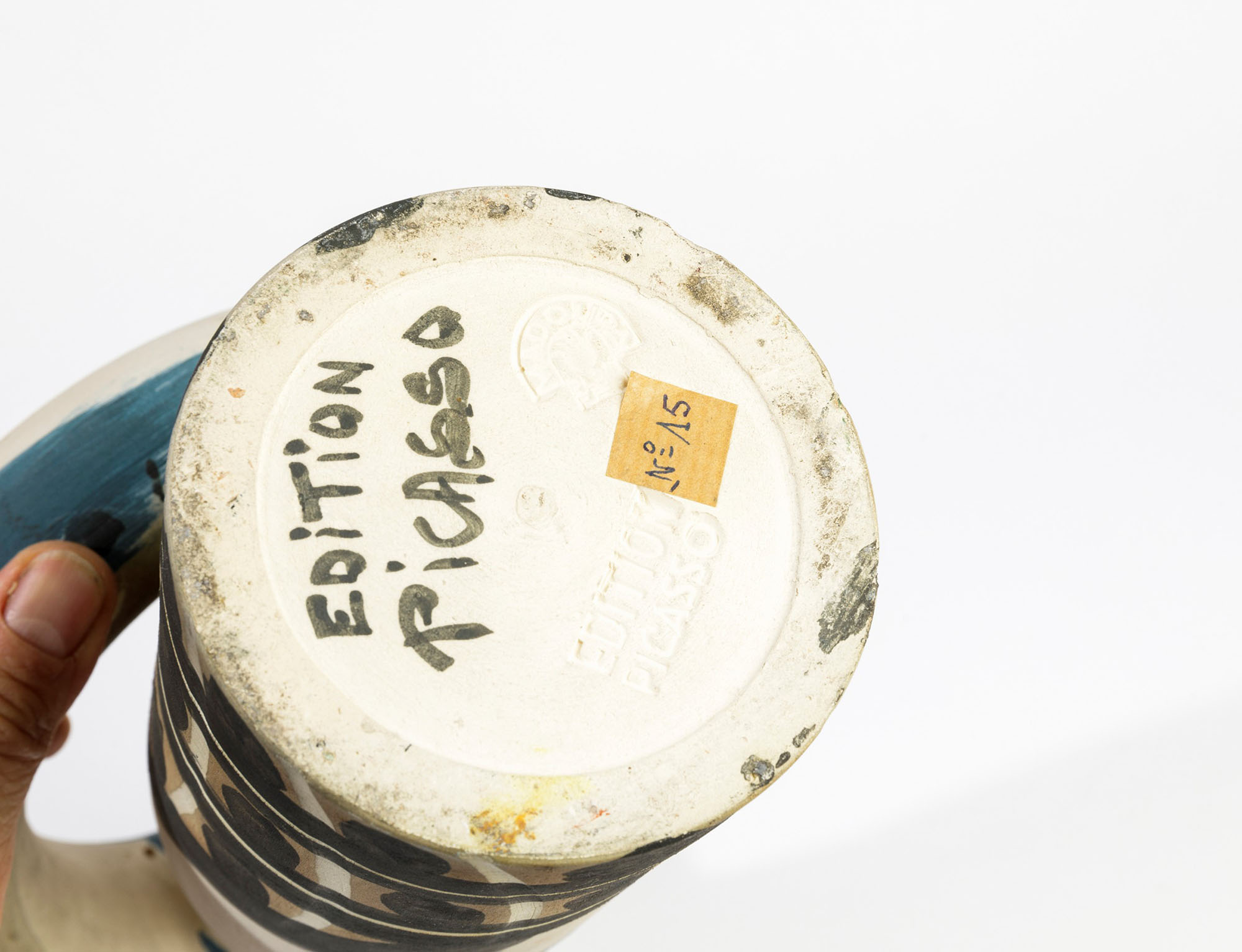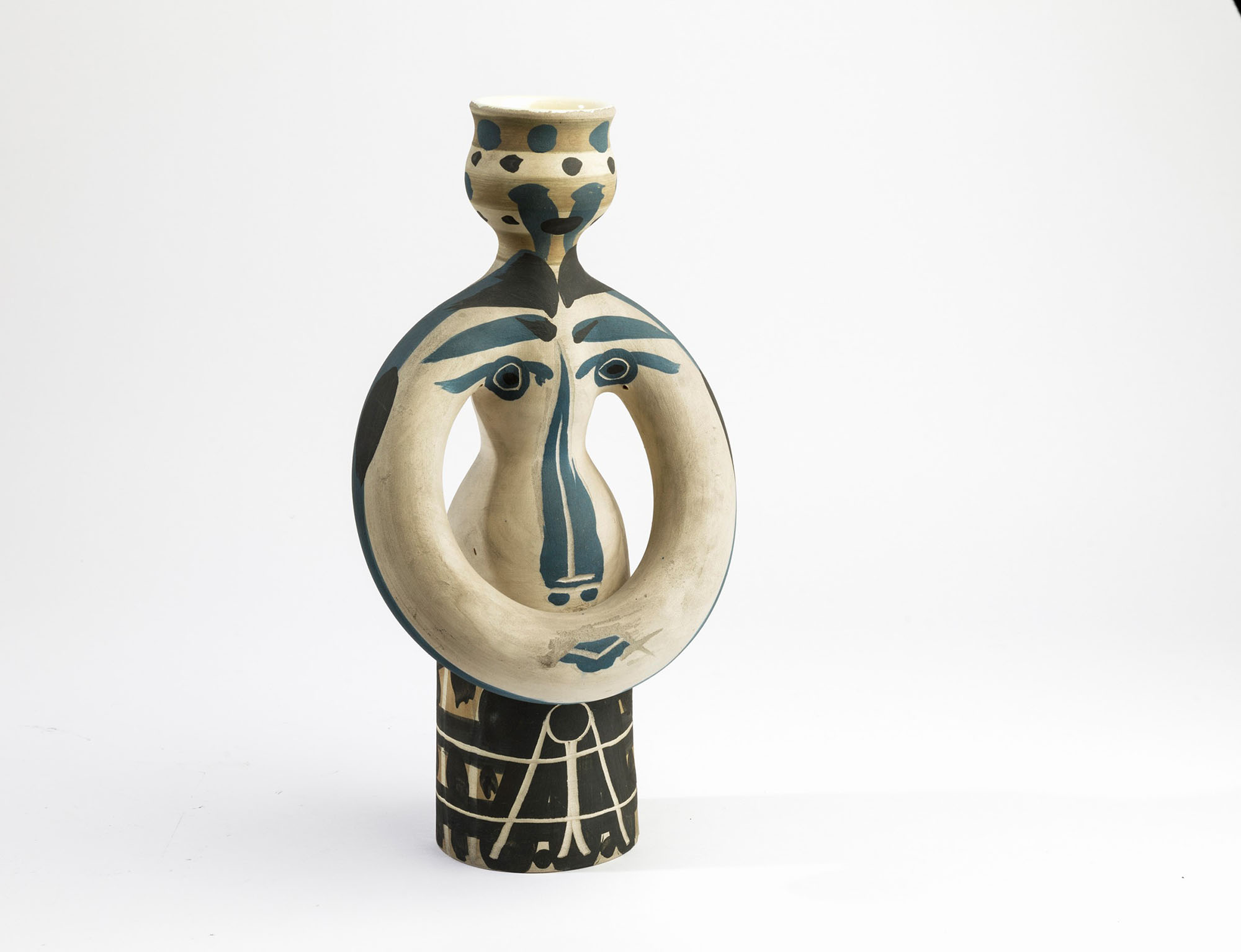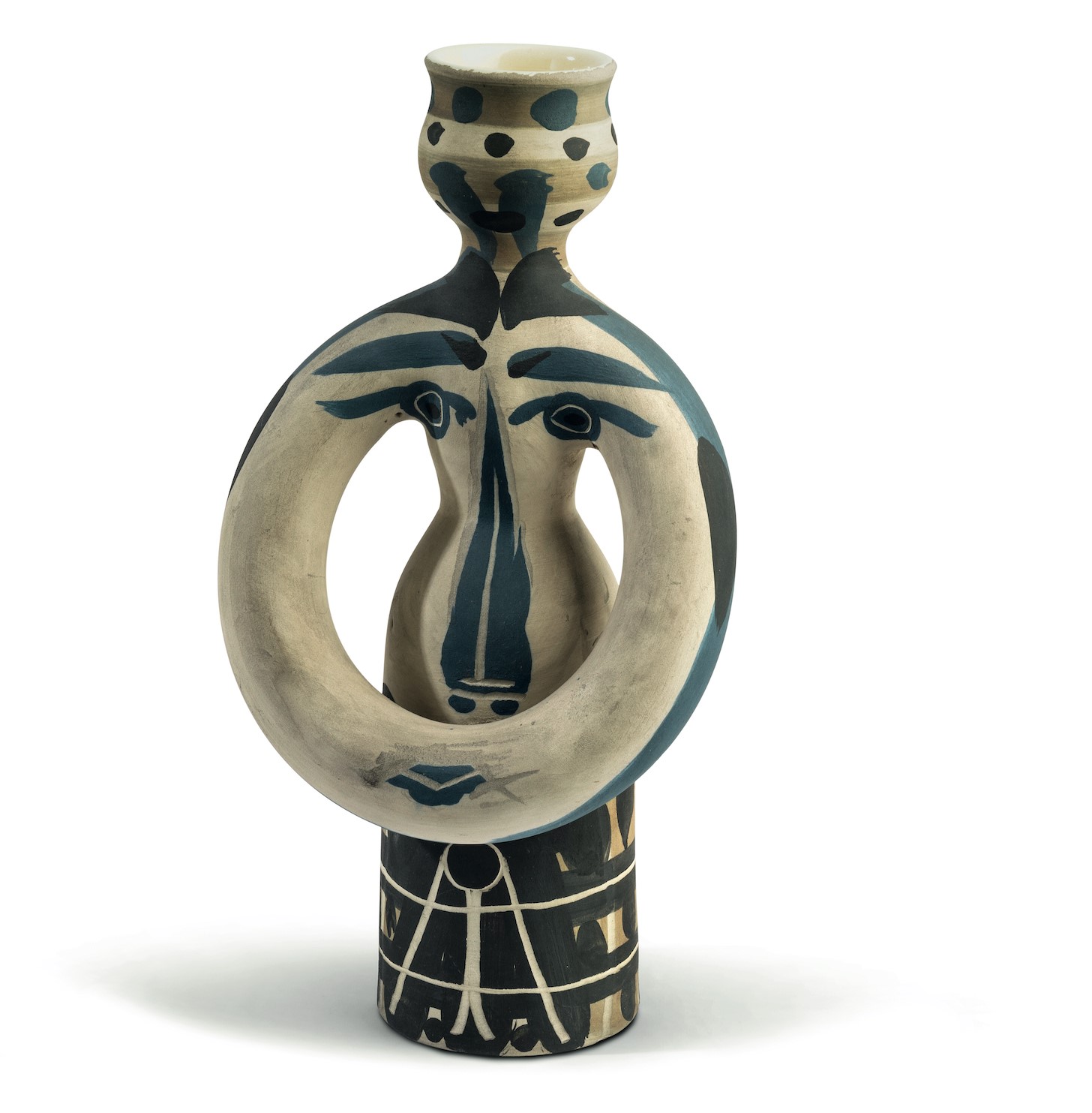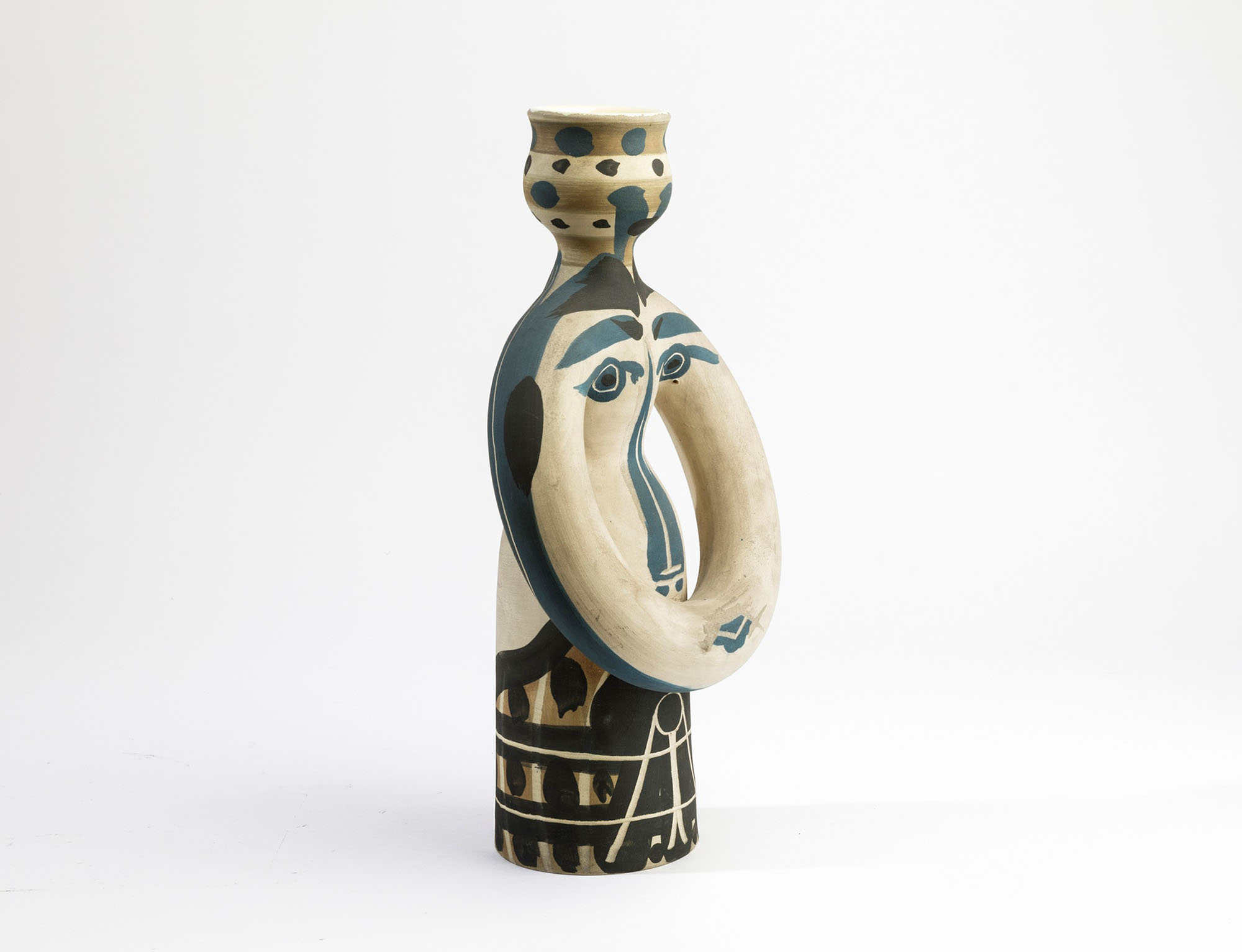 Pablo Picasso (1881-1973), Lampe Femme, 1955, white Faenza earthenware ceramic vase with blue, green and balck engobe, unique piece in the decoration, partially varnished in the inside, 36,8x19,1x12,7cm Edition of 100, indented stamp Madoura Plein Feu Pottery and marked "Edition Picasso" in black under the base Literature: Alain Ramiè n. 298