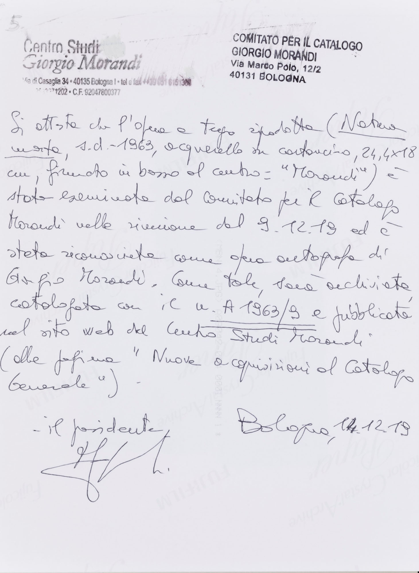 Giorgio Morandi (1890-1964), Natura morta, s.d. 1963, watercolor on cardboard, 24,4x18cm signed in pencil Work registered at Il Centro Studi Giorgio Morandi, Bologna, under the n. A1963/9, on 9 December 2019, and published on Centro Studi website (page “Nuove acquisizioni al Catalogo Generale”) Provenance: Galleriaforma, Genoa Paolo Minetti collection, Genoa