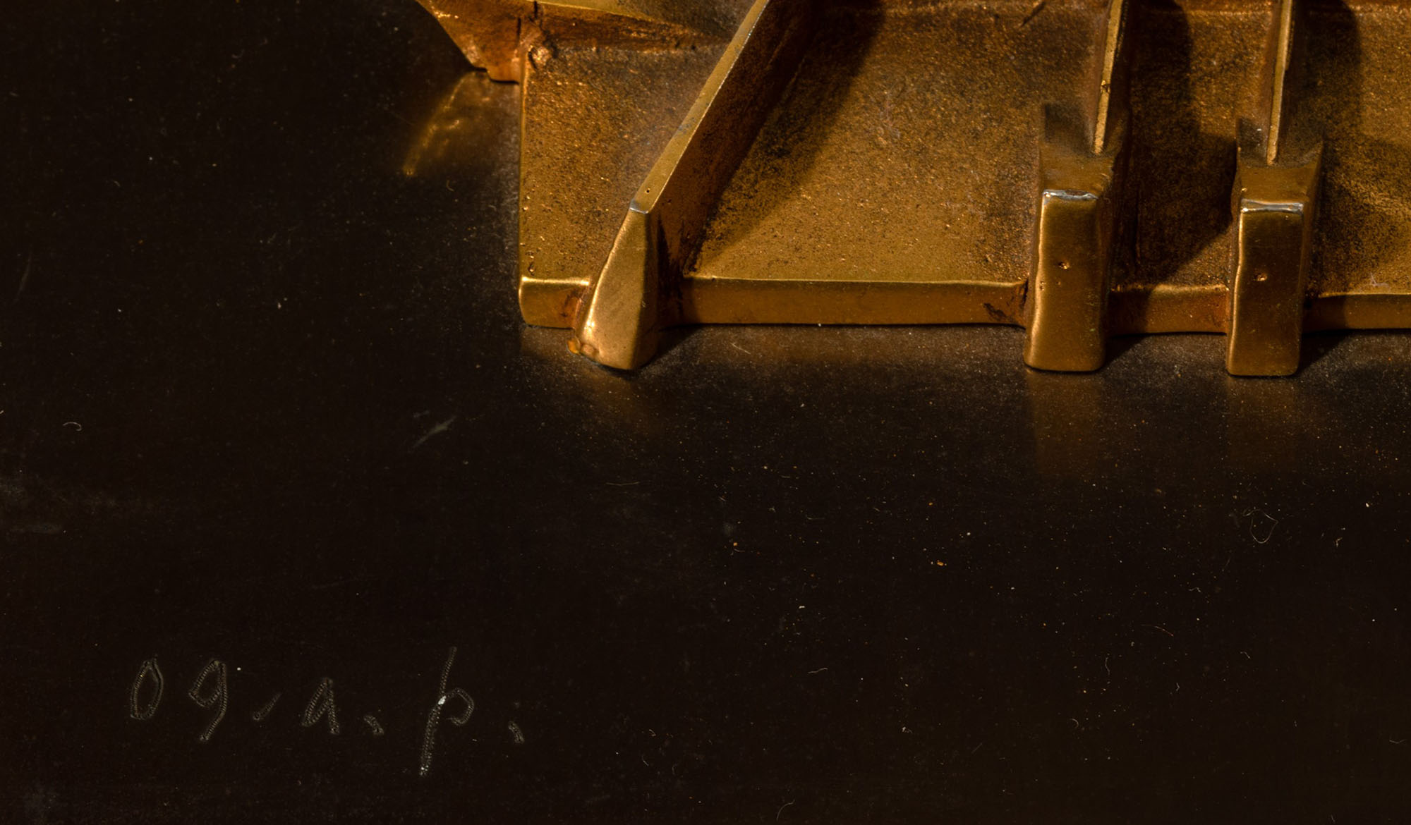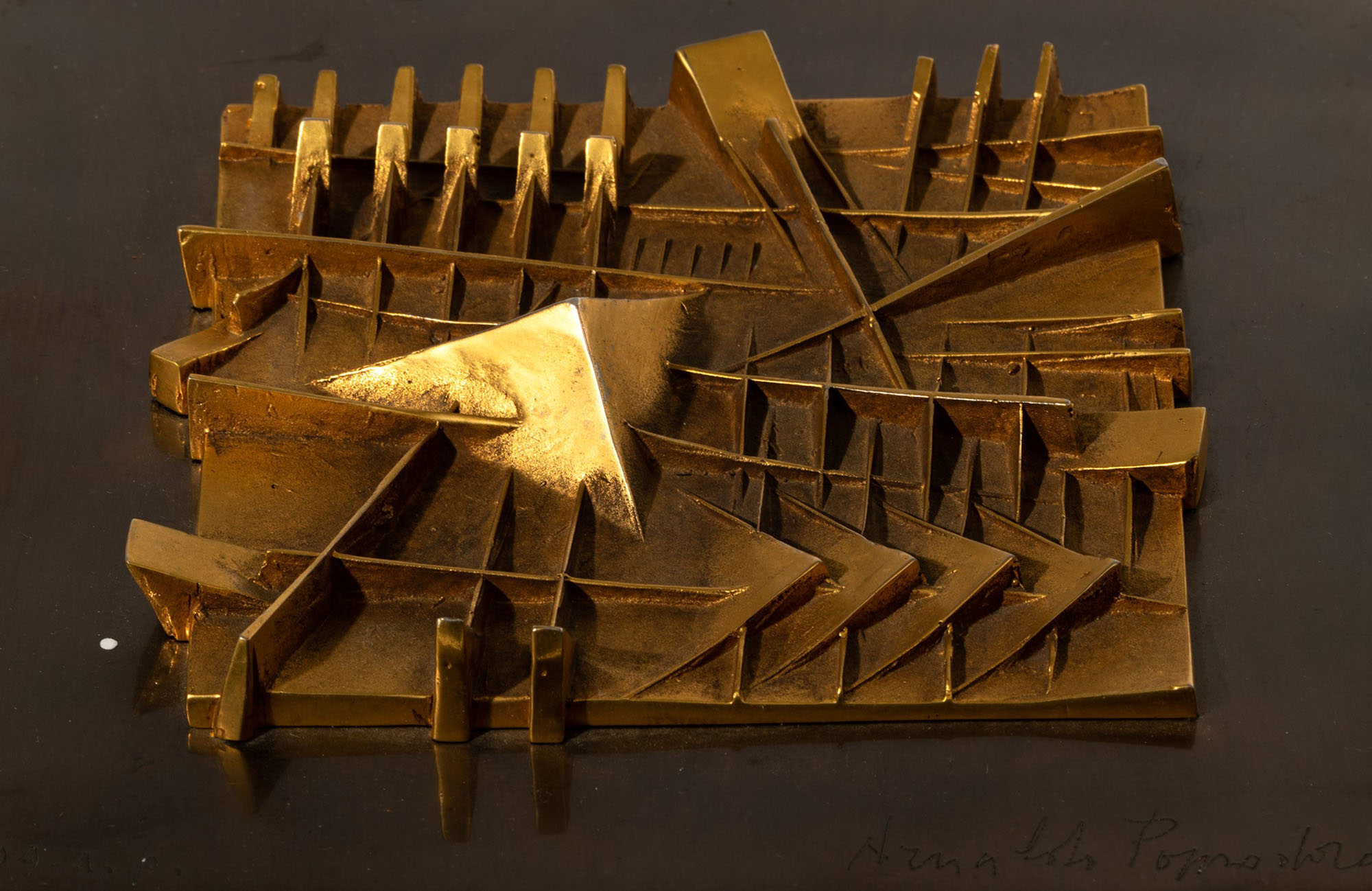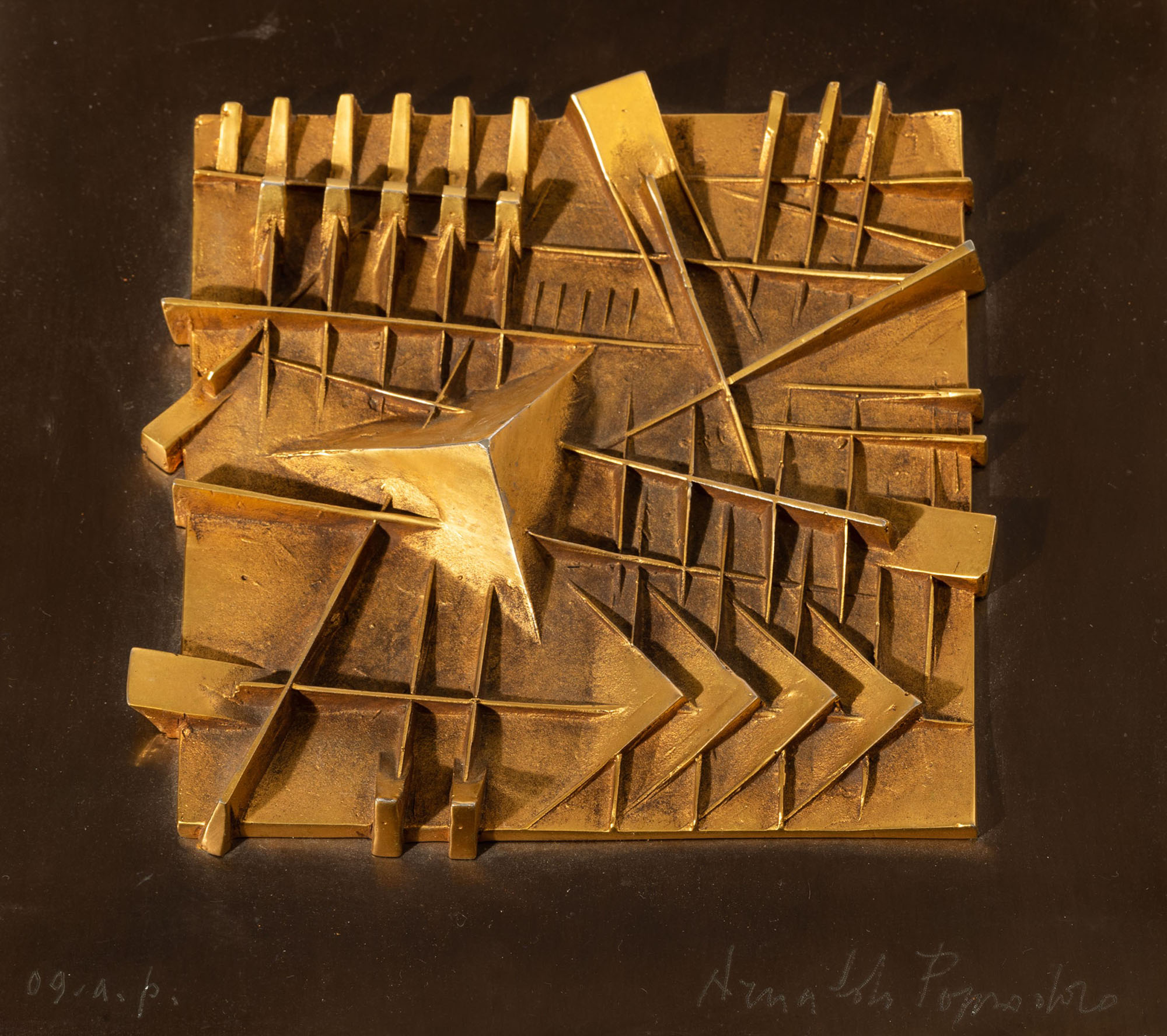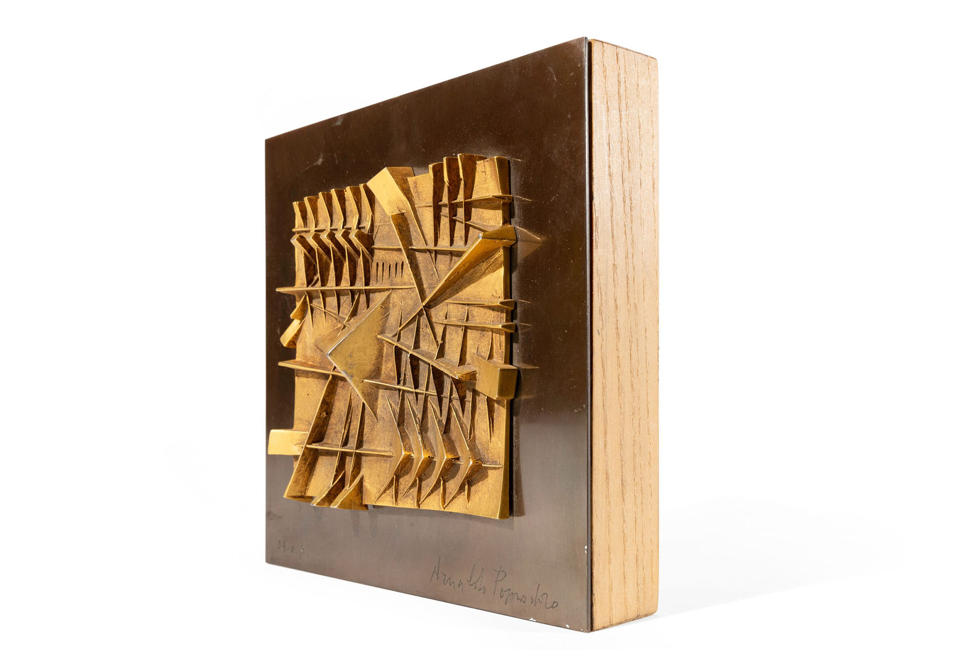 A. Pomodoro, Rilievo, 1982, Arnaldo Pomodoro (1926). Bronze, iron and wood. 20x20x4cm. Signed