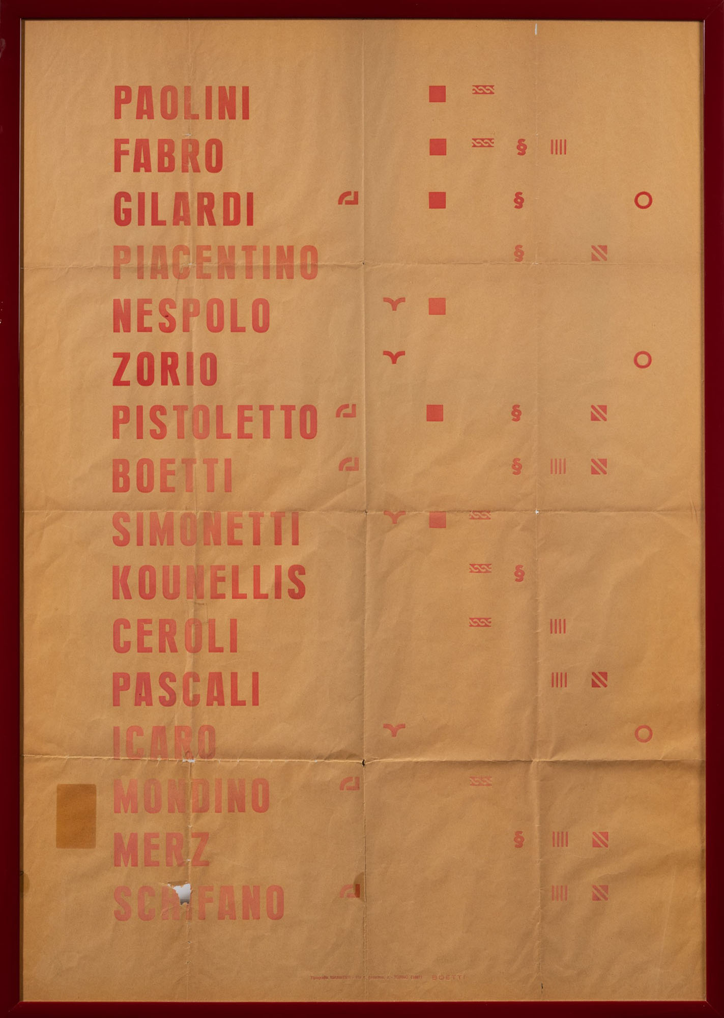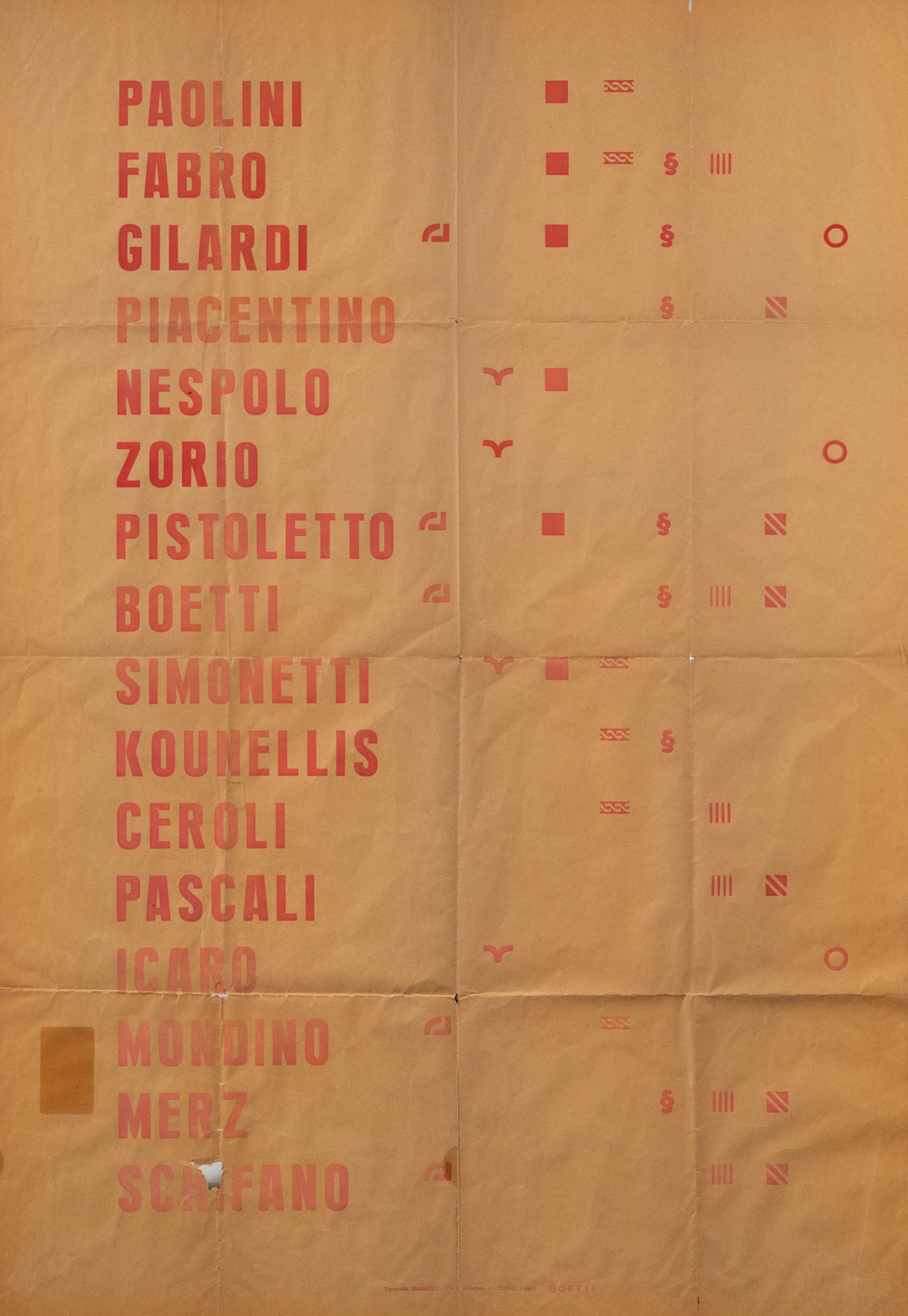 Alighiero Boetti (1940-1994), Manifesto, 1967, stampa offset, cm 100x70 edizione in 800 esemplari es. non numerato Opera registrata presso l’Archivio Alighiero Boetti, Roma, in data 4 marzo 2020, con il n. 9622, Provenienza: Collezione privata, Torino