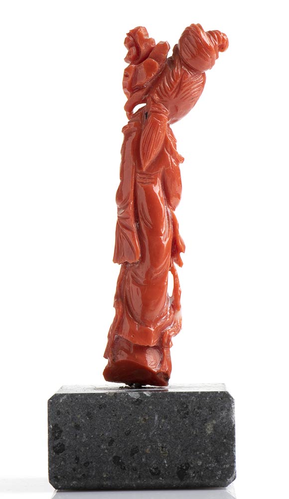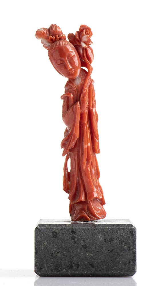 Scultura in corallo Momo o Cerasuolo (Corallium Elatius) raffigurante una Geisha posta su base in pietra. Altezza senza base 7,9 cm, larghezza 2,3 cm. Dimensioni base 2 x 4 x 4 cm. Peso scultura 23,6 gr. Stato di conservazione: *****ottimo.