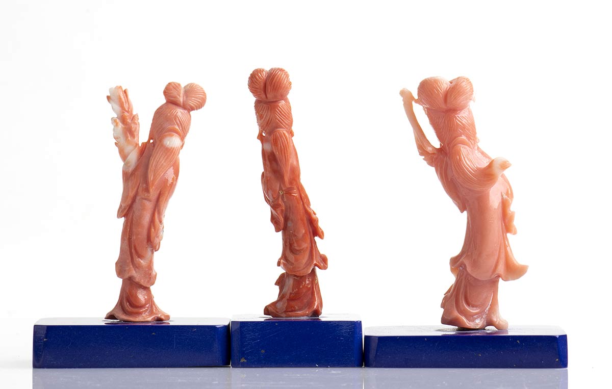 Lotto di tre sculture in corallo Momo o Cerasuolo (Corallium Elatius) raffiguranti tre Geishe poste su basi in pasta di lapislazzuli. Altezze senza basi 5,5 - 5,8 - 5,9 cm. Pesi netti 10,3 - 17 - 11 gr. Stato di conservazione: *****ottimo.