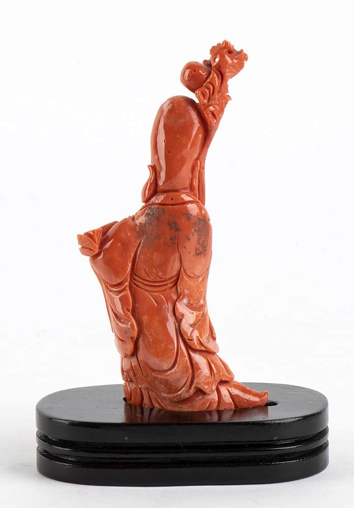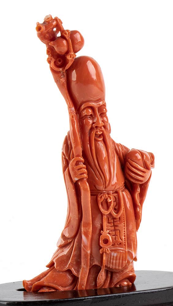 Scultura in corallo Momo o Cerasuolo (Corallium Elatius) raffigurante Shoulao, il dio della longevità Taoista, la figura con il tipico cranio enorme, un bastone nodoso nella mano destra e una grande pesca in quella sinistra, simbolo di longevità. Base in legno. Altezza 11 cm. Peso 101,6 gr. Stato di conservazione: ****buono. Certificato di Antichità Ce.S.Ar. (pre-1947).