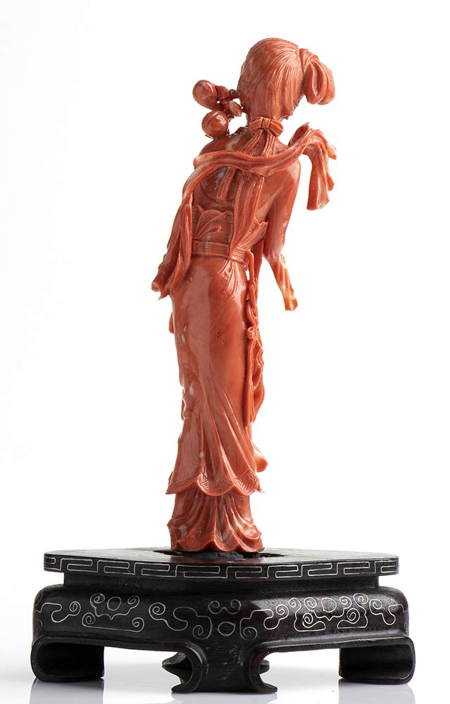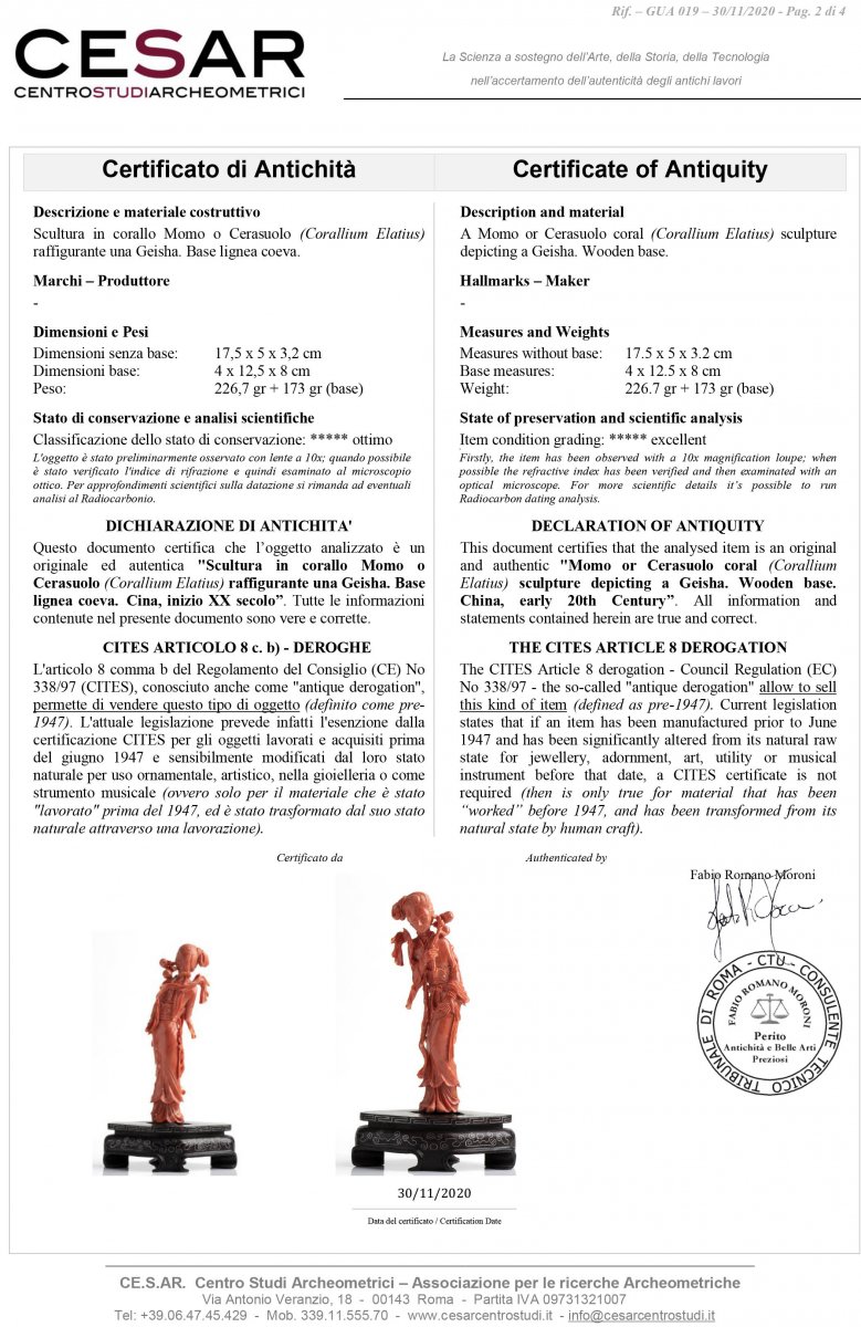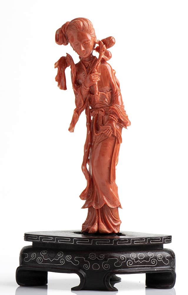 Scultura in corallo Momo o Cerasuolo (Corallium Elatius) raffigurante una Geisha. Base lignea coeva. Dimensioni senza base 5 x 3,2 cm, altezza 17,5 cm. Dimensioni base 4 x 12,5 x 8 cm. Peso scultura 226,7 gr, peso base 173 gr. Stato di conservazione: *****ottimo. Certificato di Antichità Ce.S.Ar.