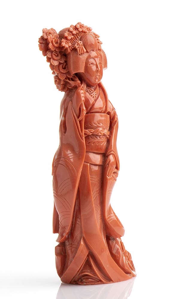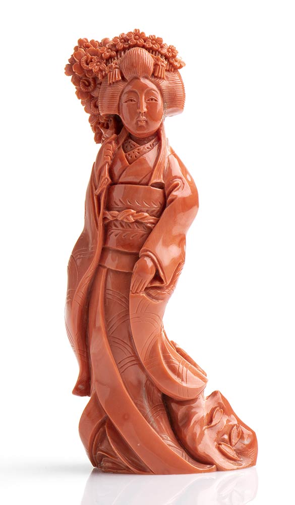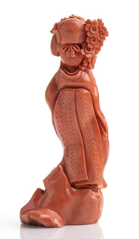 Scultura in corallo Momo o Cerasuolo (Corallium Elatius) raffigurante una Geisha. Base in palissandro. Dimensioni senza base 6 x 3,2 cm, altezza 15 cm, altezza con base 19,2 cm. Peso scultura 290 gr, peso base 464 gr. Stato di conservazione: *****ottimo. Certificato di Antichità Ce.S.Ar.