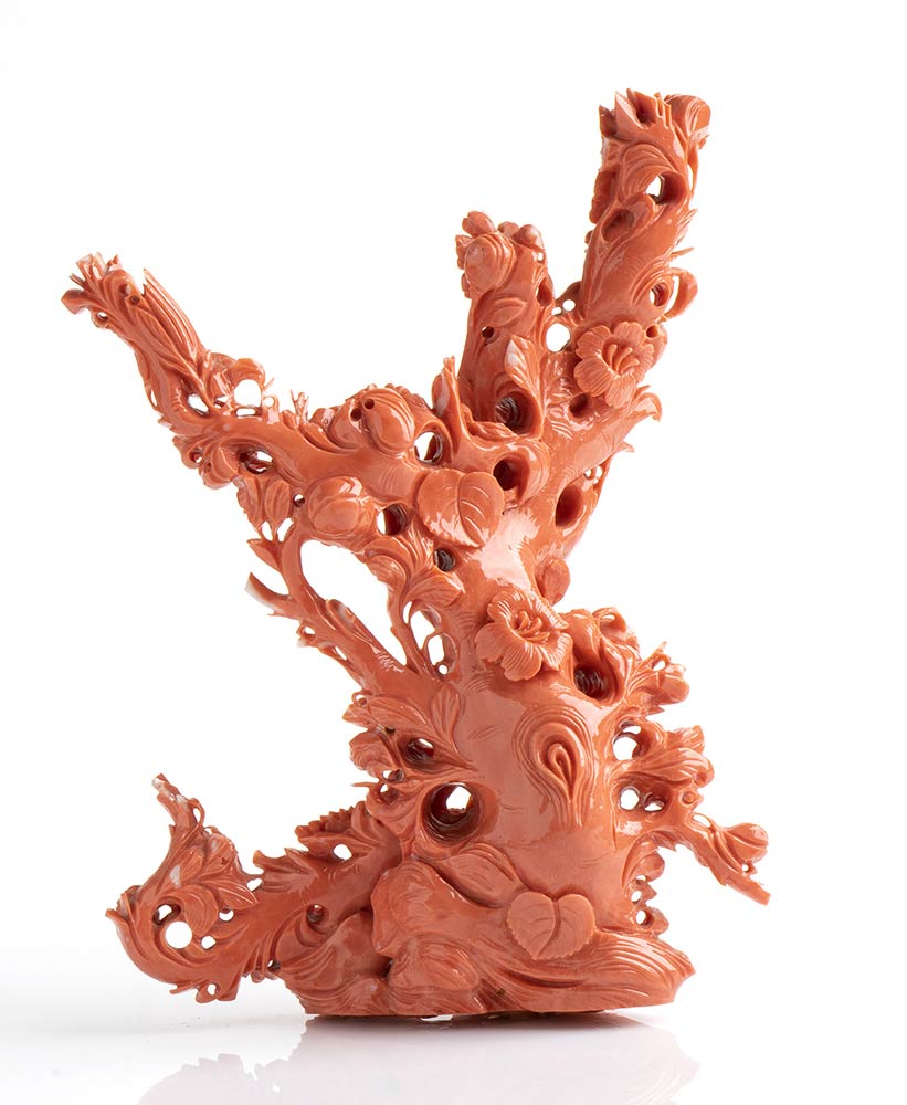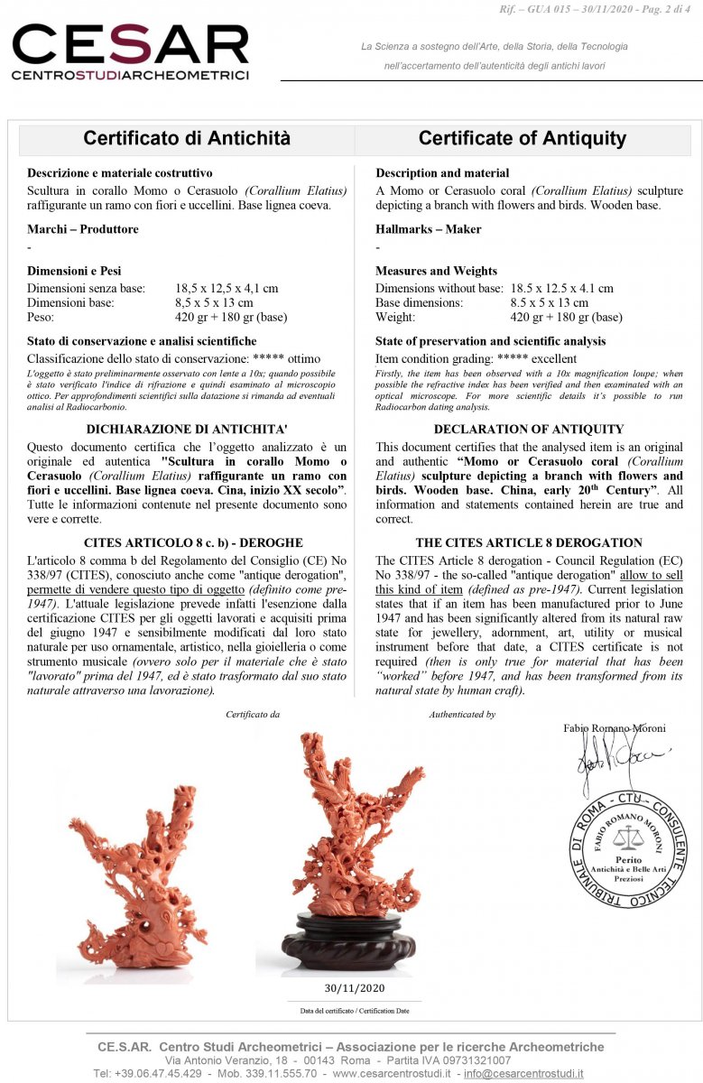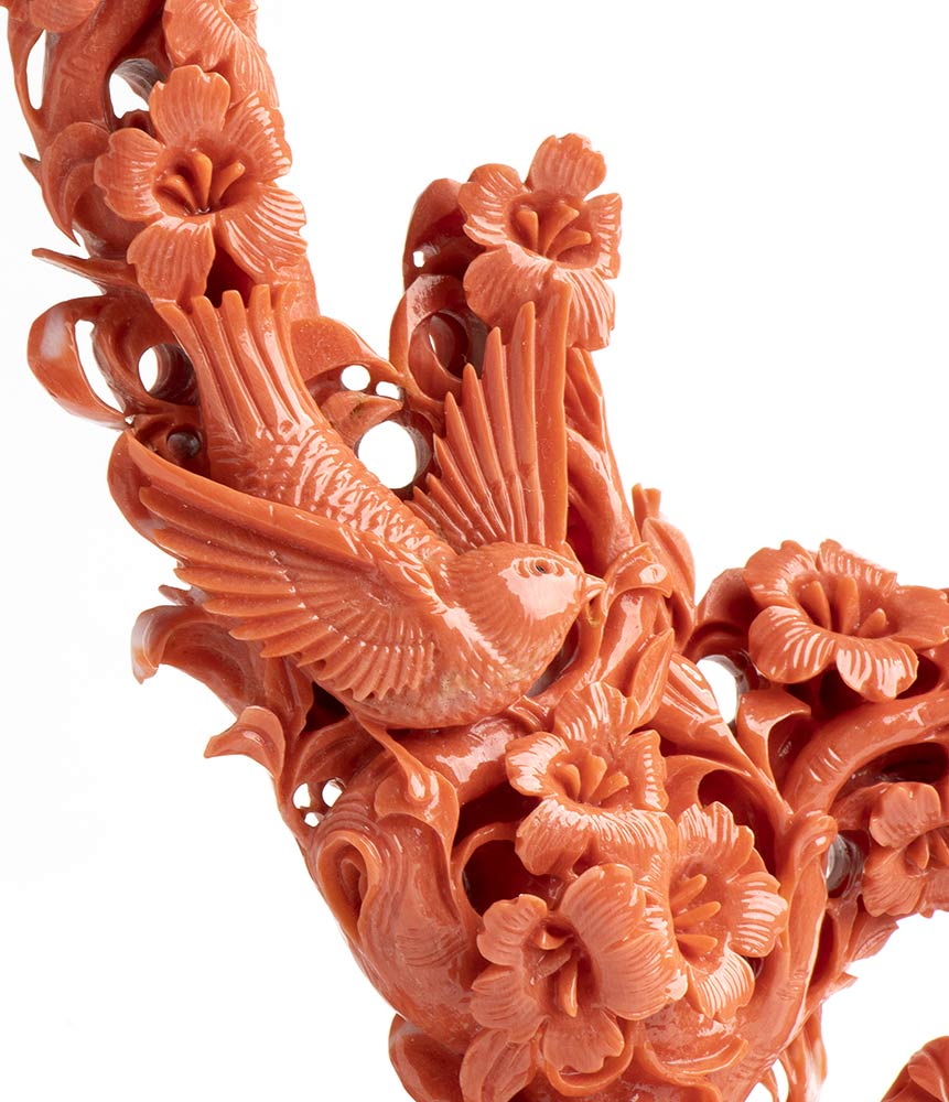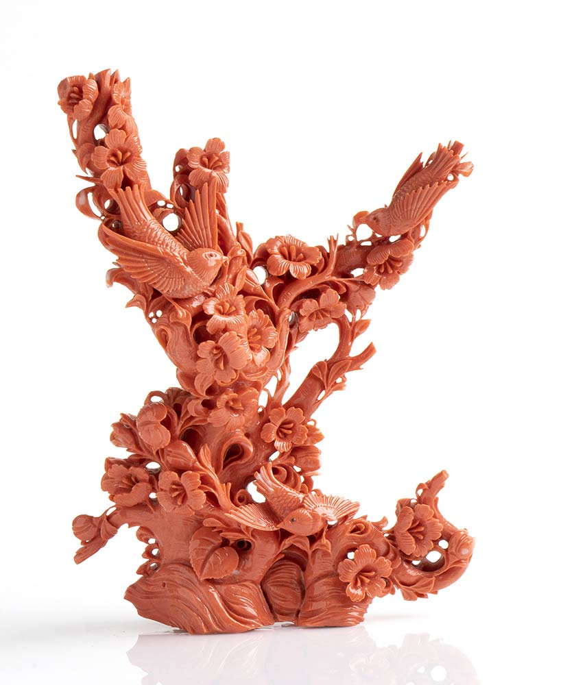 Scultura in corallo Momo o Cerasuolo (Corallium Elatius) raffigurante un ramo con fiori e uccellini. Base lignea coeva. Dimensioni senza base 12,5 x 4,1 cm, altezza 18,5 cm. Dimensioni base 8,5 x 5 x 13 cm. Peso scultura 420 gr, peso base 180 gr. Stato di conservazione: *****ottimo. Certificato di Antichità Ce.S.Ar.