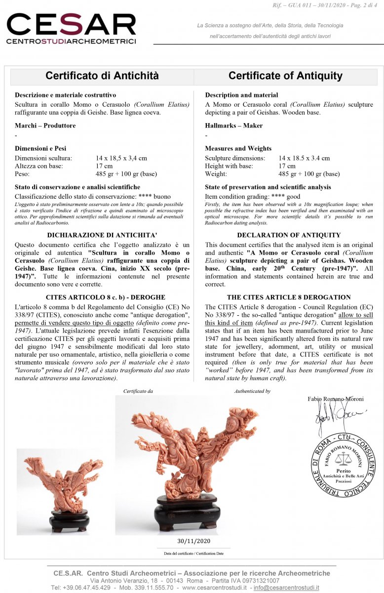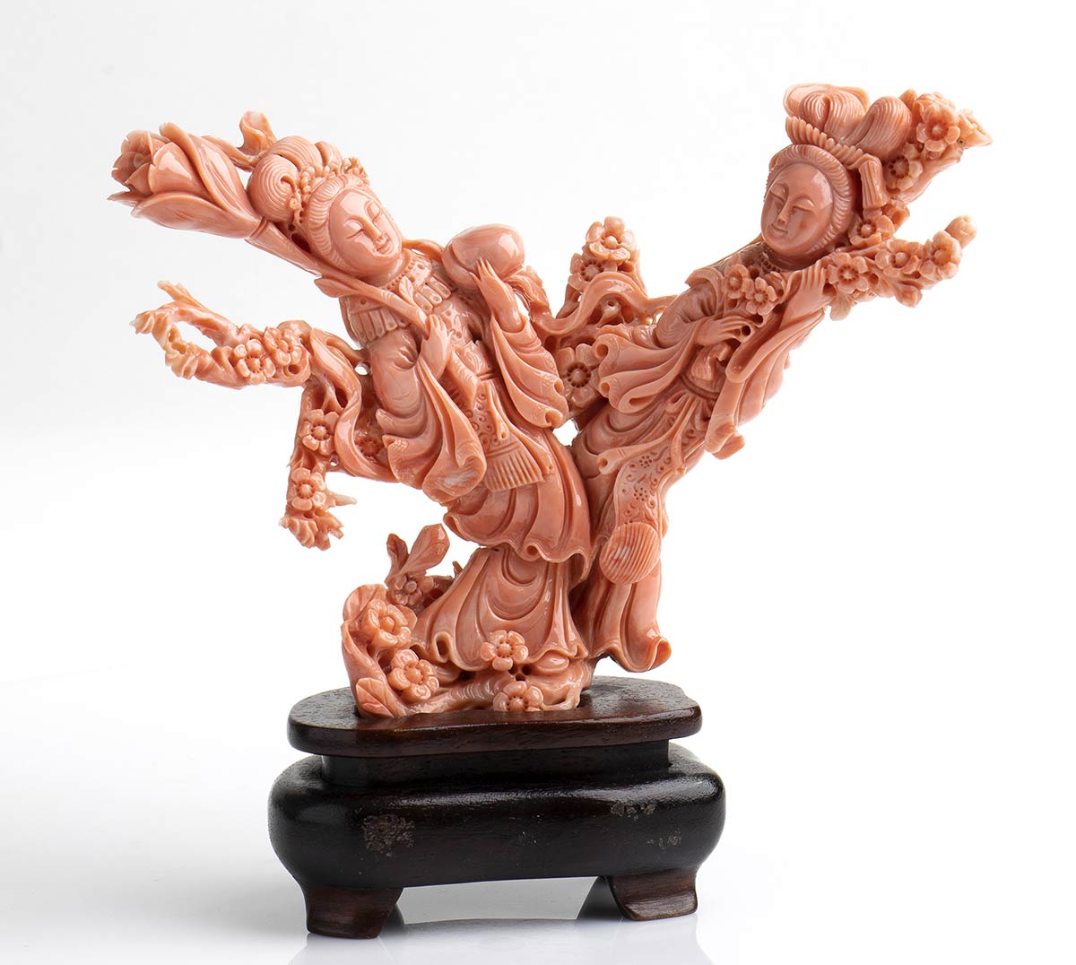 Scultura in corallo Momo o Cerasuolo (Corallium Elatius) raffigurante una coppia di Geishe. Base lignea coeva. Dimensioni senza base 18,5 x 3,4 cm, altezza 14 cm, altezza con base 17 cm. Peso scultura 485 gr, peso base 100 gr. Stato di conservazione: *****ottimo. Certificato di Antichità Ce.S.Ar.