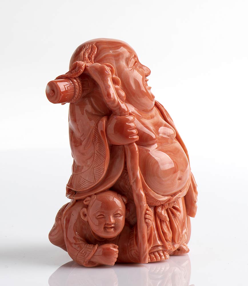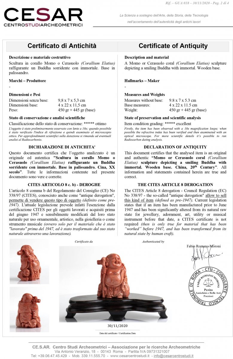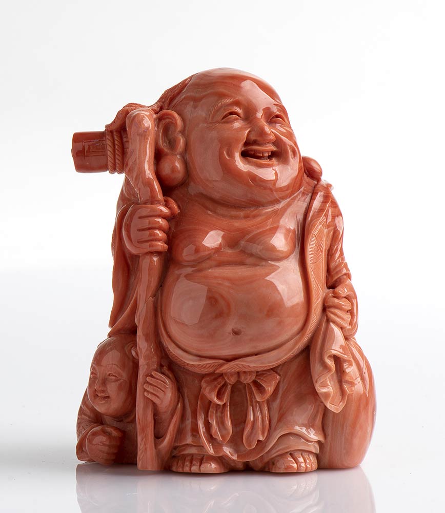 Scultura in corallo Momo o Cerasuolo (Corallium Elatius) raffigurante un Buddha sorridente con immortale. Base in palissandro. Dimensioni senza base 7 x 5,3 cm, altezza 9,8 cm. Dimensioni base 4 x 22 x 11,5 cm. Peso scultura 450 gr, peso base 445 gr. Stato di conservazione: *****ottimo.
