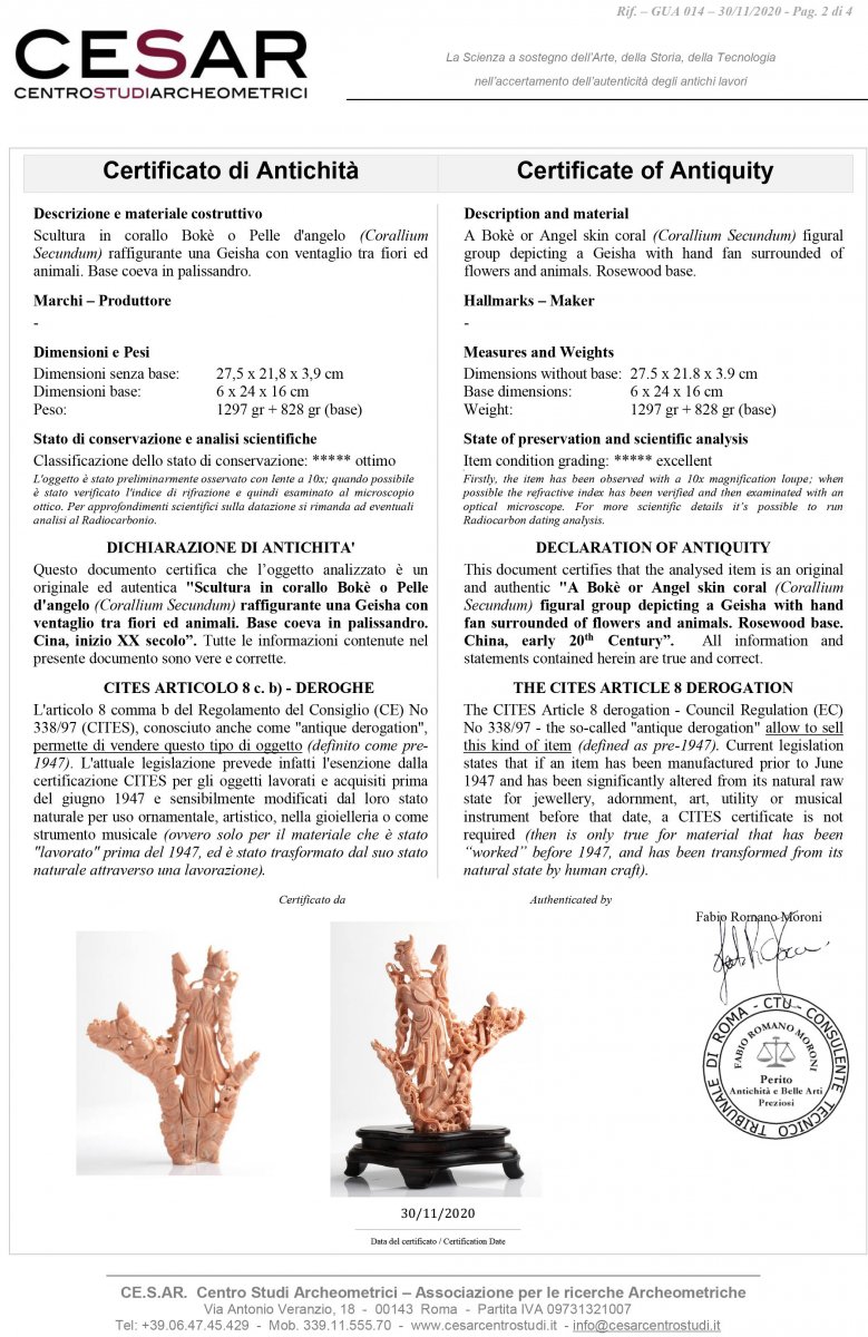 Scultura in corallo Bokè o Pelle d'angelo (Corallium Secundum) raffigurante una Geisha con ventaglio tra fiori ed animali. Base coeva in palissandro. Dimensioni senza base 21,8 x 39 cm, altezza 27,5 cm. Dimensioni base 6 x 24 x 16 cm. Peso scultura 1297 gr, peso base 828 gr. Stato di conservazione: *****ottimo. Certificato di Antichità Ce.S.Ar.