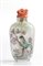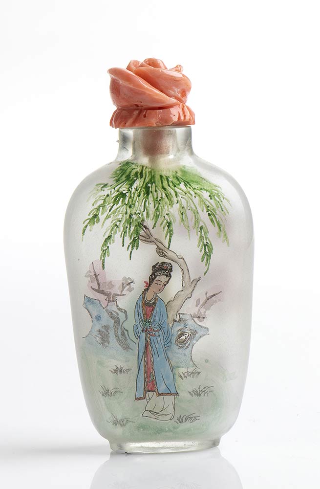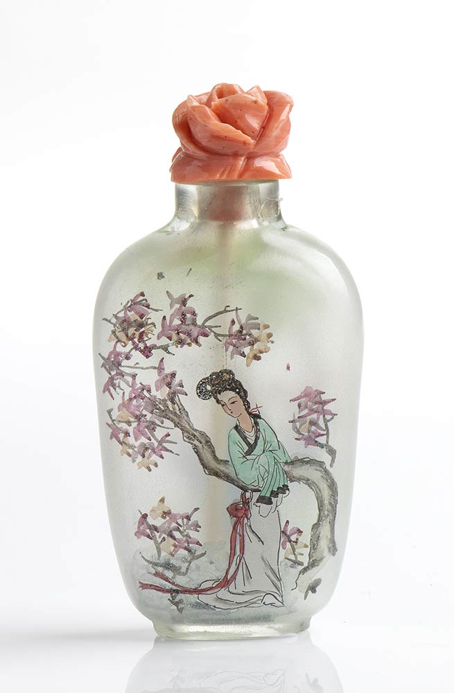 Snuff bottle cinese in vetro dipinto con tappo in corallo Momo o Cerasuolo (Corallium Elatius). Manifattura Guarracino, Torre del Greco. Dimensioni 4,4 x 1,8 cm, altezza 9 cm. Peso totale 44,1 gr. Stato di conservazione: *****ottimo.