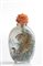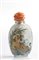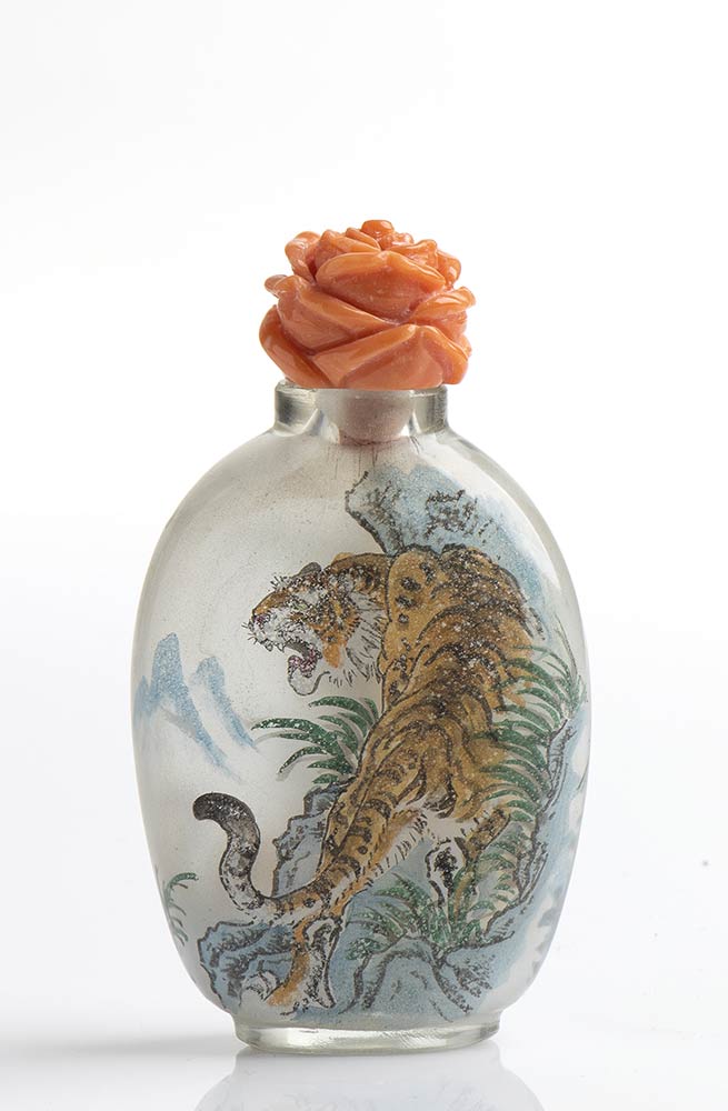 Snuff bottle cinese in vetro dipinto con tappo in corallo Momo o Cerasuolo (Corallium Elatius). Manifattura Guarracino, Torre del Greco. Dimensioni 4,5 x 1,9 cm, altezza 8,2 cm. Peso totale 40,5 gr. Stato di conservazione: *****ottimo.