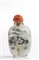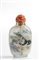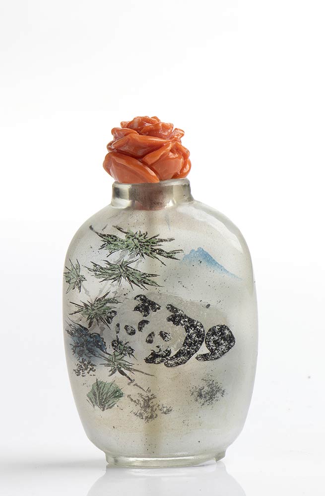 Snuff bottle cinese in vetro dipinto con tappo in corallo Momo o Cerasuolo (Corallium Elatius). Manifattura Guarracino, Torre del Greco. Dimensioni 4,3 x 1,8 cm, altezza 7,7 cm. Peso totale 35,8 gr. Stato di conservazione: *****ottimo.
