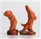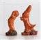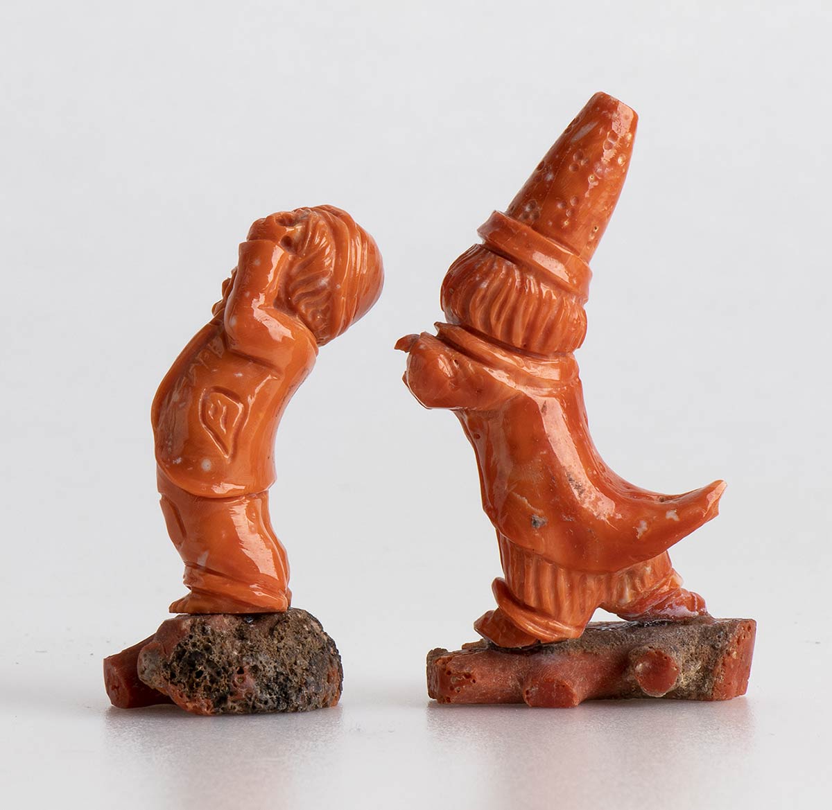 Coppia di sculture in corallo Momo o Cerasuolo (Corallium Elatius) raffiguranti due personaggi maschili. Basi in corallo grezzo. Dimensioni 8 x 4 x 3 cm e 6 x 3 x 3 cm. Peso sculture 45,28 gr e 37,06 gr. Stato di conservazione: ****buono. Certificato di Antichità Ce.S.Ar.