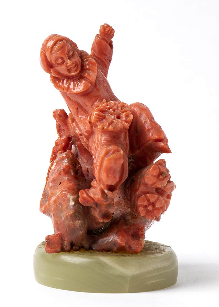 In corallo mediterraneo (Corallium Rubrum) raffigurante la figura di pulcinella posta su base in pietra. Diametro 5 cm, altezza 8,5 cm. Peso totale 195,7 gr. Stato di conservazione: ****buono.