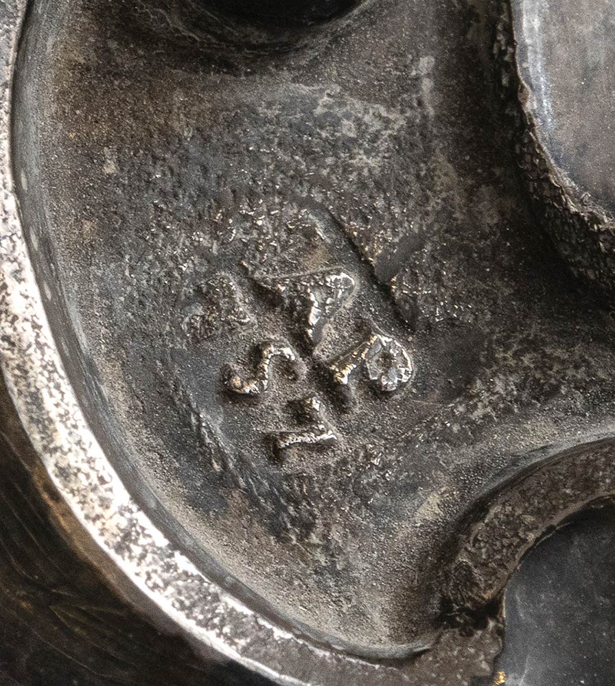 Scultura in corallo rosso Mediterraneo (Corallium Rubrum) con montatura barocca in argento punzonata con il marchio in uso alla corporazione degli Orefici di Napoli nel 1757, argentiere "FM". Dimensioni 22,5 x 20 cm. Peso complessivo 385 gr. Stato di conservazione: ****buono (difetti).