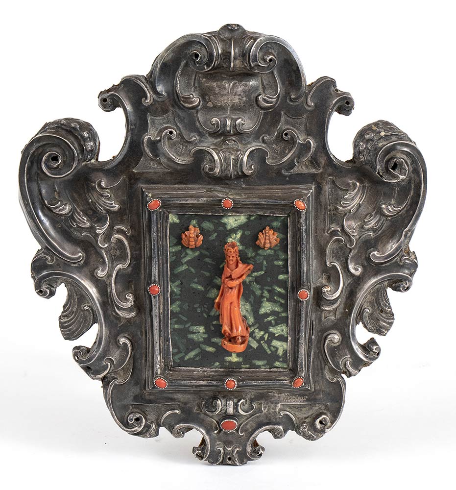 Scultura italiana in corallo Mediterraneo con cornice in argento - Napoli, 1757