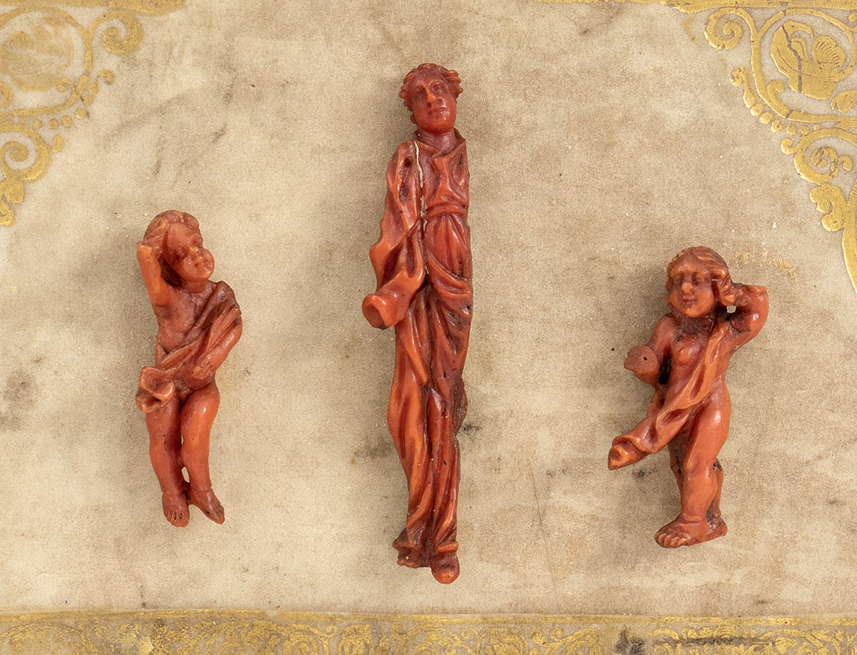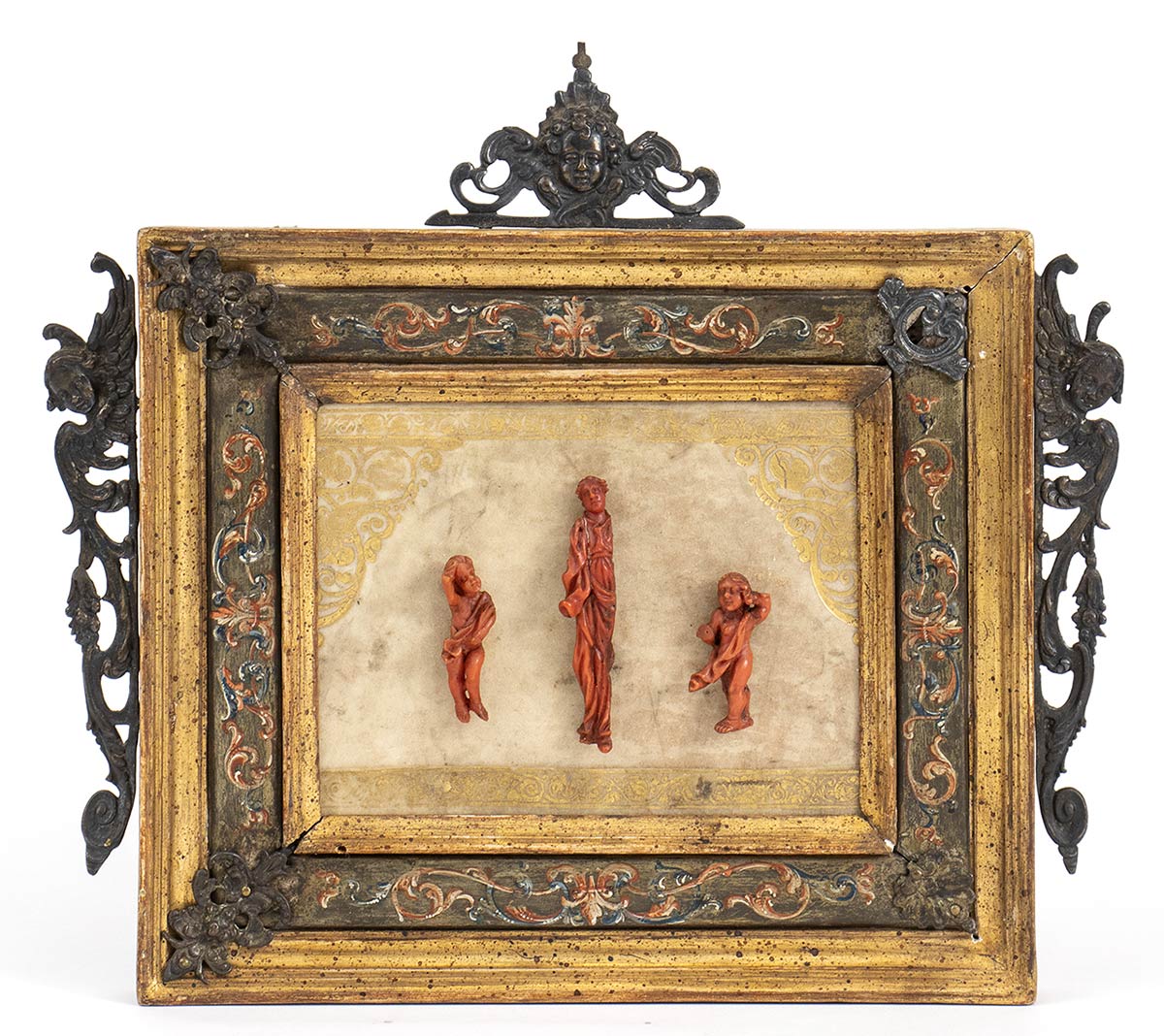 Sculture italiane in corallo Mediterraneo con cornice in metallo - probabilmente Napoli, XVIII secolo